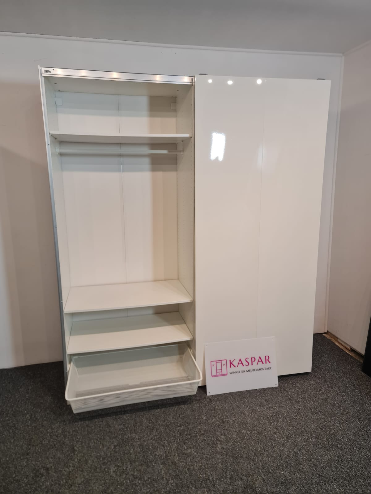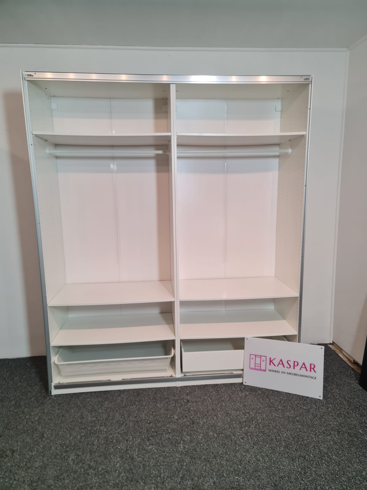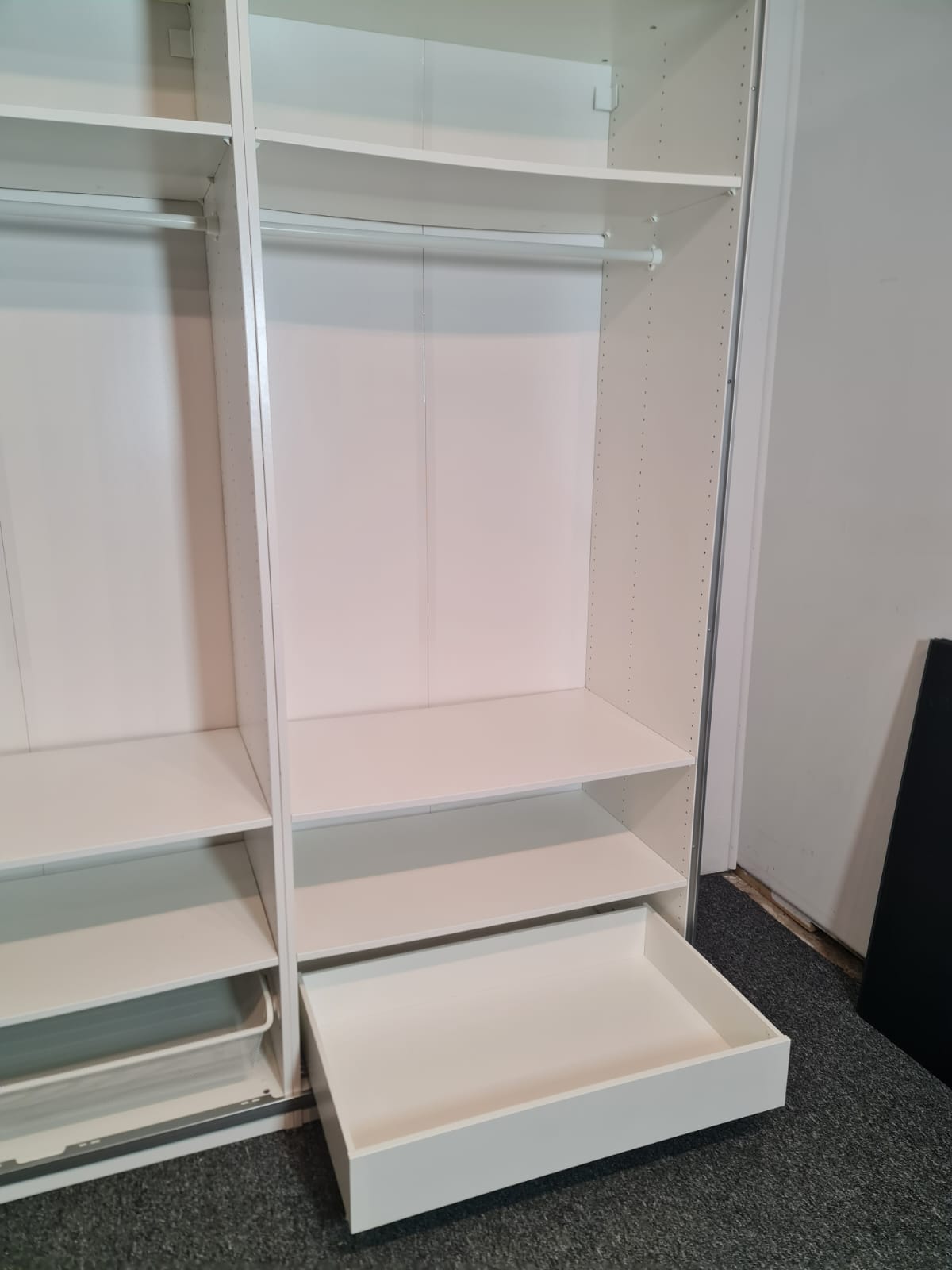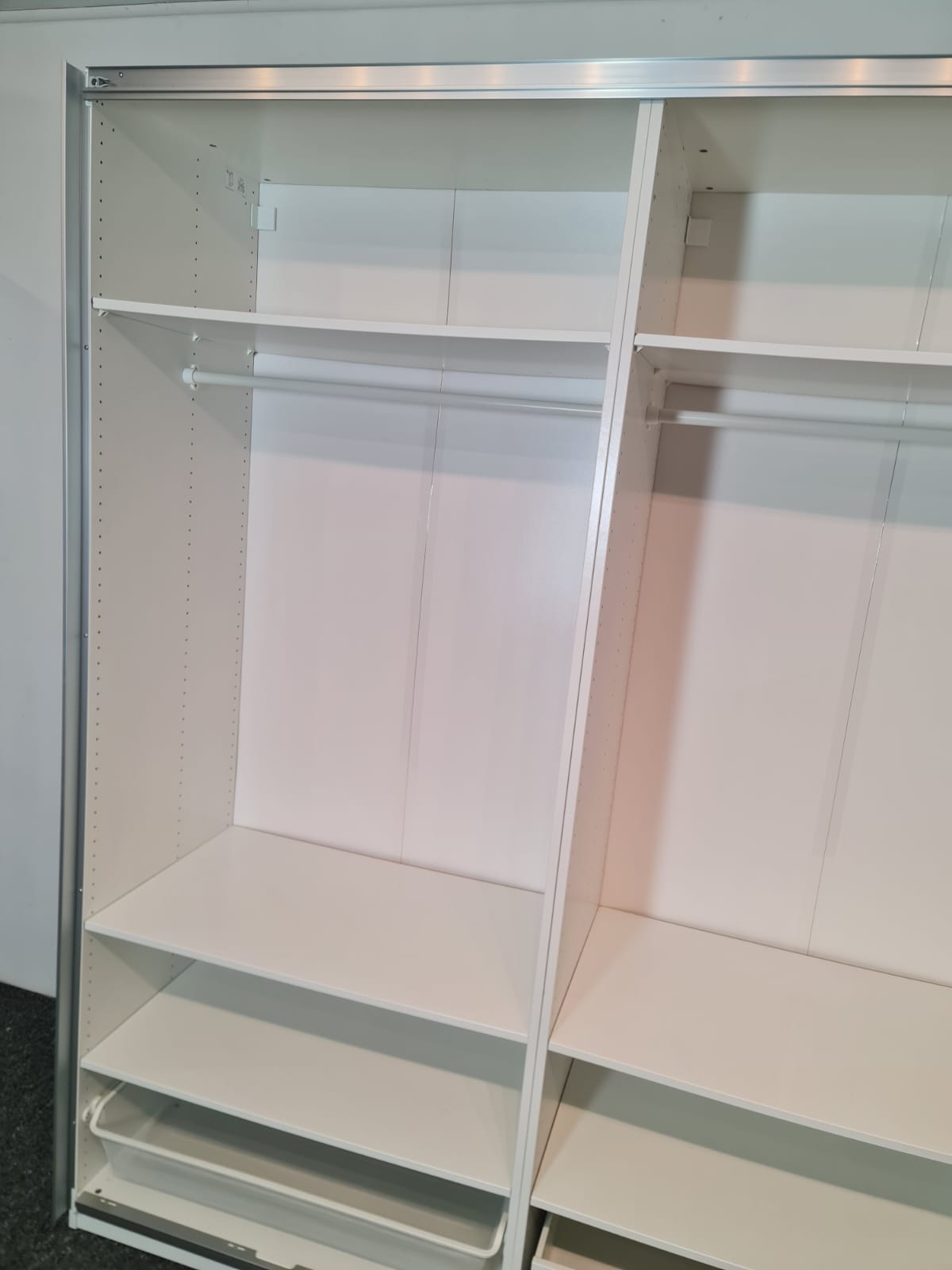 Szafa z popularnej i lubianej serii mebli ikea pax. Wymiary: 2.00m szeroka, 236cm wysoka, 60cm głęboka. Drzwi z płyty meblowej, białe – wysoki połysk. Szafa ma dużo półek, drążki na wieszaki, dużą szufladę i wysuwany koszyk. Szafa jest w bardzo dobrym stanie, została fachowo zdemontowana, bez uszkodzeń i jest kompletna we wszystkie elementy.