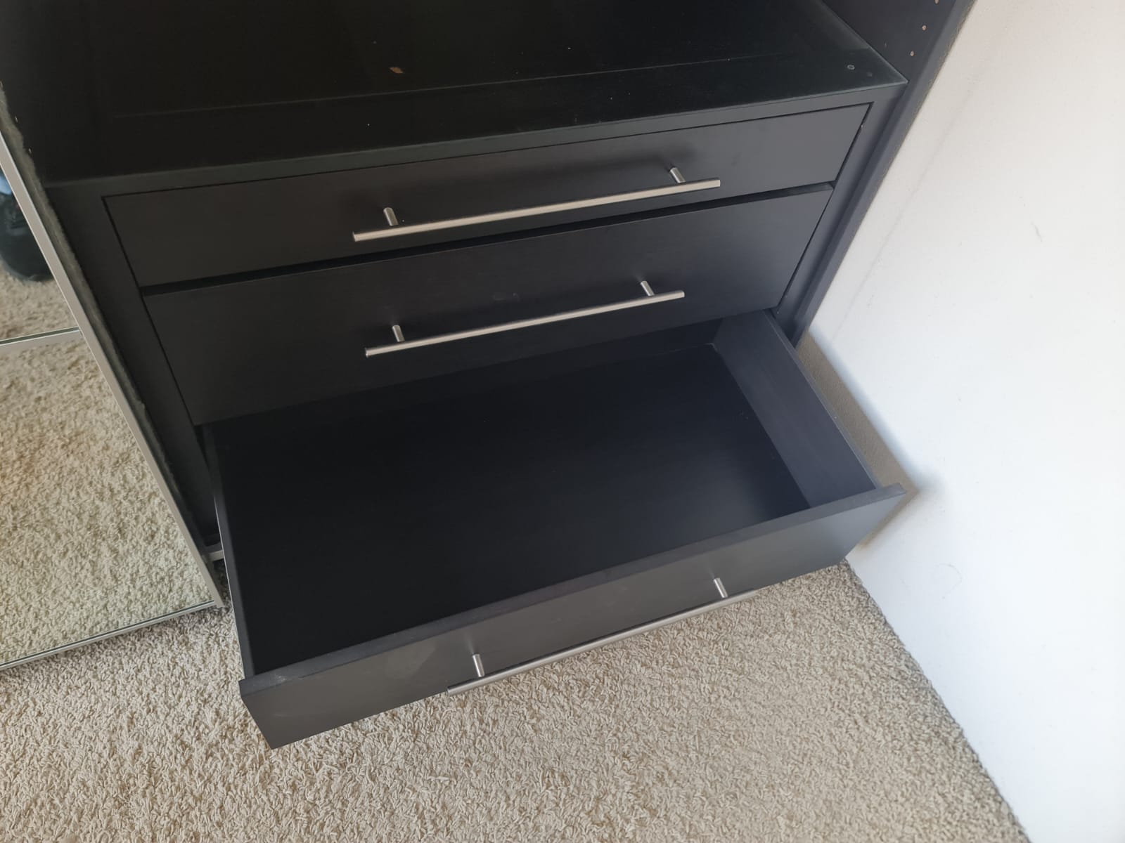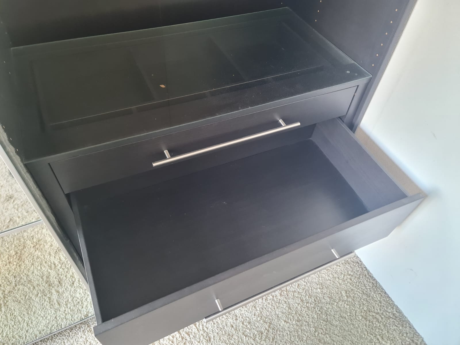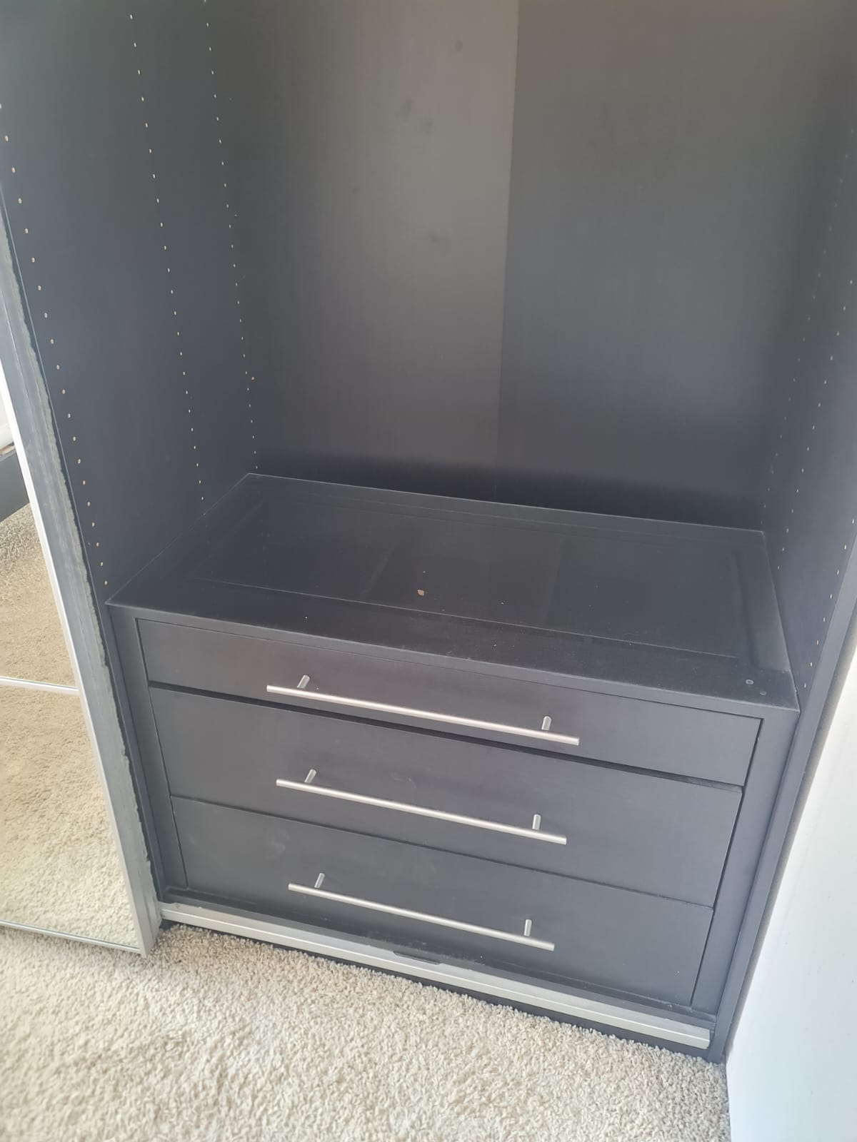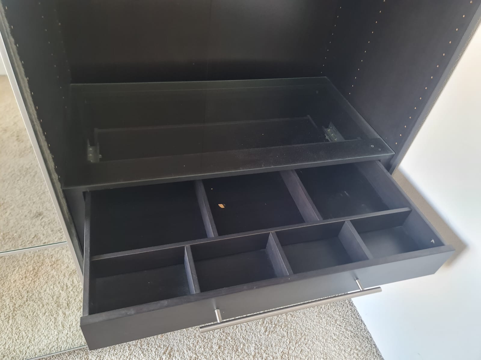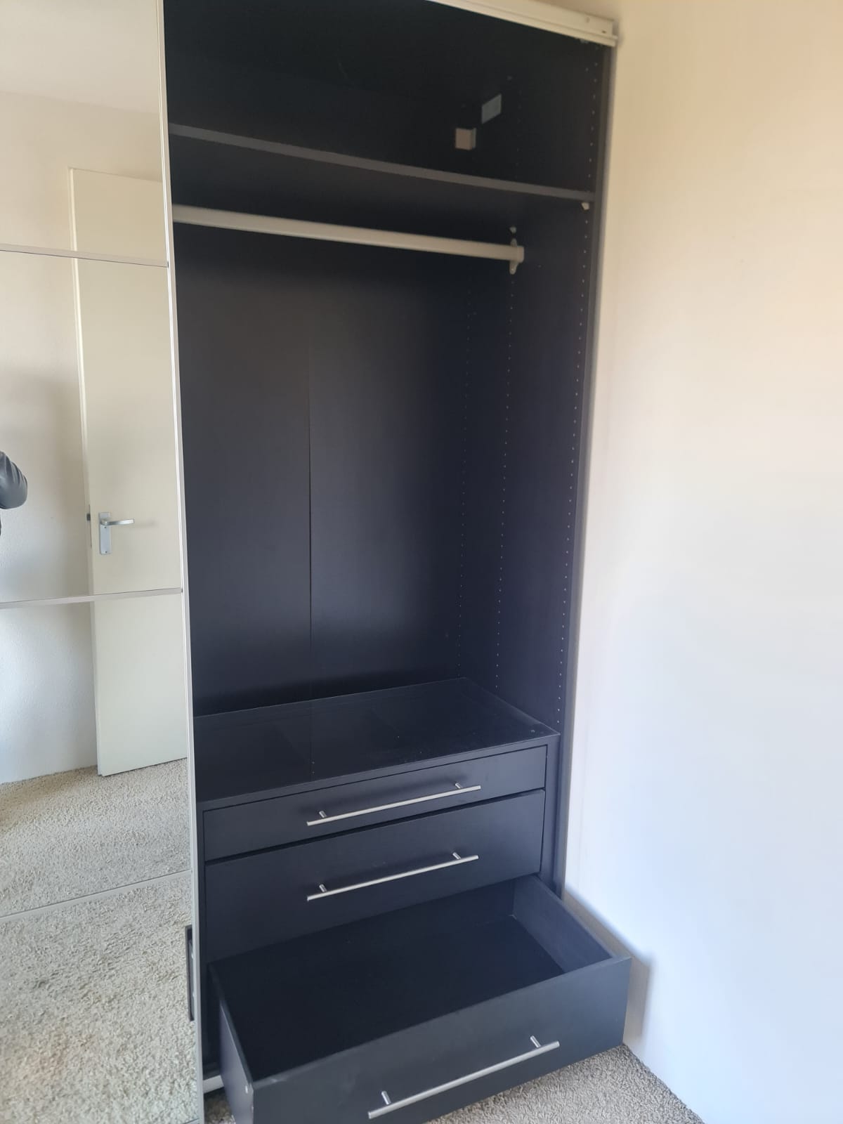 Szafa z popularnej i lubianej serii mebli ikea pax. Wymiary: 2.00m szeroka, 236cm wysoka, 60cm głęboka. Piękne drzwi lustrzane. Szafa w kolorze wenge – bardzo ciemny brązowy. W środku ma dużo komponentów, półki, drążki na wieszaki, mniejsze i większe szuflady. Szafa jest w bardzo dobrym stanie, została fachowo zdemontowana, bez uszkodzeń i jest kompletna we wszystkie elementy.