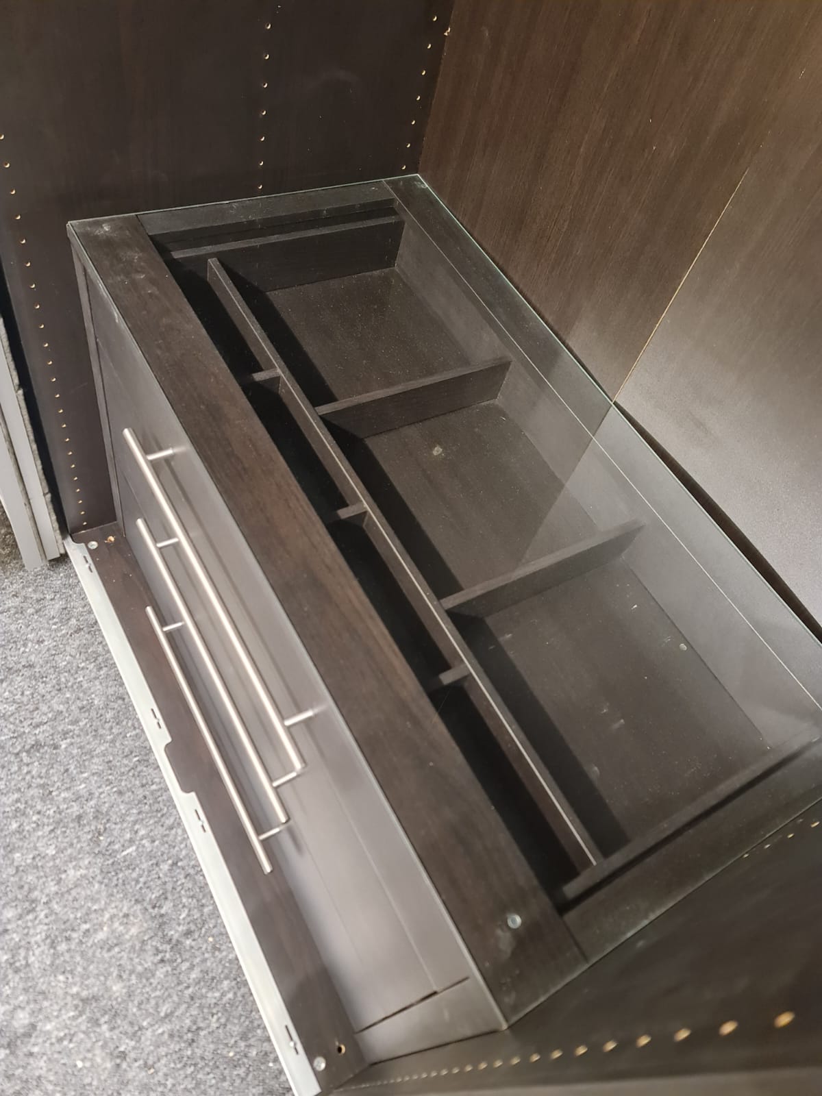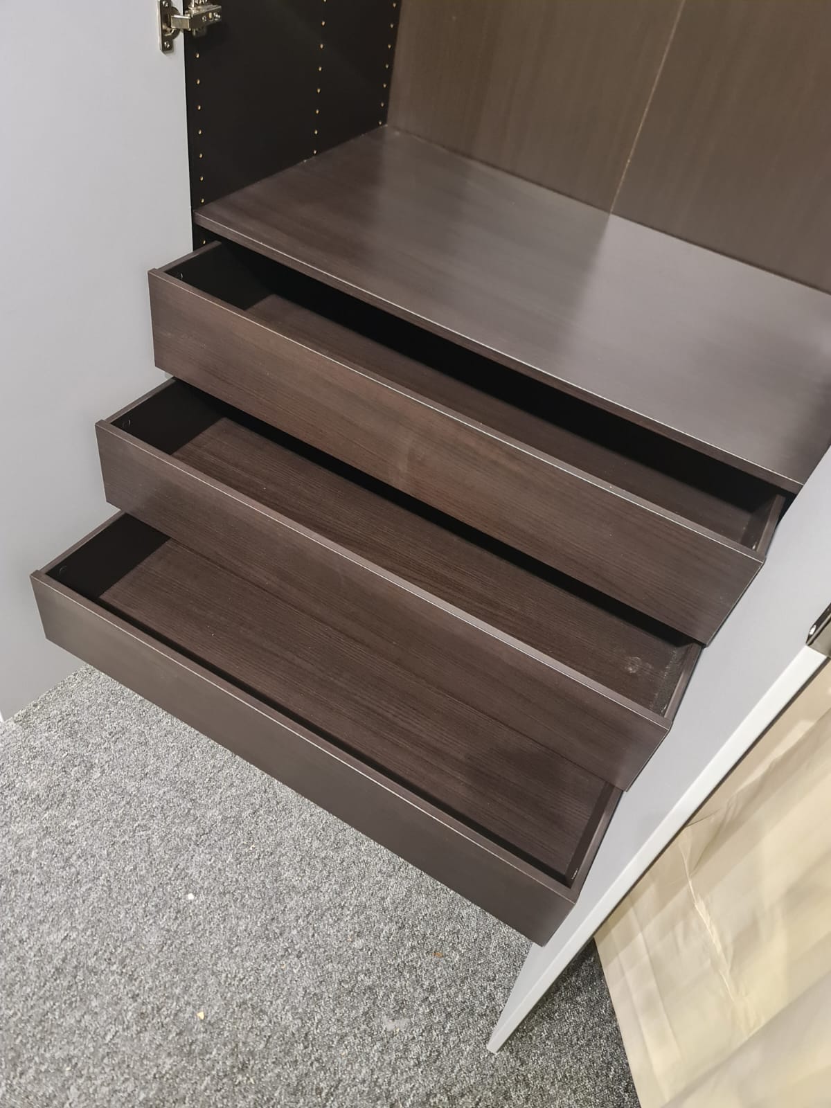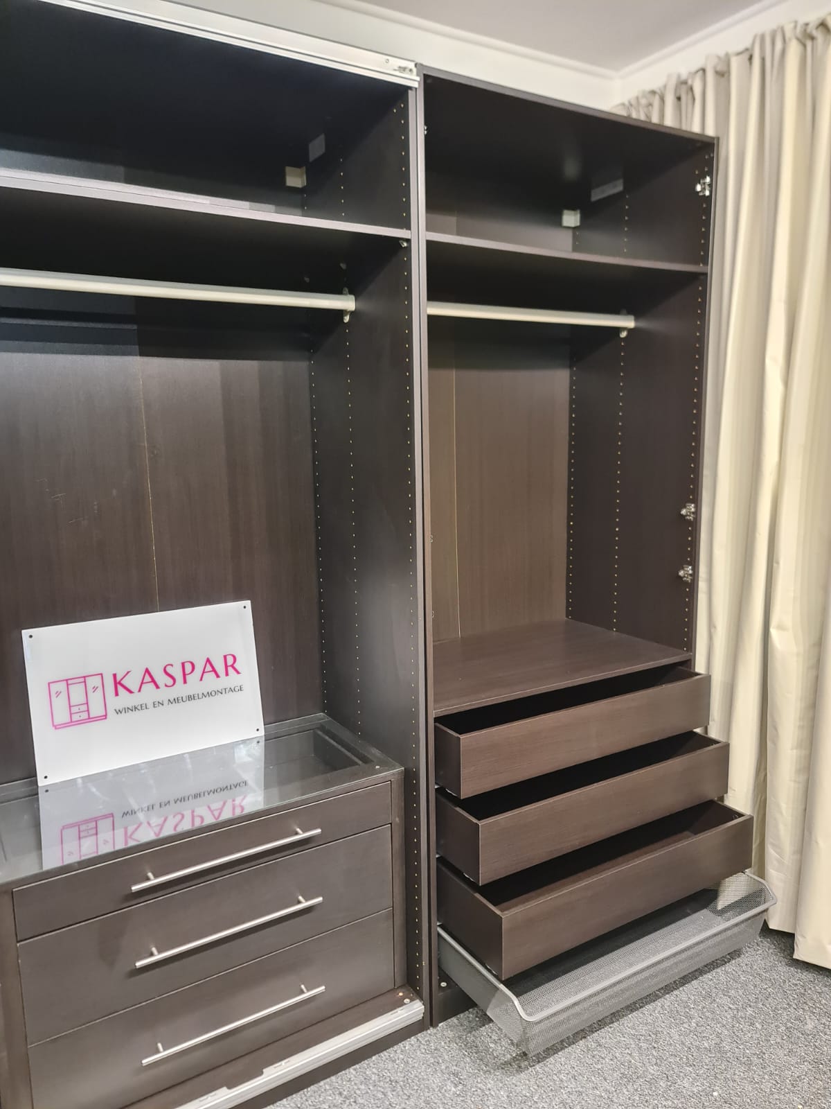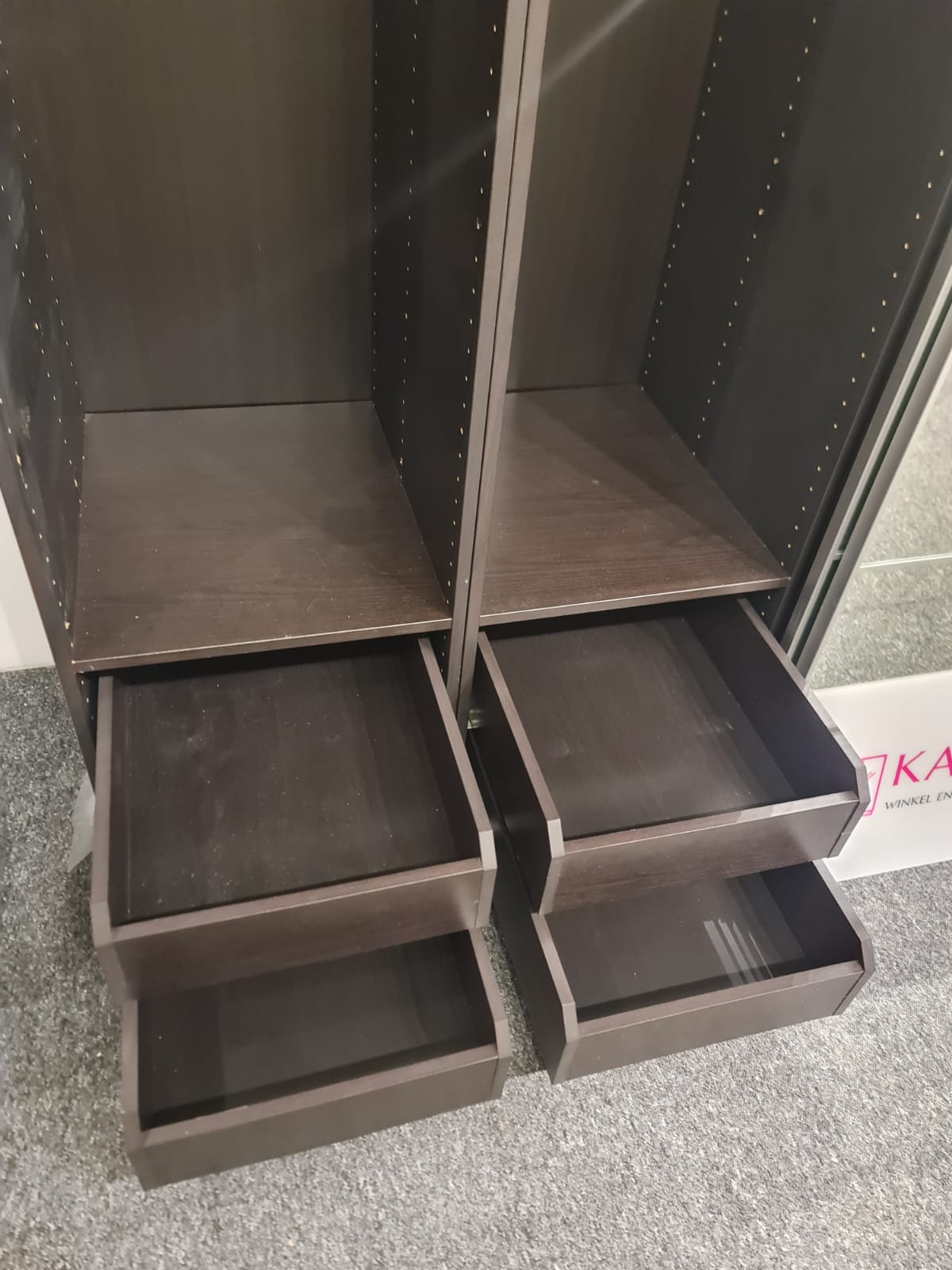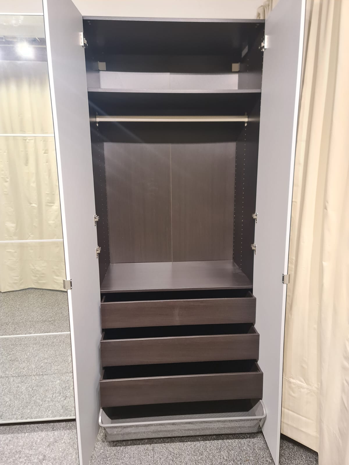 Szafa z serii mebli ikea pax. Wymiary: 300cm szeroka, 236cm wysoka, 60cm głęboka. Szafa w kolorze wenge (bardzo ciemny brązowy). Dwoje drzwi przesuwnych i dwoje drzwi otwieranych. Wszystkie drzwi z lustrem. W środku bardzo dużo szuflad, półki i drążki na wieszaki. Stan szafy jest bardzo dobry. Umiejętnie zdemontowana, bez uszkodzeń i kompletna we wszystkie elementy.