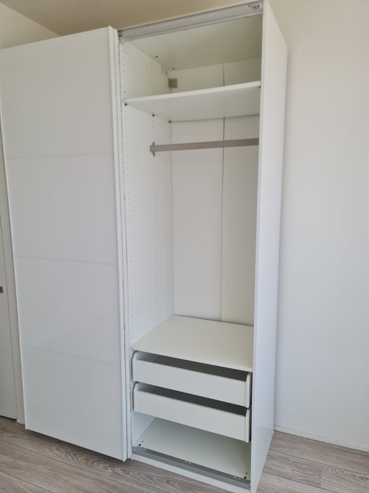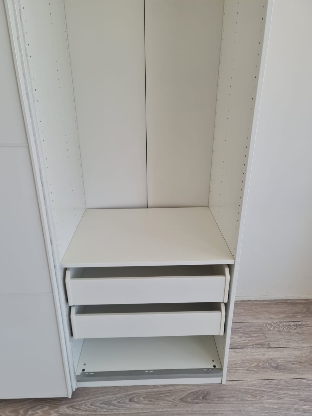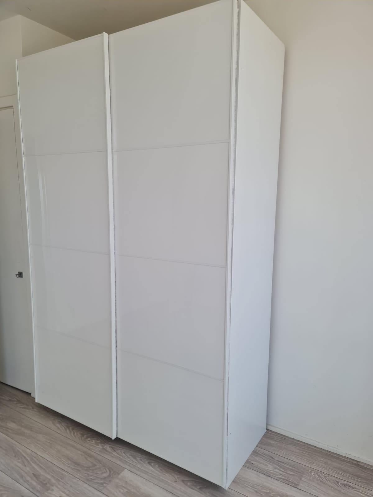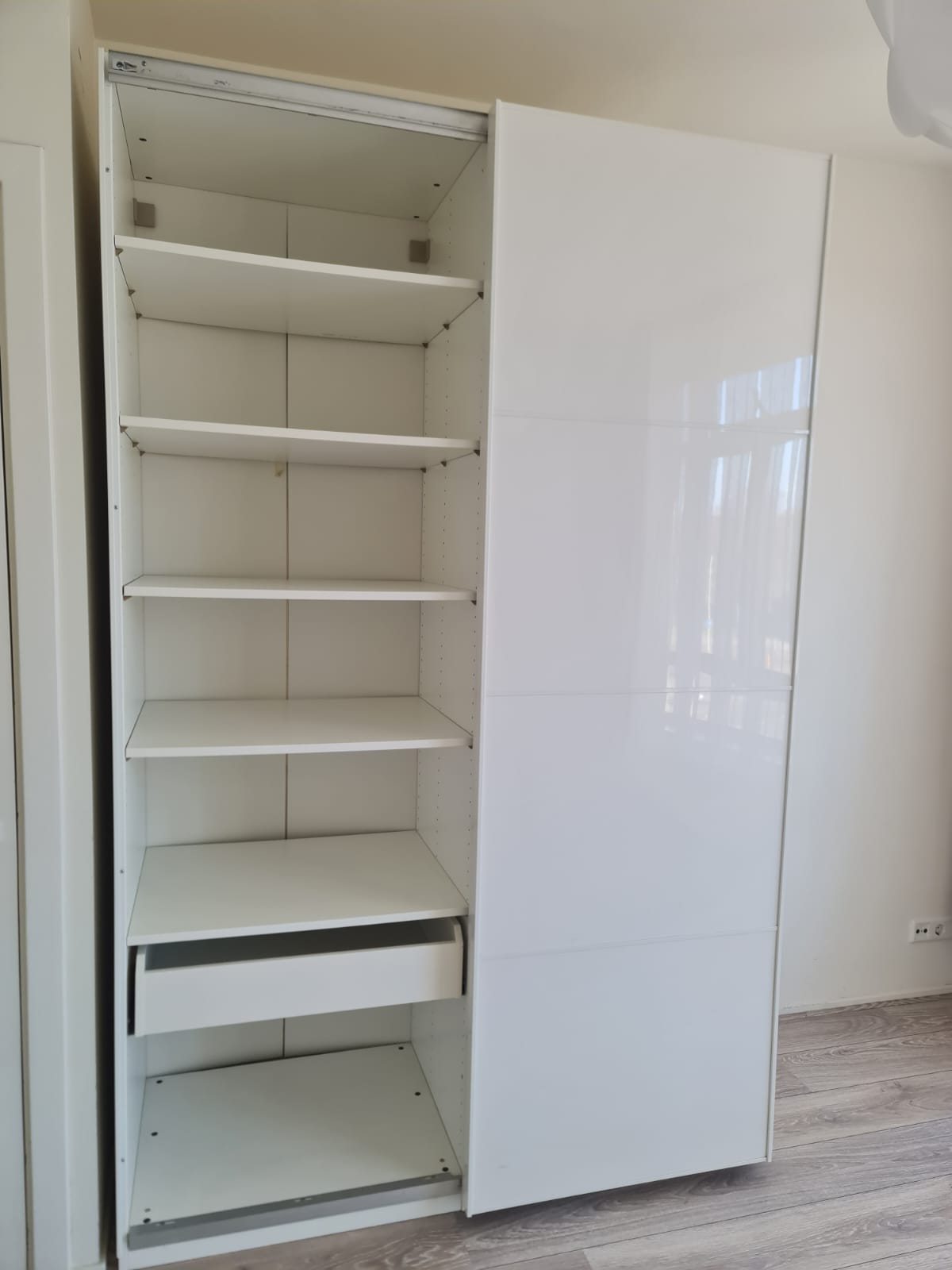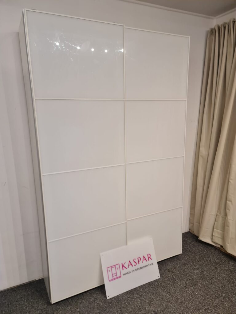 Szafa z serii mebli ikea pax. Wymiary: 150cm szeroka, 236cm wysoka, 60cm głęboka. Dwoje drzwi przesuwnych (białe pleksi, połysk).W środku dużo półek , 3 duże szuflady i drążek na wieszaki. Układ komponentów wewnątrz szafy można dowolnie inaczej rozplanować. Stan szafy jest bardzo dobry. Umiejętnie zdemontowana, bez uszkodzeń i kompletna we wszystkie elementy.