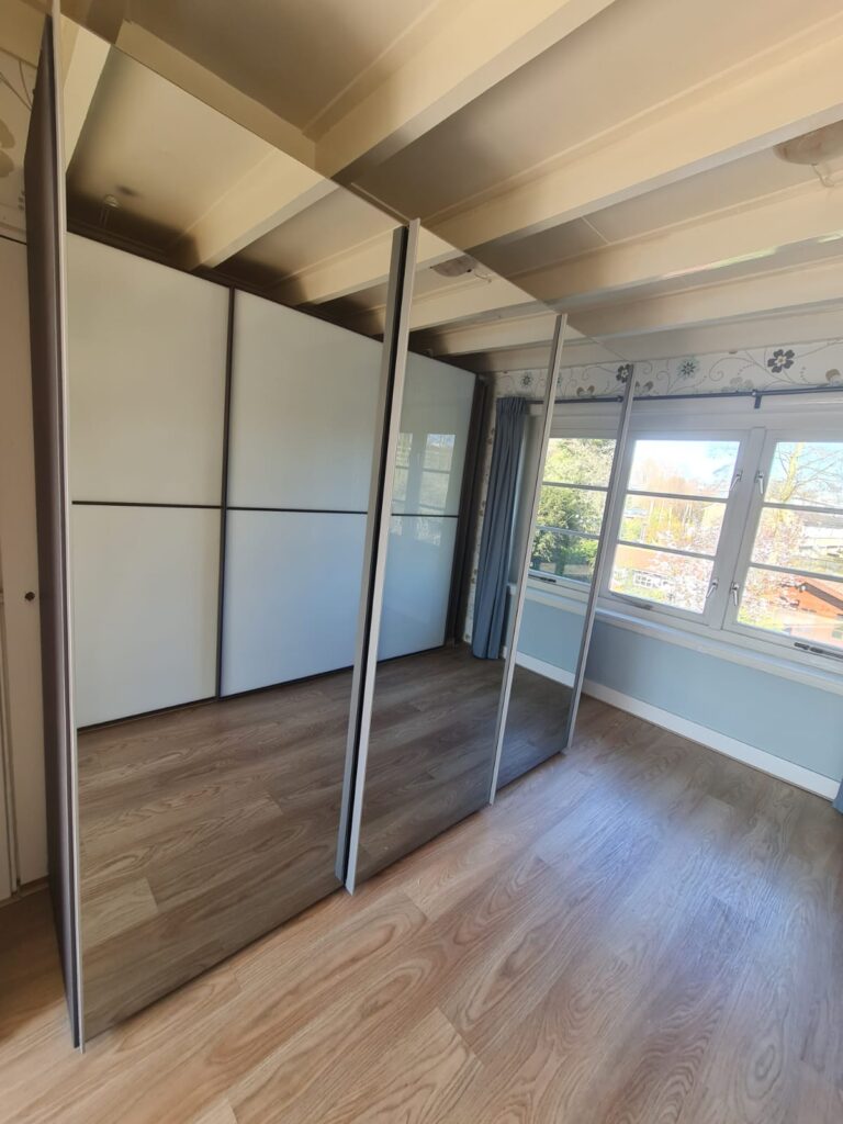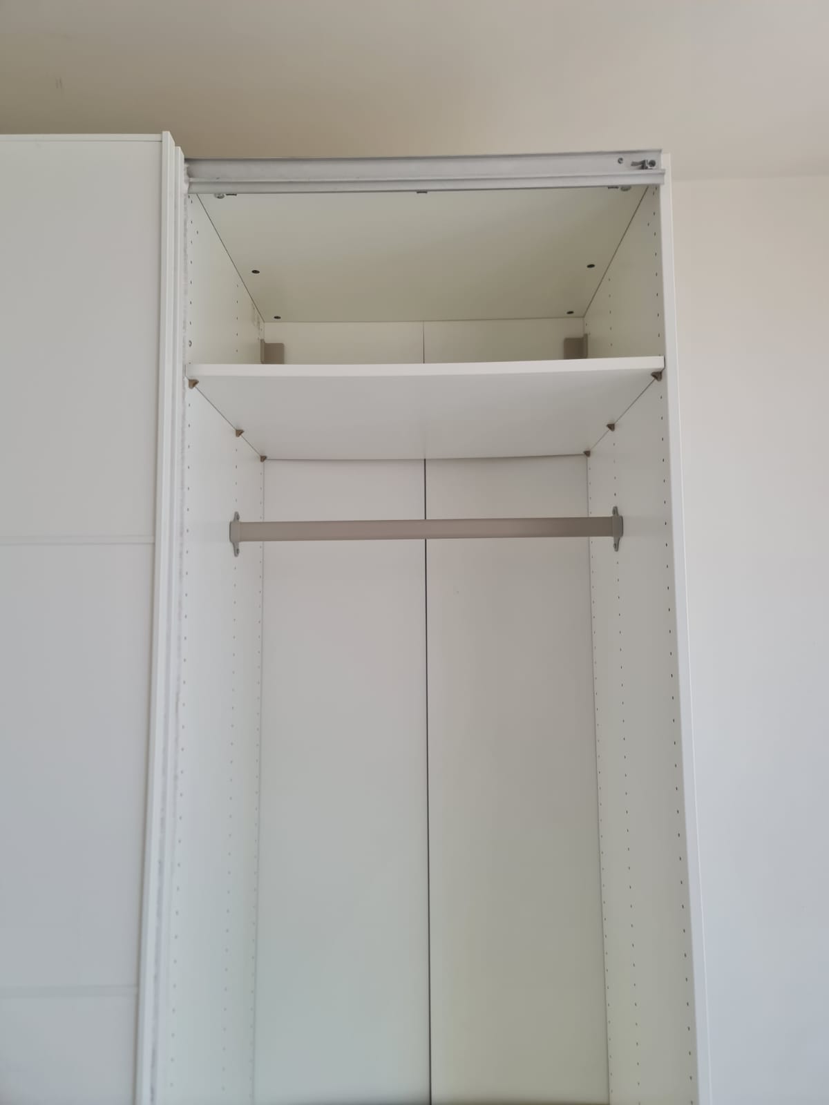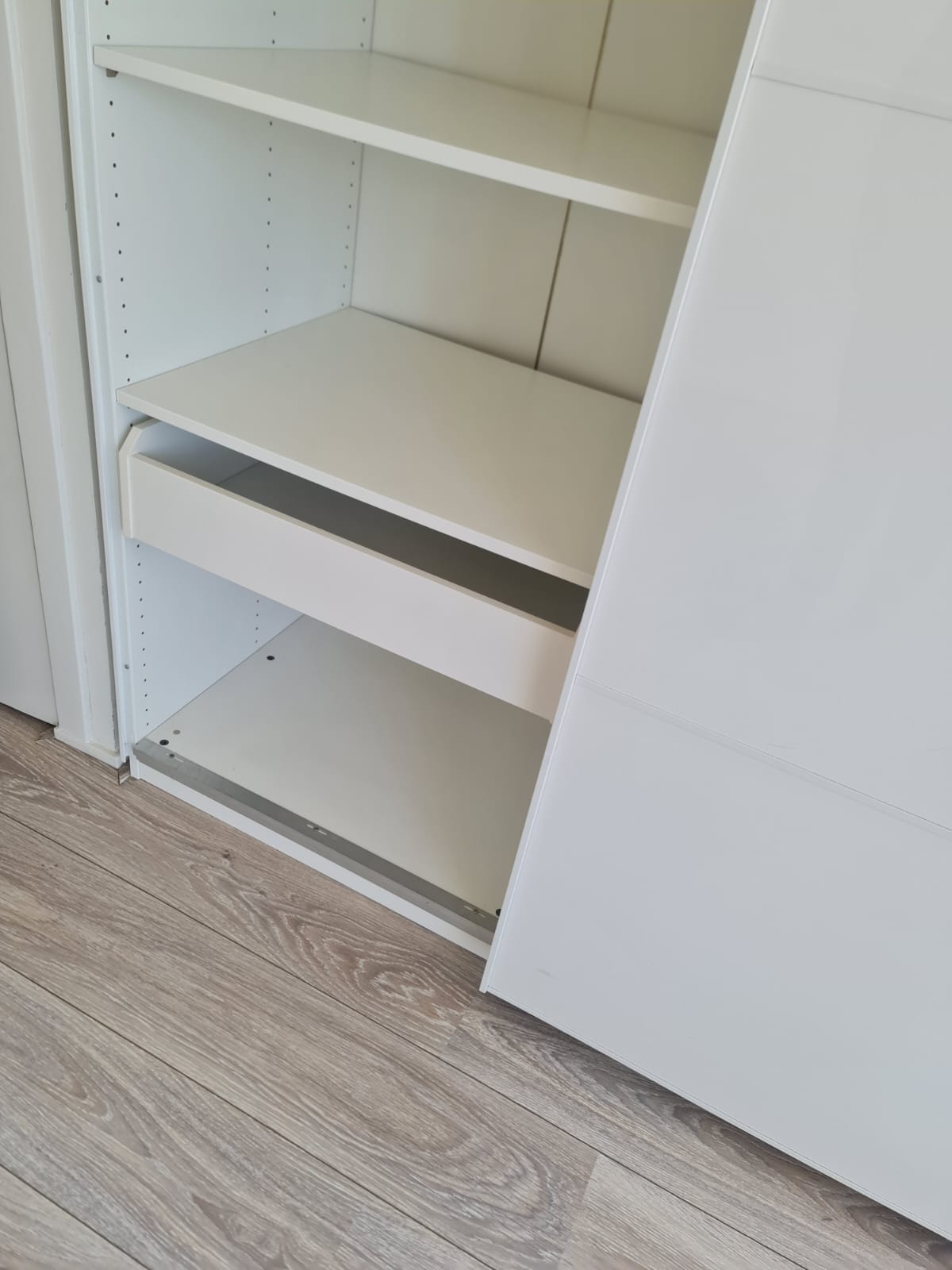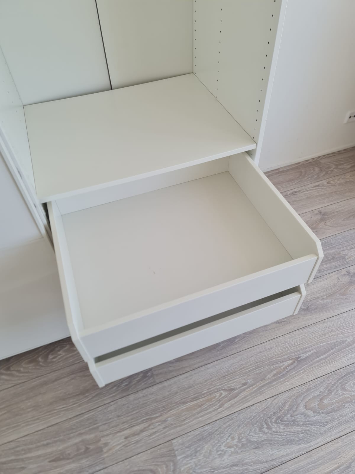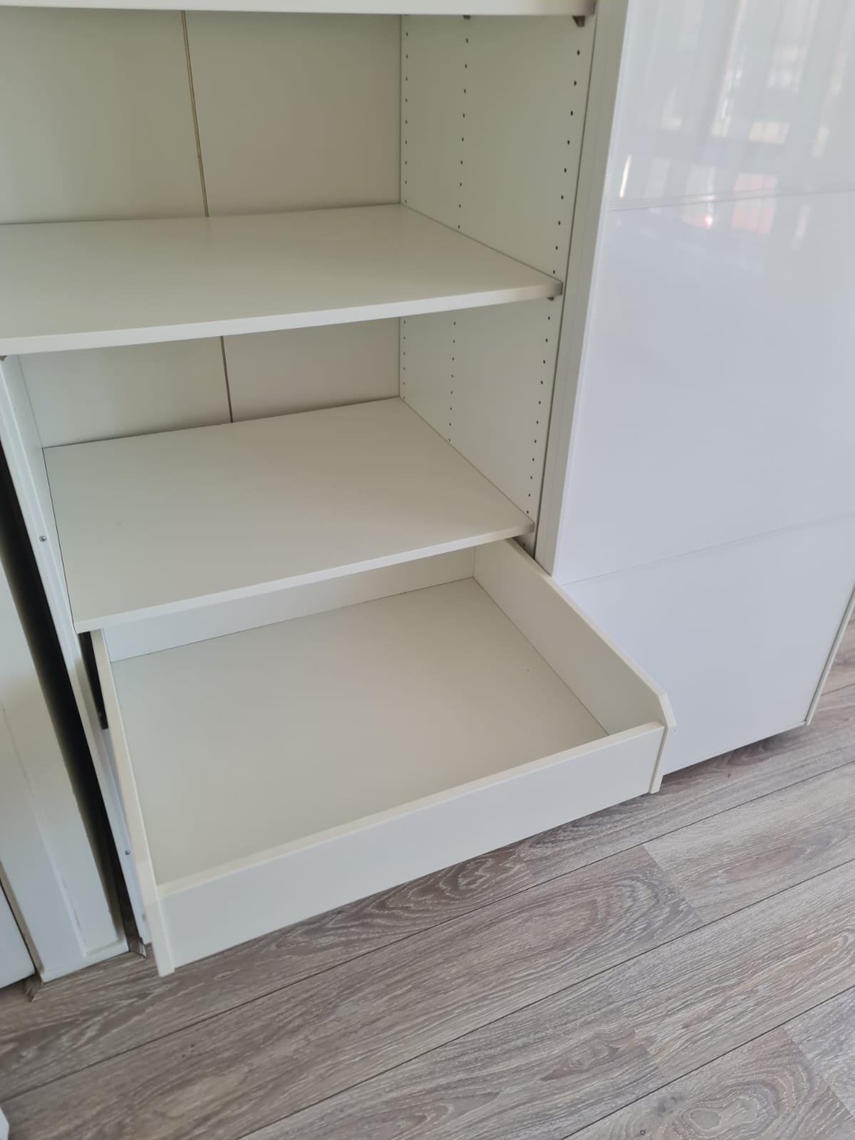 Szafa z serii mebli ikea pax. Wymiary: 150cm szeroka, 236cm wysoka, 60cm głęboka. Dwoje drzwi przesuwnych (białe pleksi, połysk).W środku dużo półek , 3 duże szuflady i drążek na wieszaki. Układ komponentów wewnątrz szafy można dowolnie inaczej rozplanować. Stan szafy jest bardzo dobry. Umiejętnie zdemontowana, bez uszkodzeń i kompletna we wszystkie elementy.