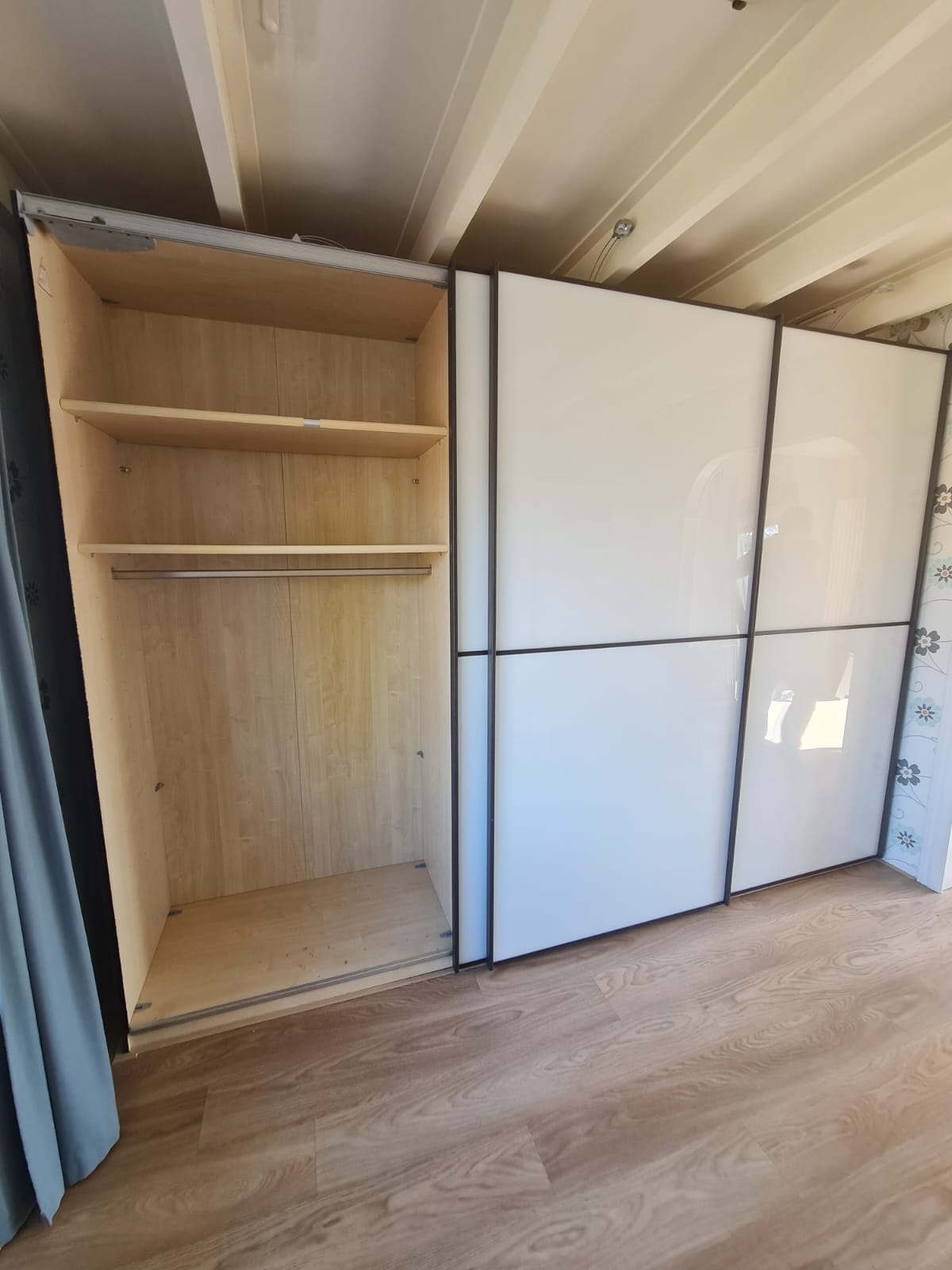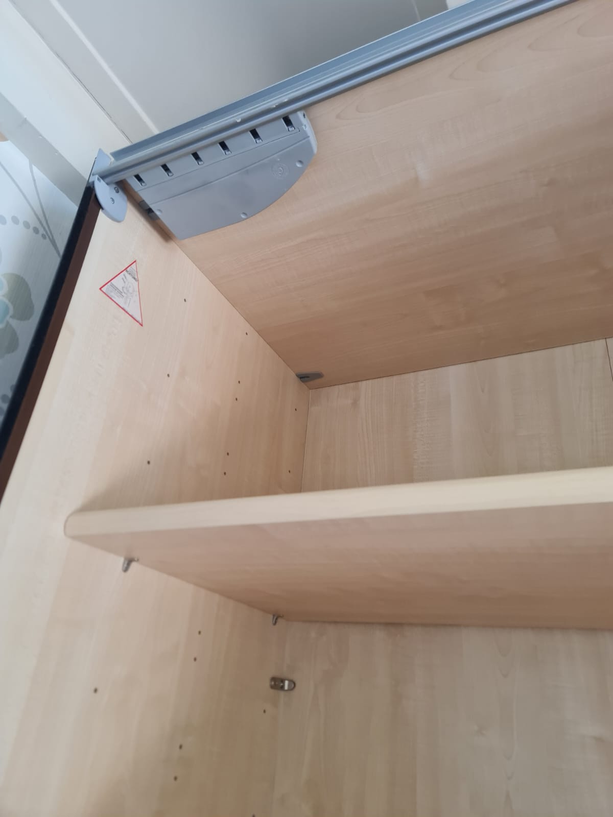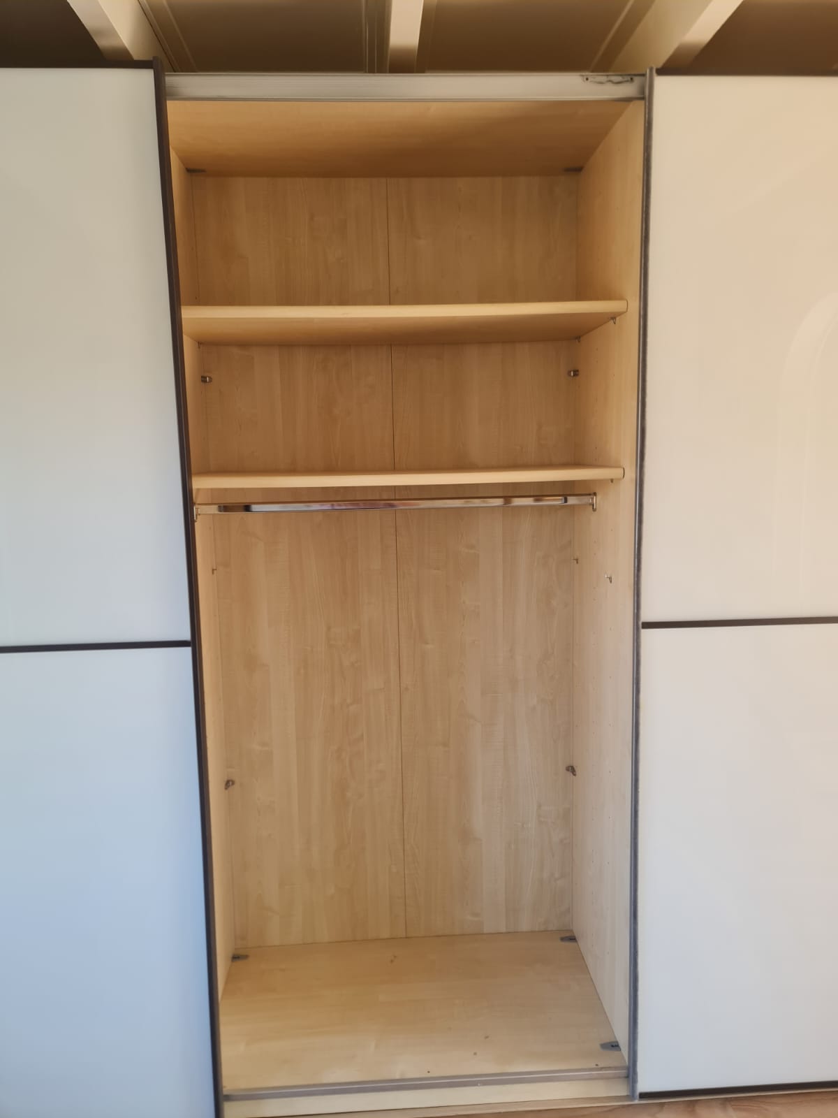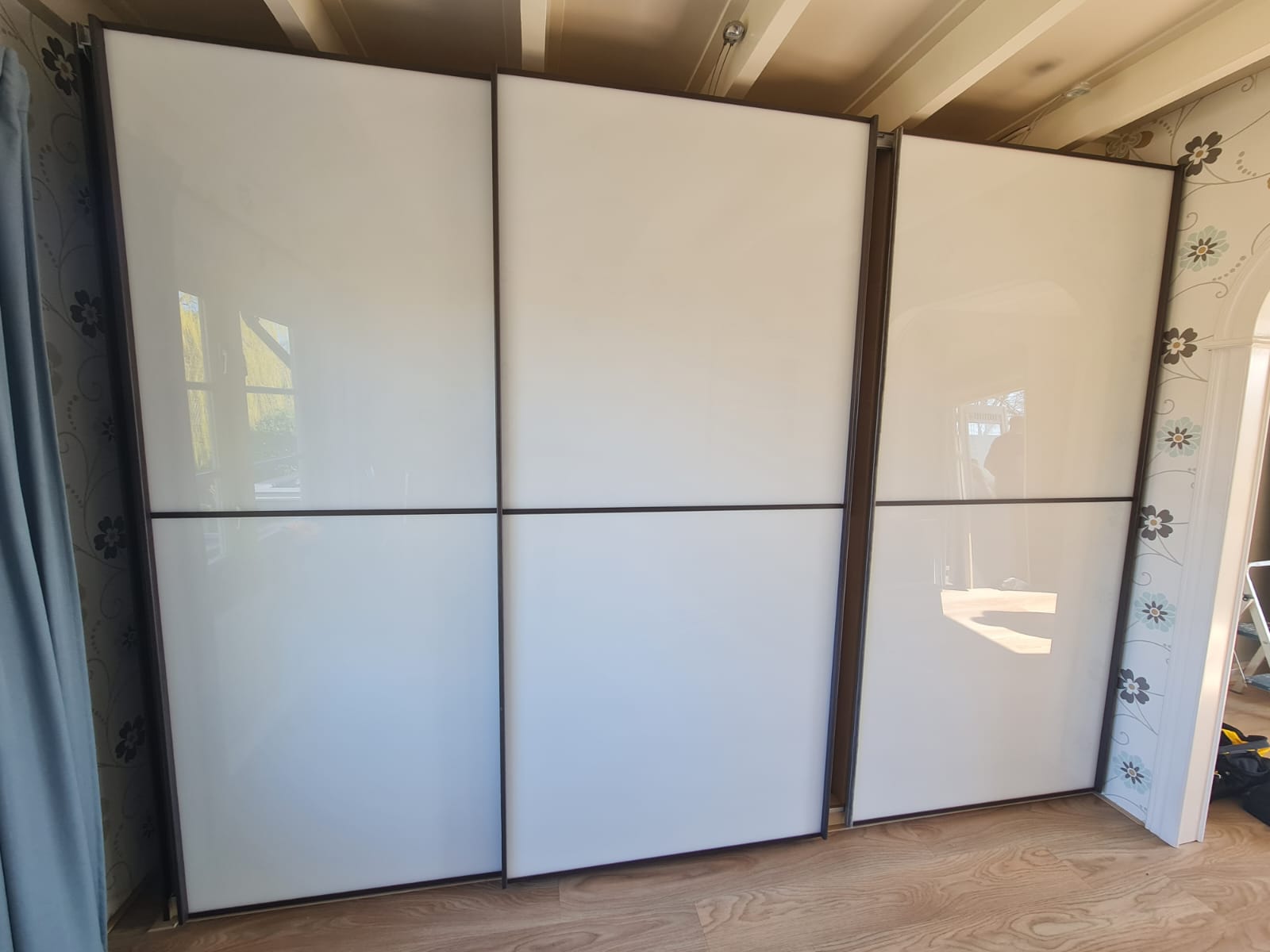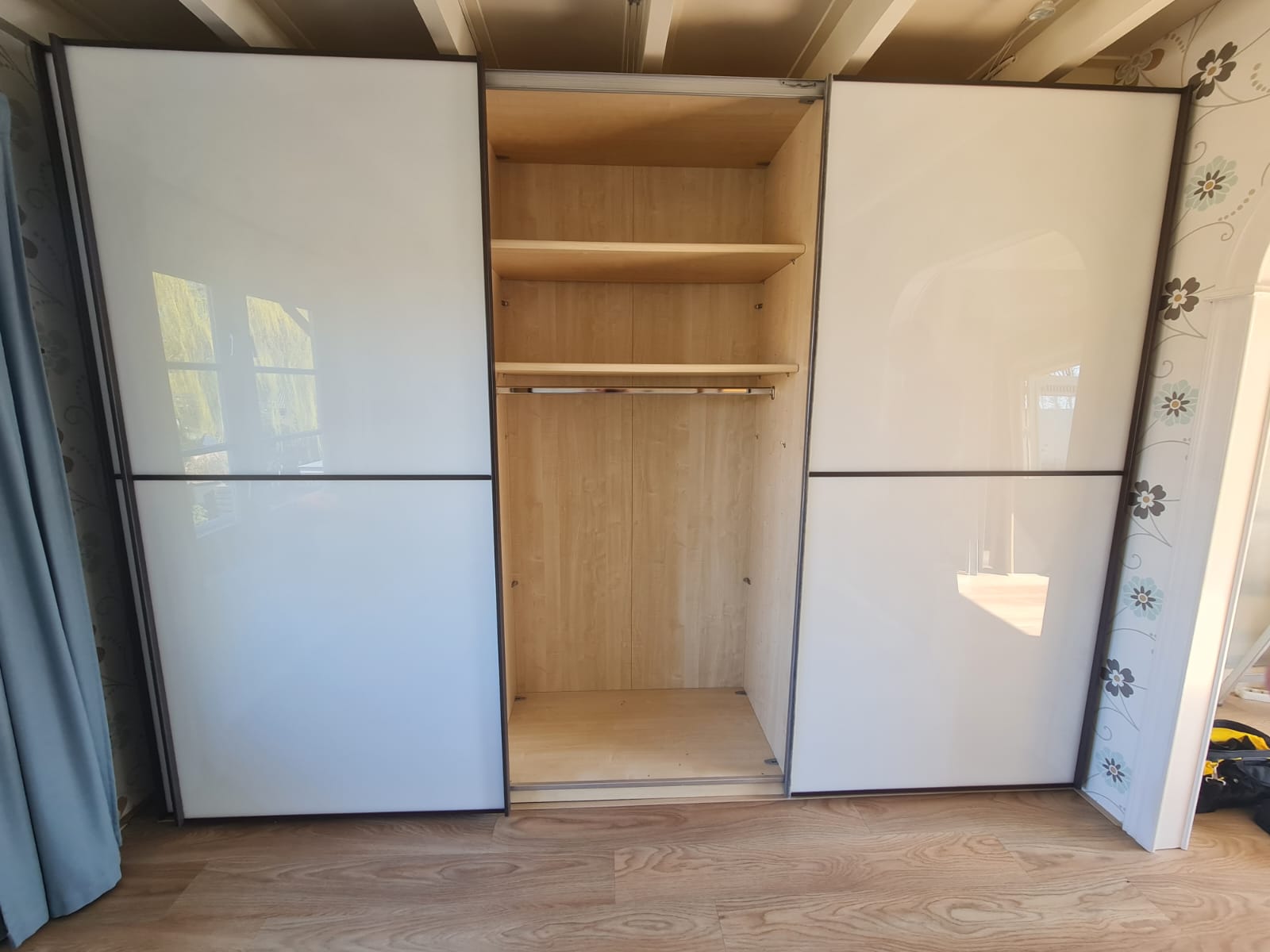 Duża pojemna garderoba z ładnymi drzwiami z białym szkłem. Szafa jest duża, ma 330cm szerokości i 241cm wysokości. 60cm głęboka + drzwi. Szafa ma 3 drzwi przesuwnych z płyty meblowej, na froncie naklejone białe szkło. Ponieważ drzwi są bardzo duże i bardzo ciężkie są demontowane. Każde drzwi składają się z 2 części. W środku duże półki i drążki na wieszaki. Szafa jest w bardzo dobrym stanie, została fachowo zdemontowana, nie ma żadnych uszkodzeń i jest kompletna we wszystkie części.