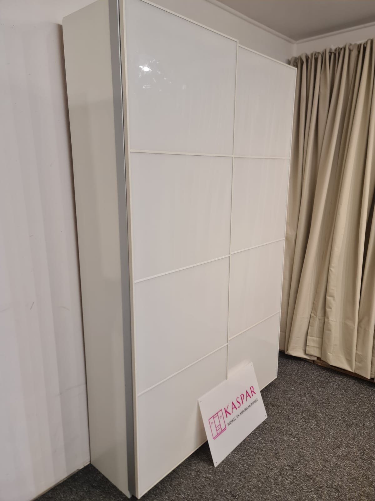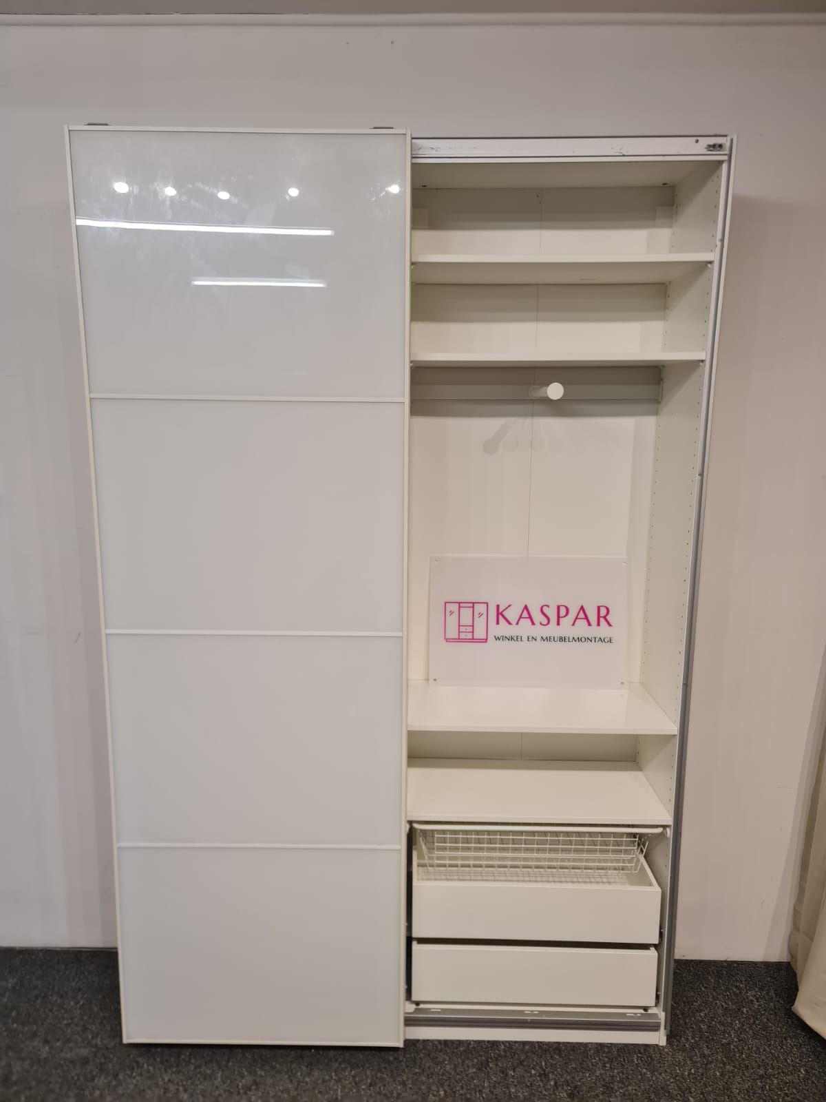 Szafa Ikea pax, wąska , tylko 36 cm głębokości! Idealna do wąskich korytarzy i małych pokojów, w których nie ma miejsca na standardową szafe. Wymiary: 150cm szeroka, 236cm wysoka, 36cm głęboka. Drzwi przesuwne, białe. W środku półki, szuflady, kosze i drążki na wieszaki. Fachowo zdemontowana i kompletna we wszystkie części.
