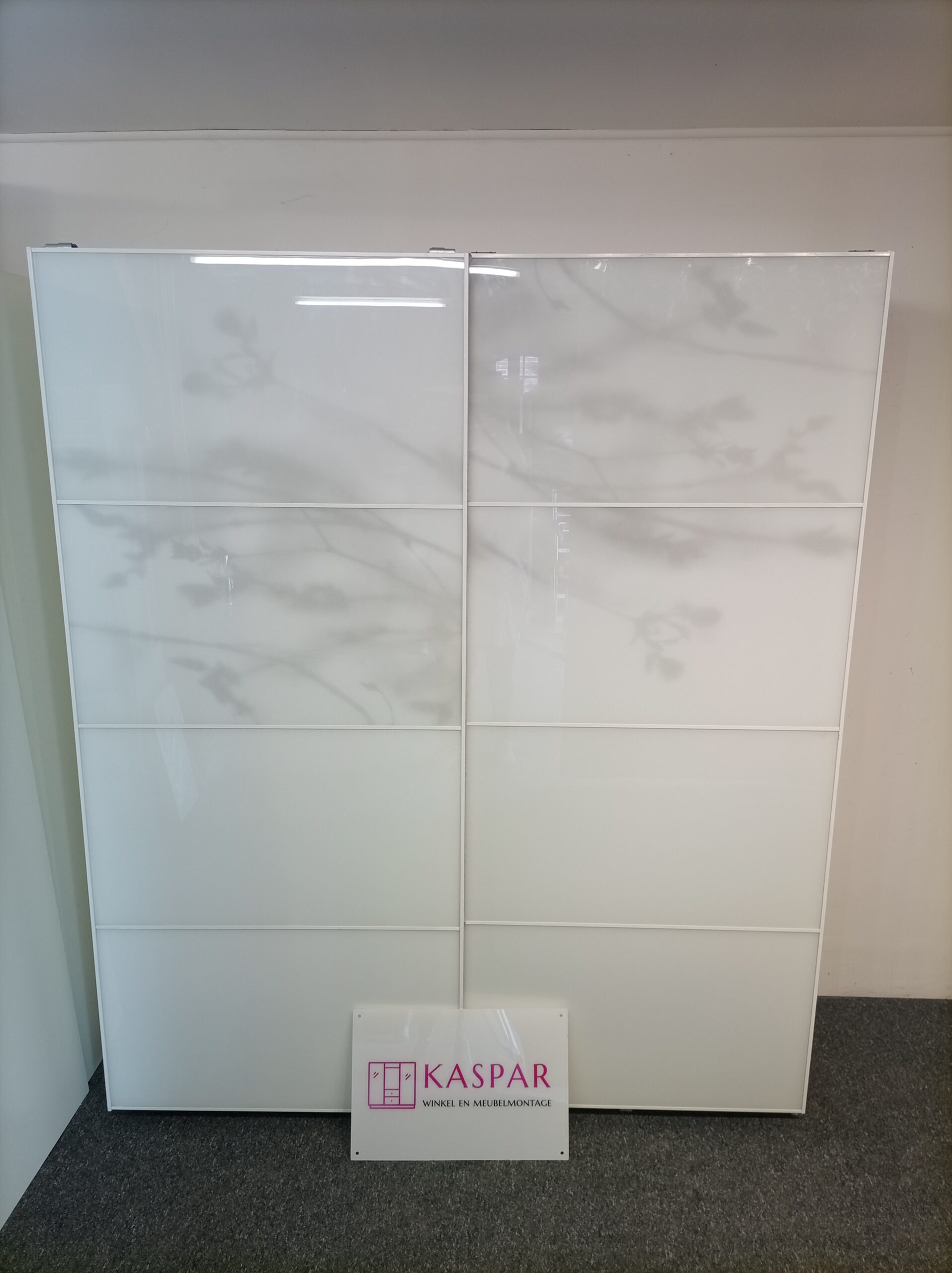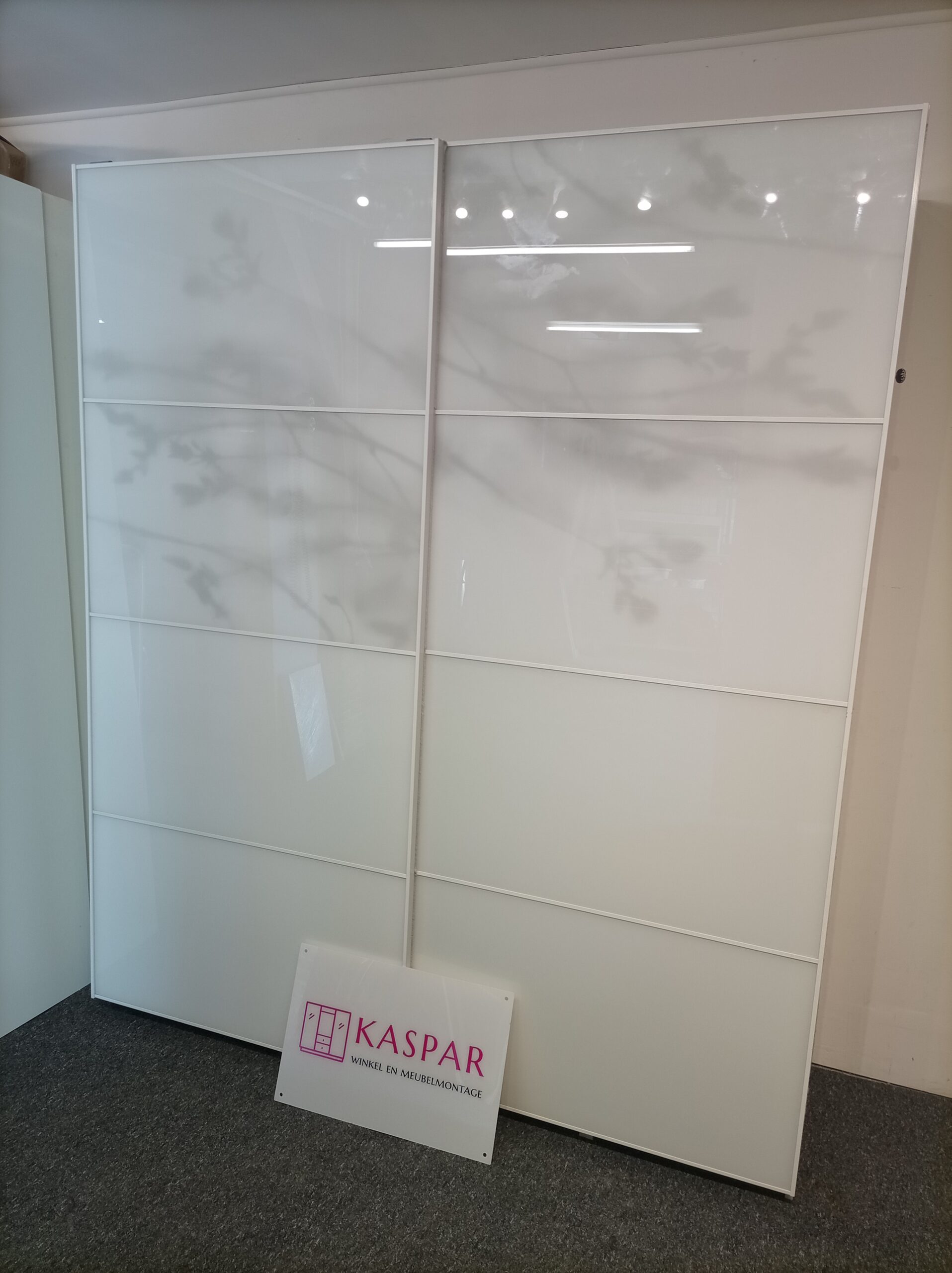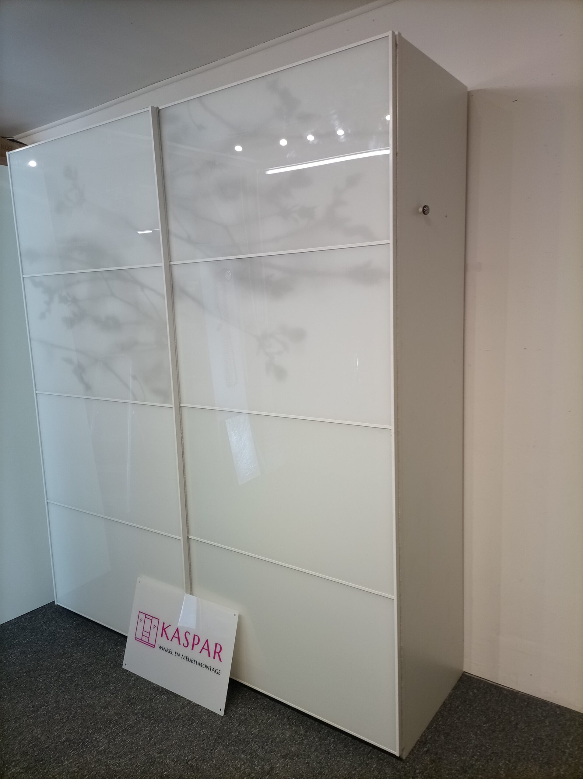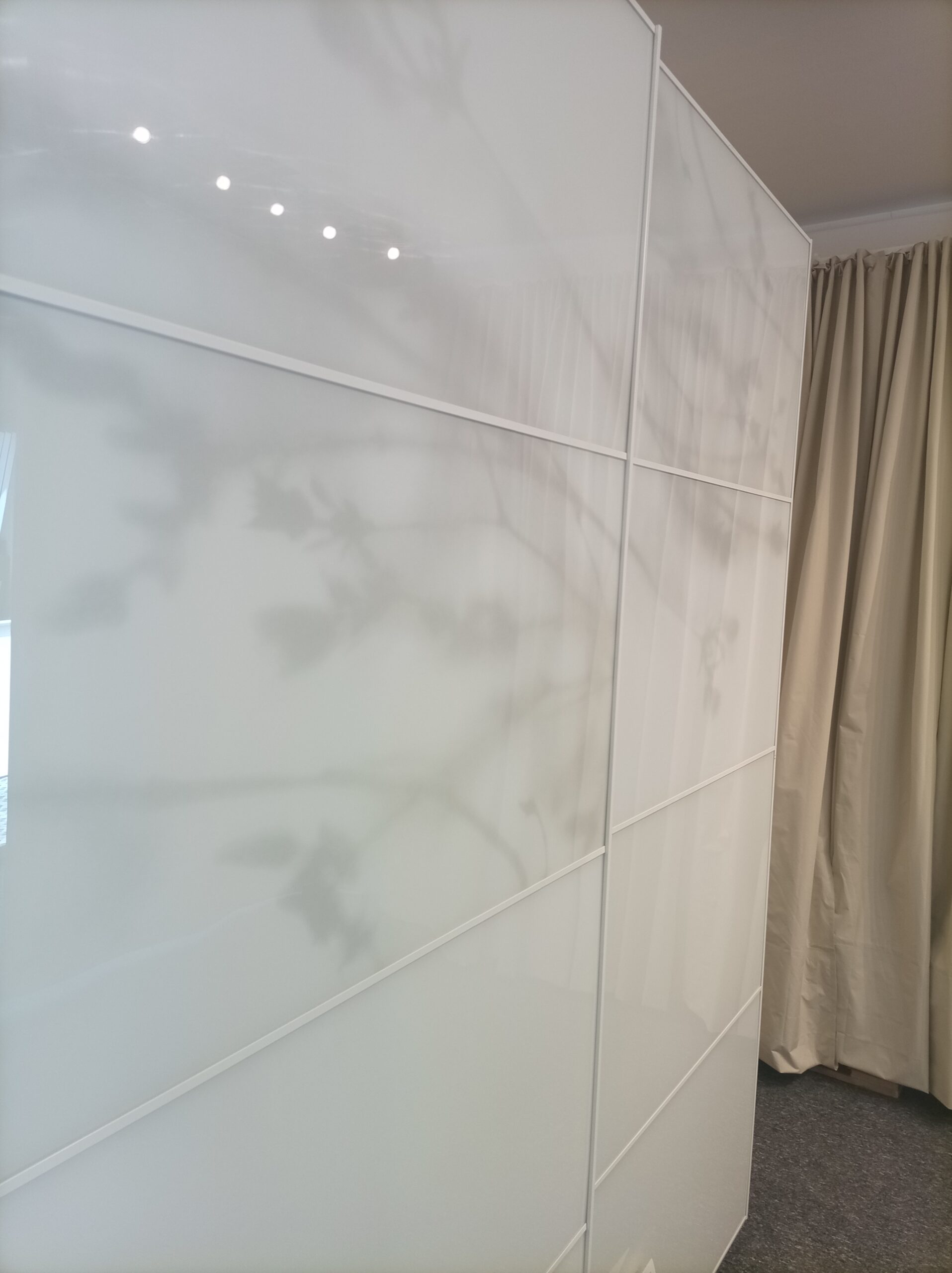Duża pojemna garderoba z ładnymi drzwiami z białym szkłem. Szafa