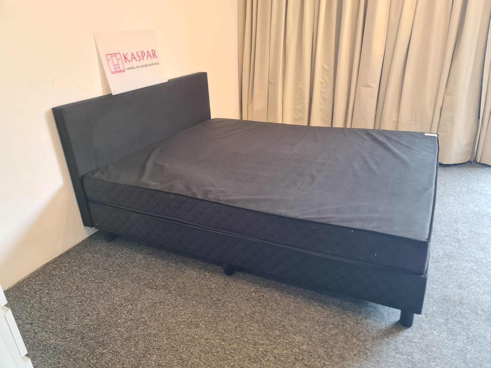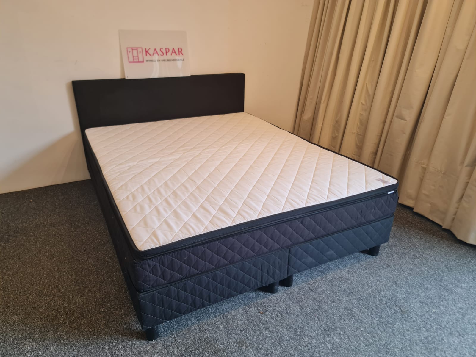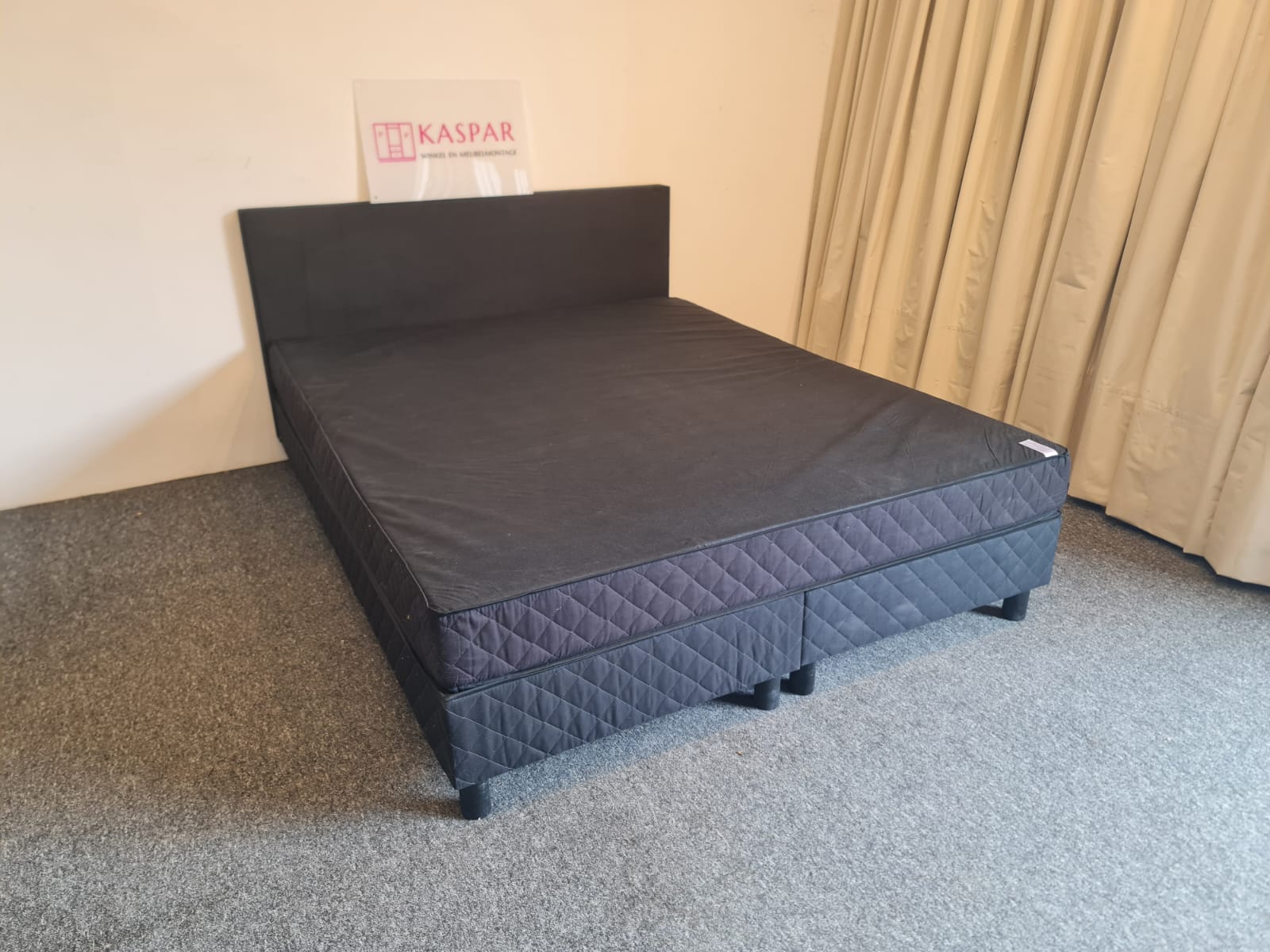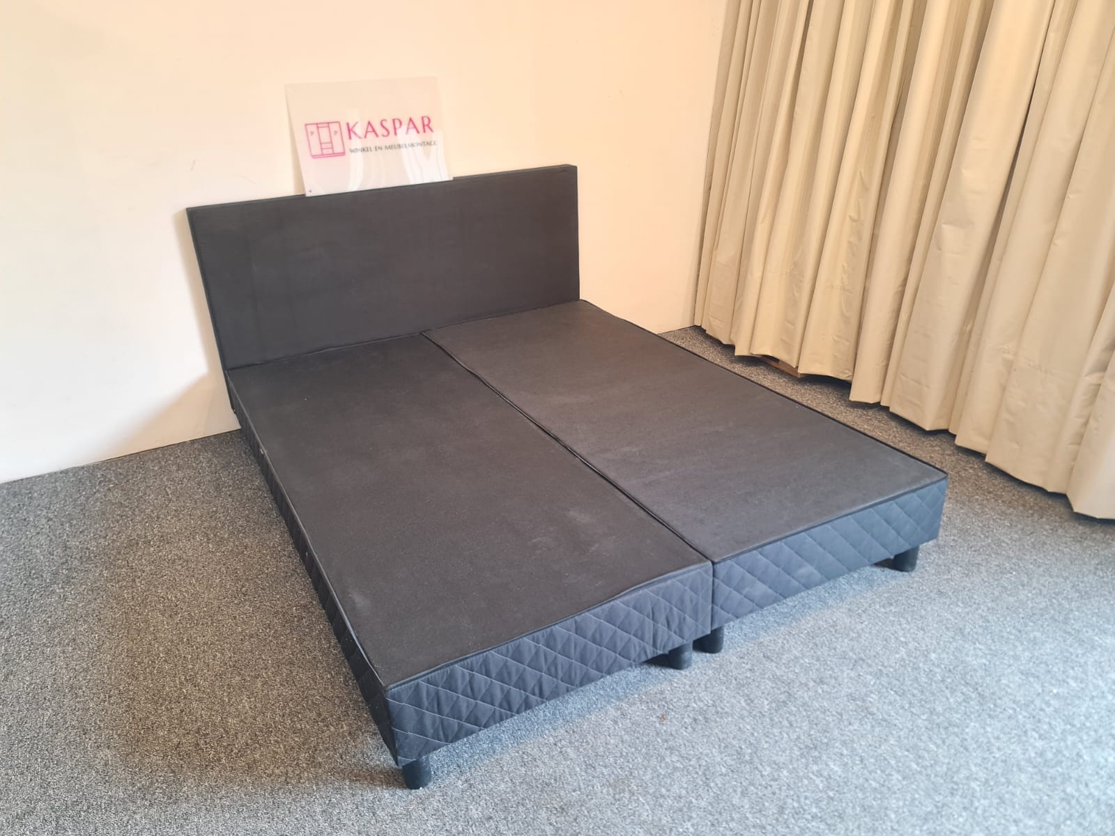 Łóżko typu boxspring o powierzchni spania 160×200. Składa się z 2 skrzyń 80×200, zagłówka i dużego materaca 160×200 + dodatkowy materac wierzchni 160×200. Zagłówek ma wysokość 91 cm. Materace są czyste i wygodne. Komfortowa wysokość, łóżko razem z materacem ma wysokość od podłogi 54cm.