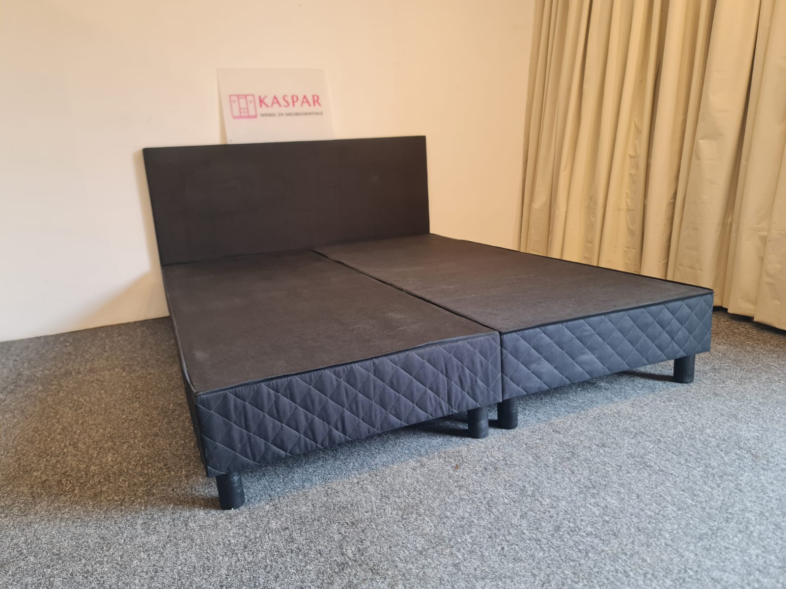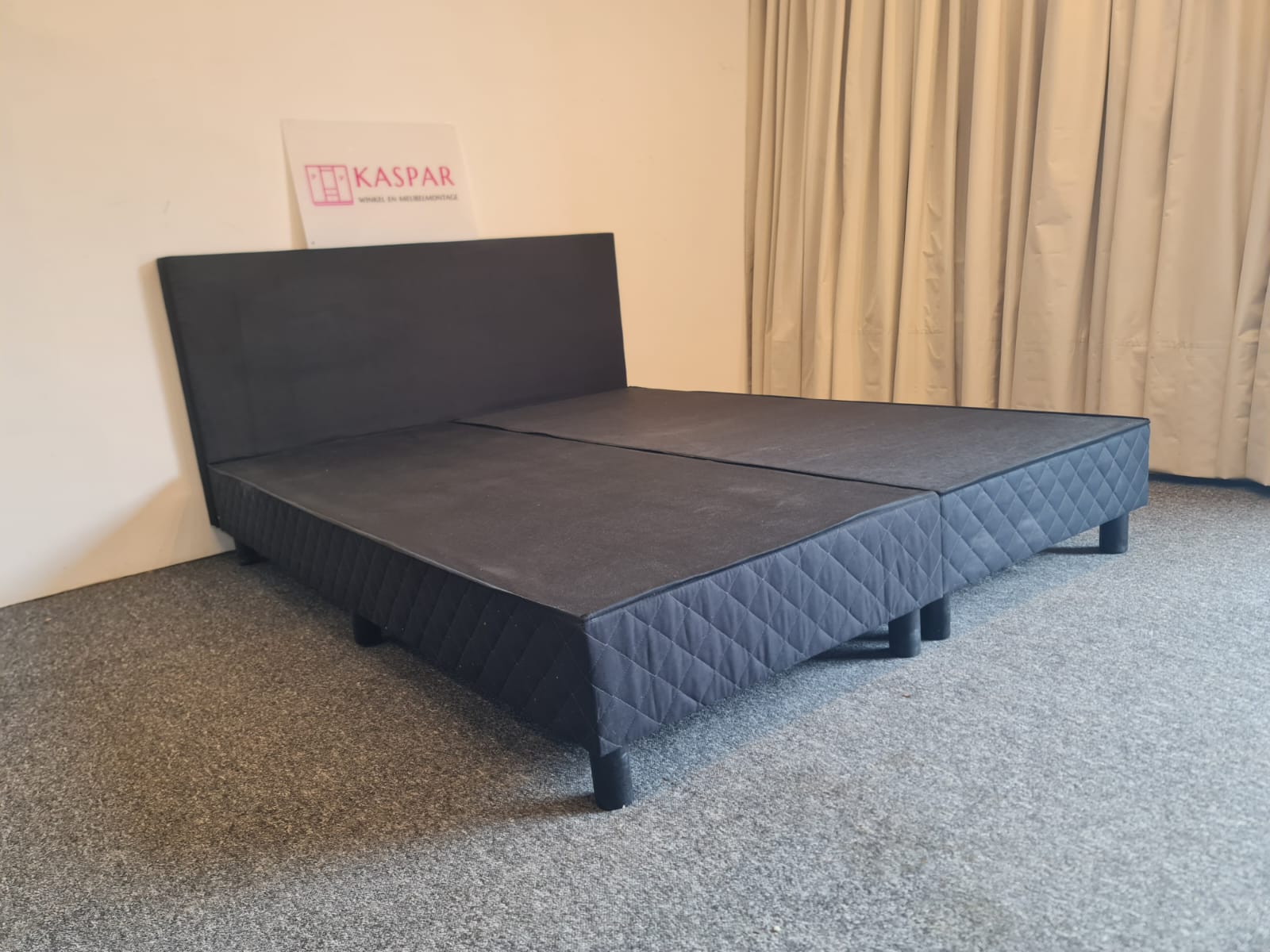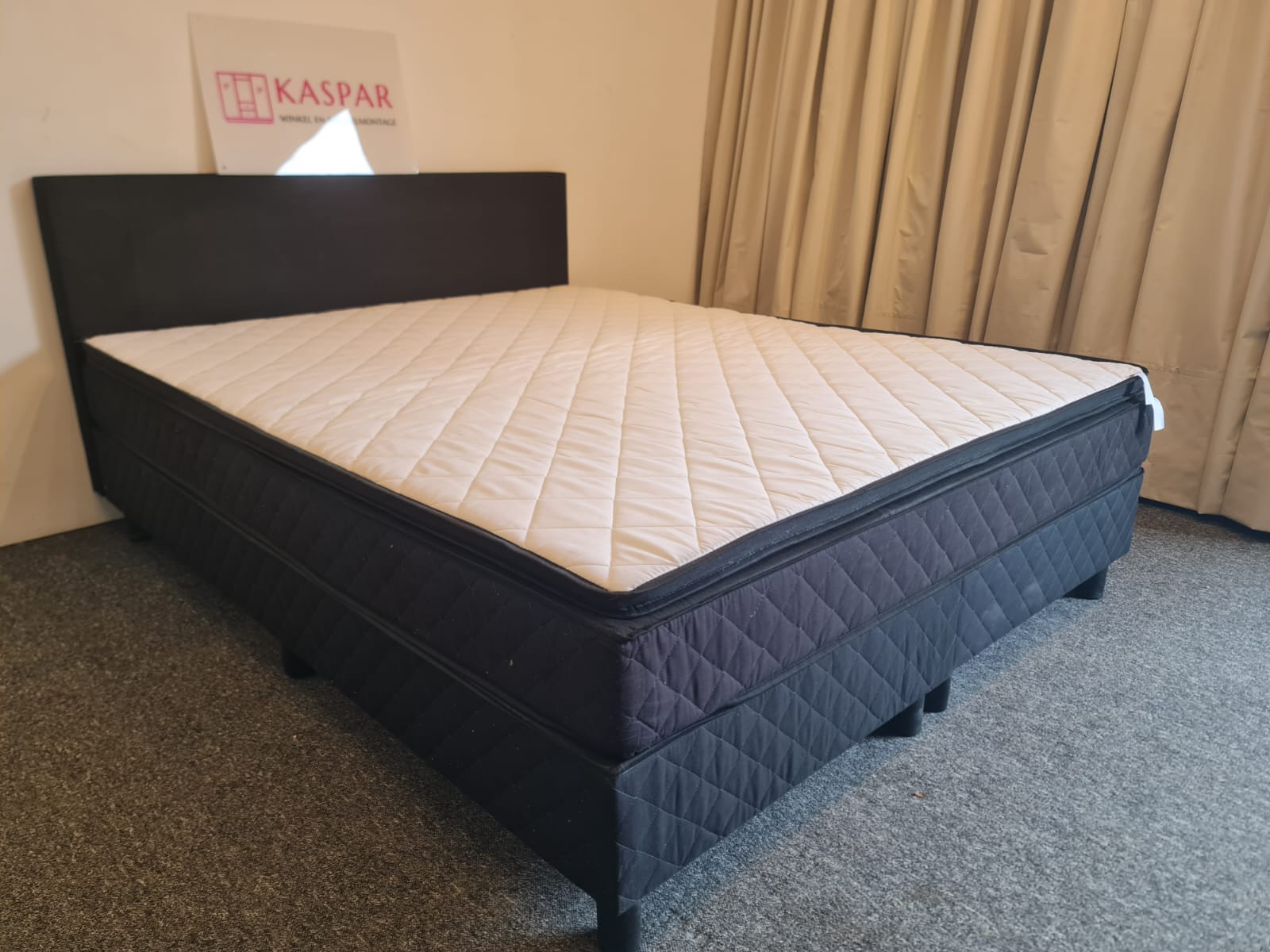 Łóżko typu boxspring o powierzchni spania 160×200. Składa się z 2 skrzyń 80×200, zagłówka i dużego materaca 160×200 + dodatkowy materac wierzchni 160×200. Zagłówek ma wysokość 91 cm. Materace są czyste i wygodne. Komfortowa wysokość, łóżko razem z materacem ma wysokość od podłogi 54cm.