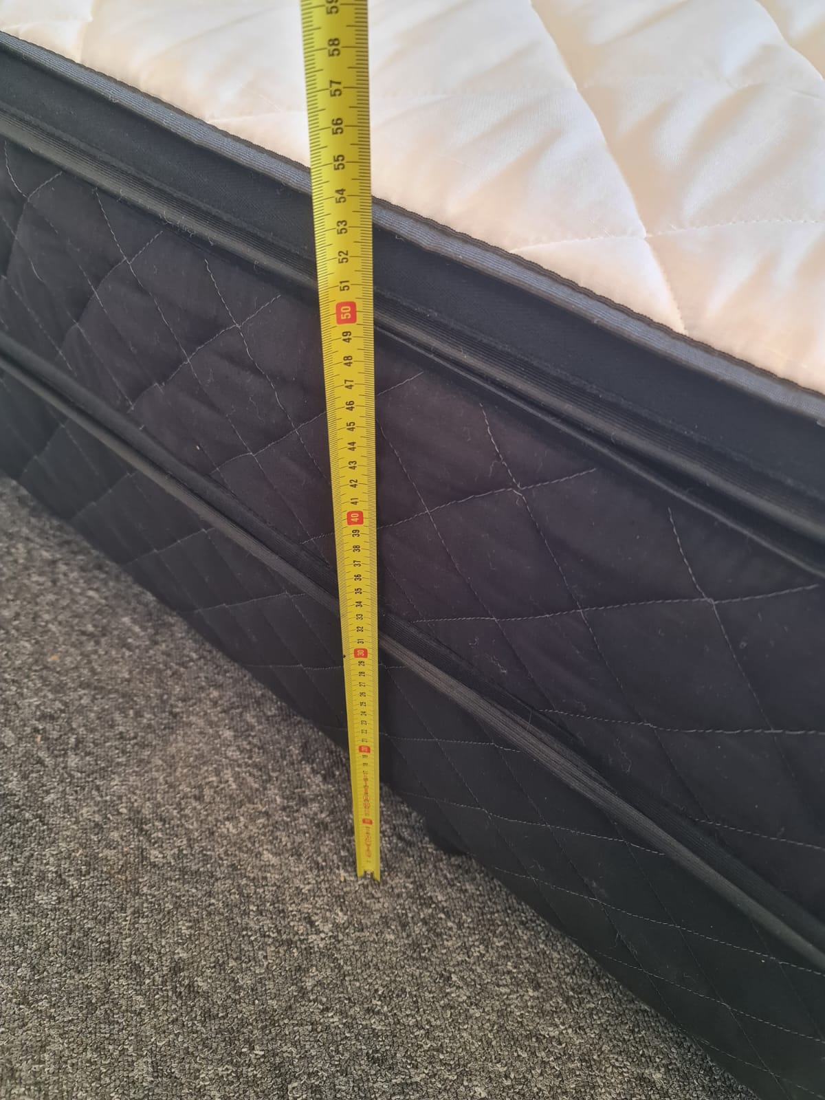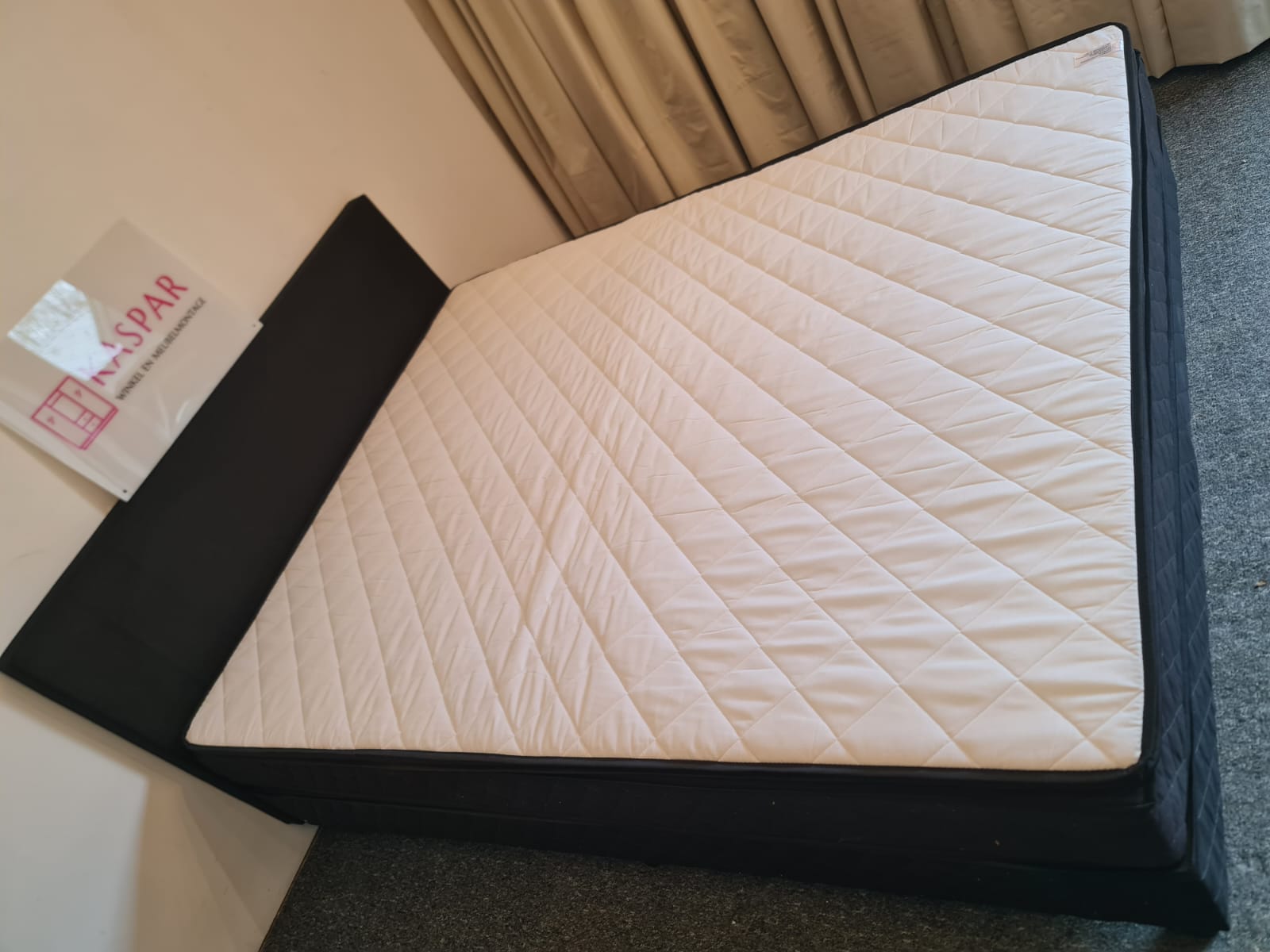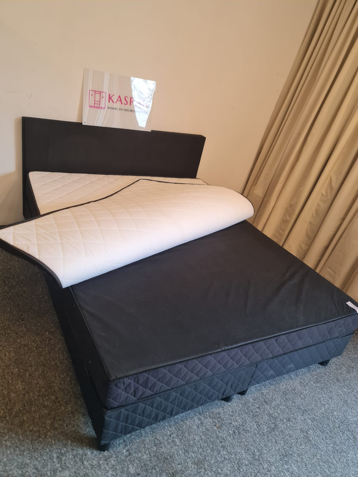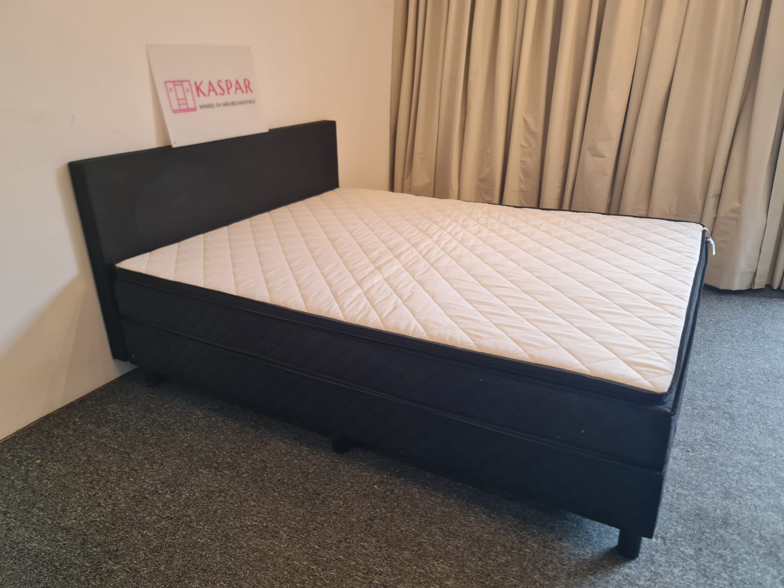 Łóżko typu boxspring o powierzchni spania 160×200. Składa się z 2 skrzyń 80×200, zagłówka i dużego materaca 160×200 + dodatkowy materac wierzchni 160×200. Zagłówek ma wysokość 91 cm. Materace są czyste i wygodne. Komfortowa wysokość, łóżko razem z materacem ma wysokość od podłogi 54cm.