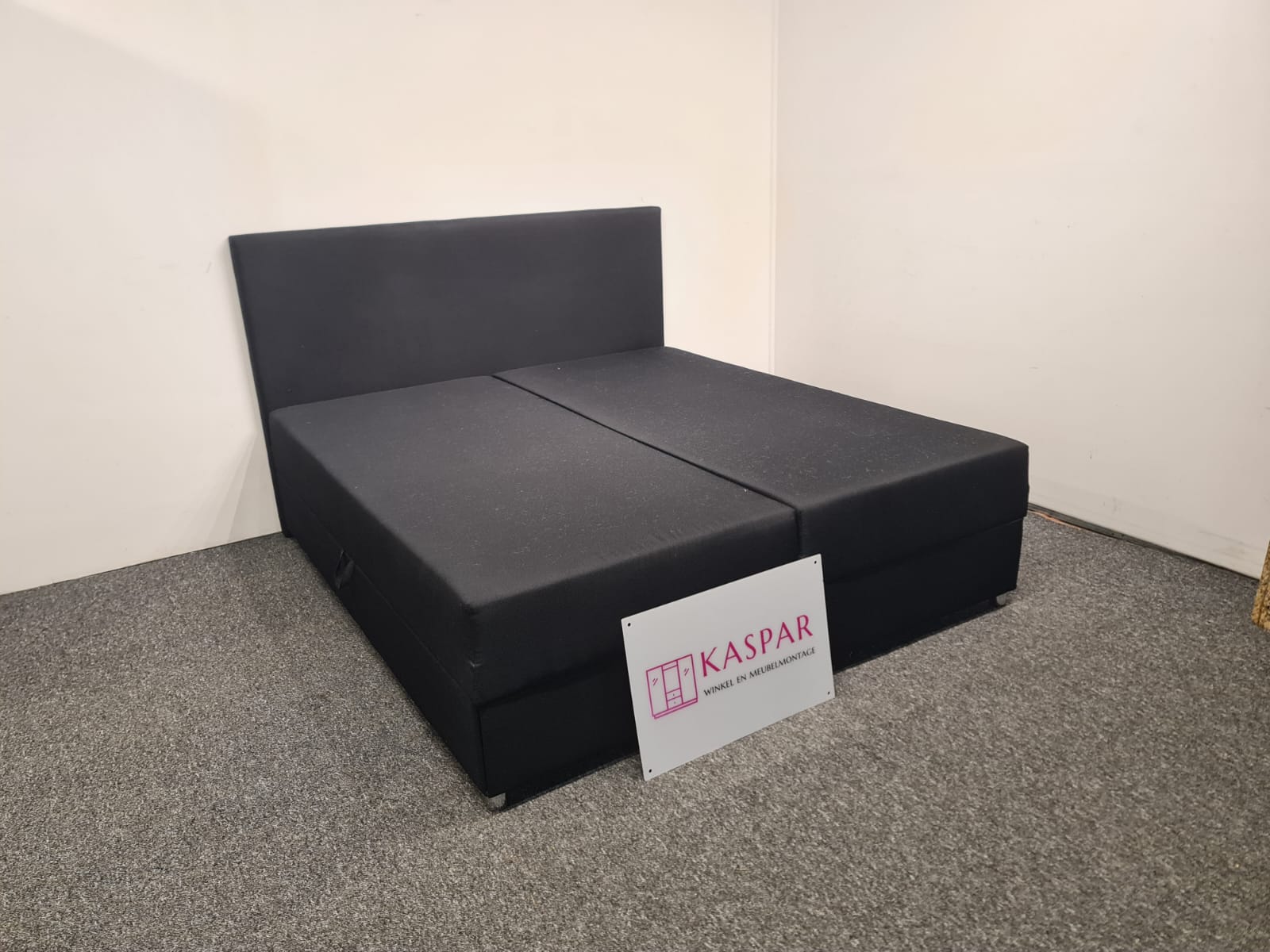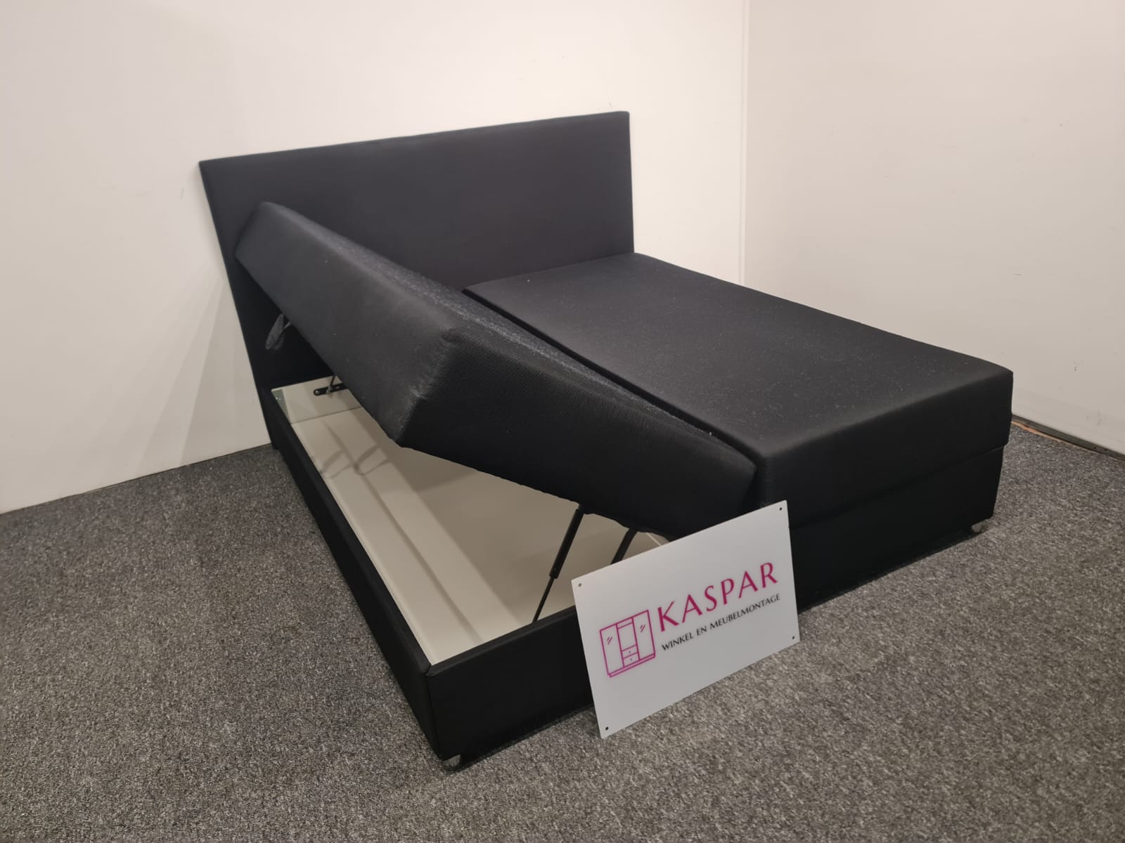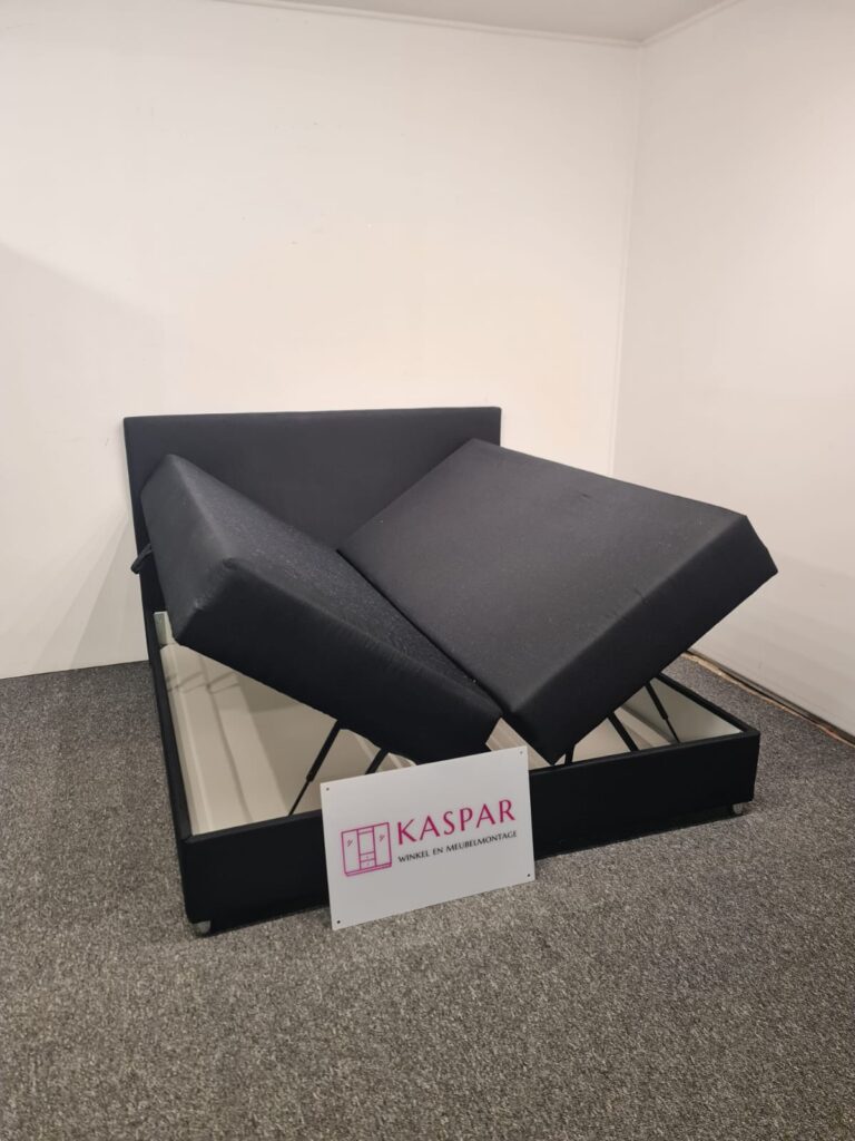 Łóżko typu boxspring o wymiarach 180×200 cm składa się z dwóch skrzyń o wymiarach 90×200 cm oraz zagłówka. Dwie duże sprężynie podnoszone do góry z dużym miejscem do przechowywania. Górna część jest wygodna do spania. Nie potrzeba dodatkowego materaca, ewentualnie cienki top materac. Łóżko można łatwo podnieść bez wysiłku, podnoszenie na siłownikach. Kolor: czarny.