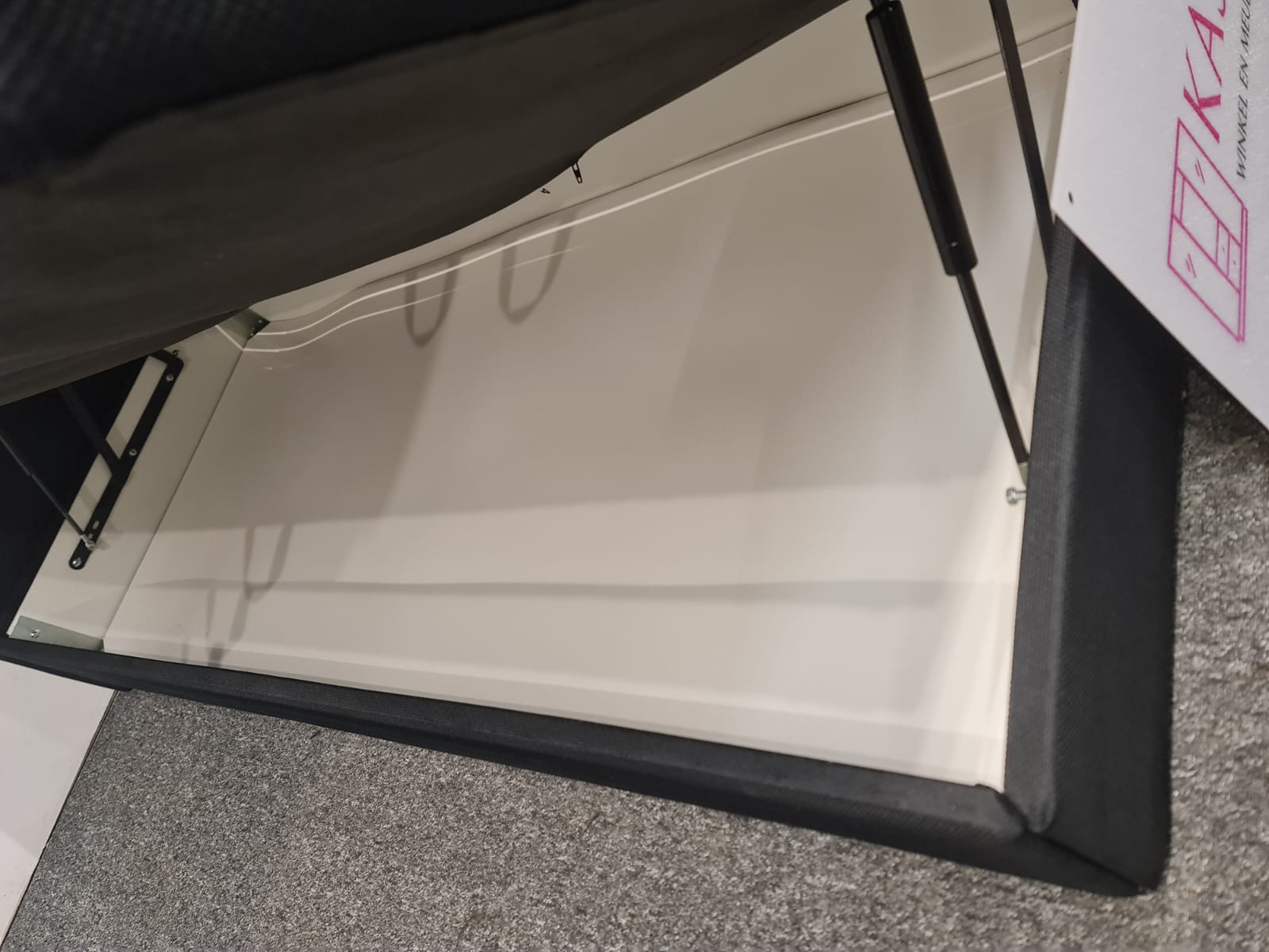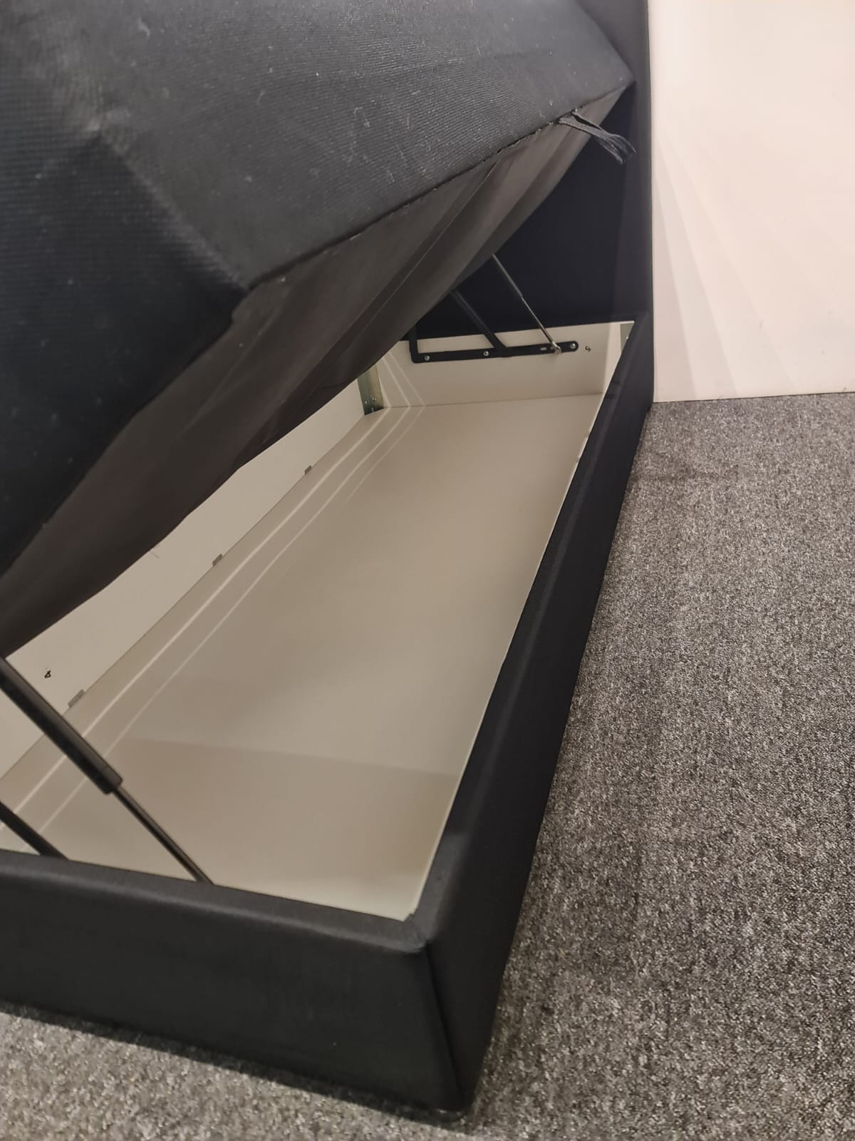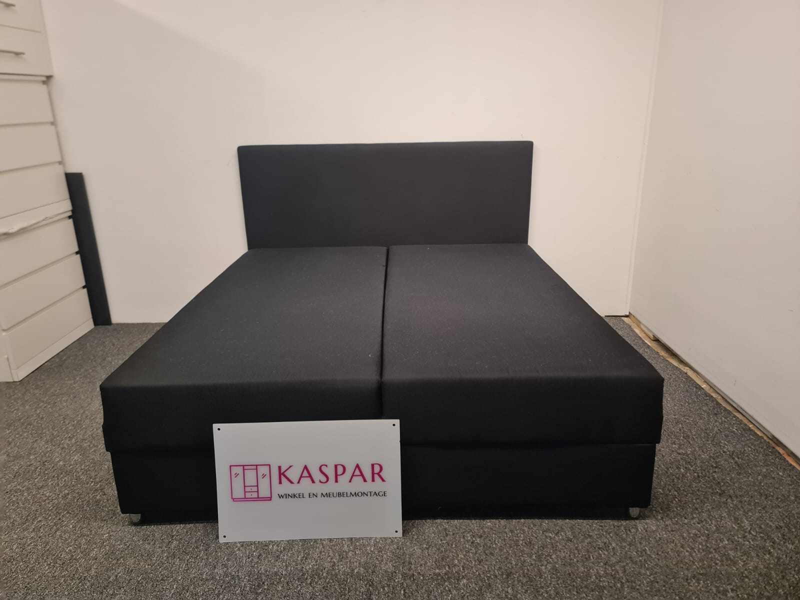 Łóżko typu boxspring o wymiarach 180×200 cm składa się z dwóch skrzyń o wymiarach 90×200 cm oraz zagłówka. Dwie duże sprężynie podnoszone do góry z dużym miejscem do przechowywania. Górna część jest wygodna do spania. Nie potrzeba dodatkowego materaca, ewentualnie cienki top materac. Łóżko można łatwo podnieść bez wysiłku, podnoszenie na siłownikach. Kolor: czarny.