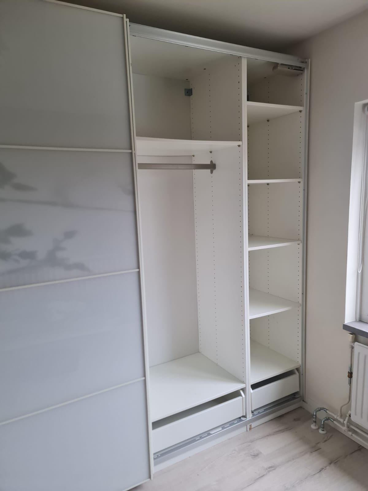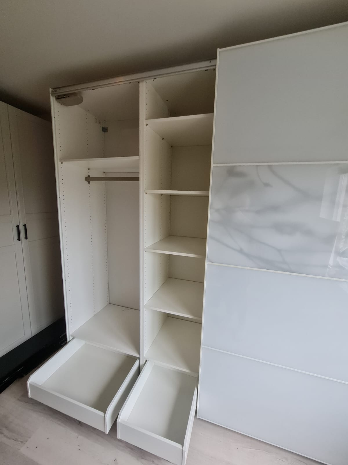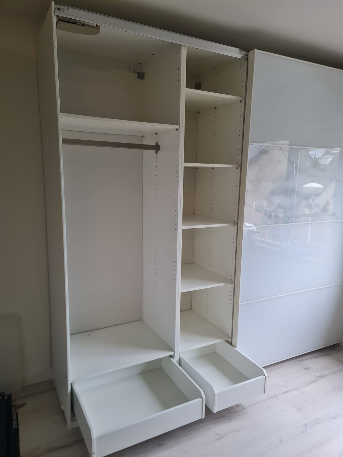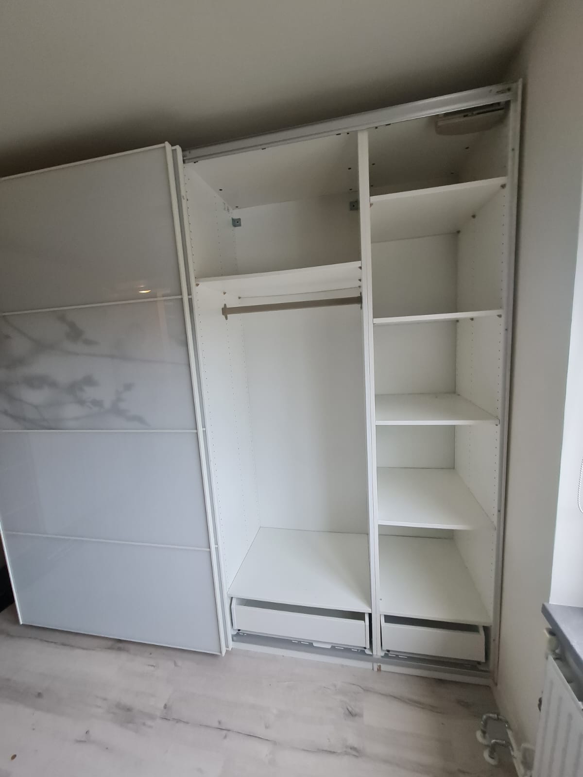 Szafa z popularnej i lubianej serii mebli ikea pax. Wymiary: 2.50m szeroka, 236cm wysoka, 60cm głęboka. Piękne drzwi z białego szkła, z dekoltem padającego cienia gałązki drzewa. Drzwi z systemem cichego zamykania (soft close). Szafa ma w środku bardzo dużo półek, drążki na wiedzy oraz na dole szuflady. Szafa jest w bardzo dobrym stanie, została fachowo zdemontowana, bez uszkodzeń i jest kompletna we wszystkie elementy.