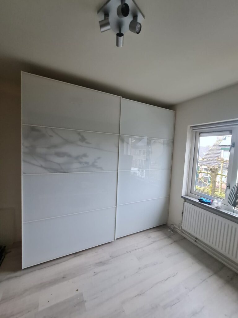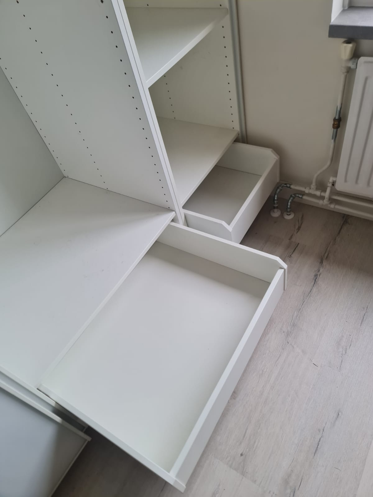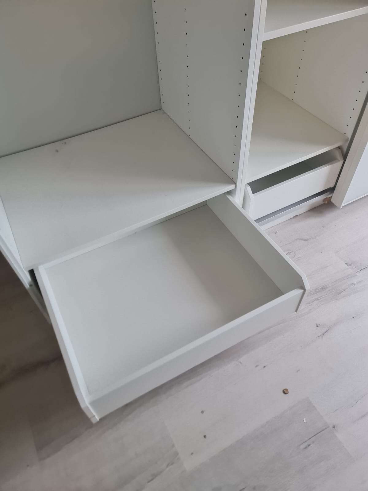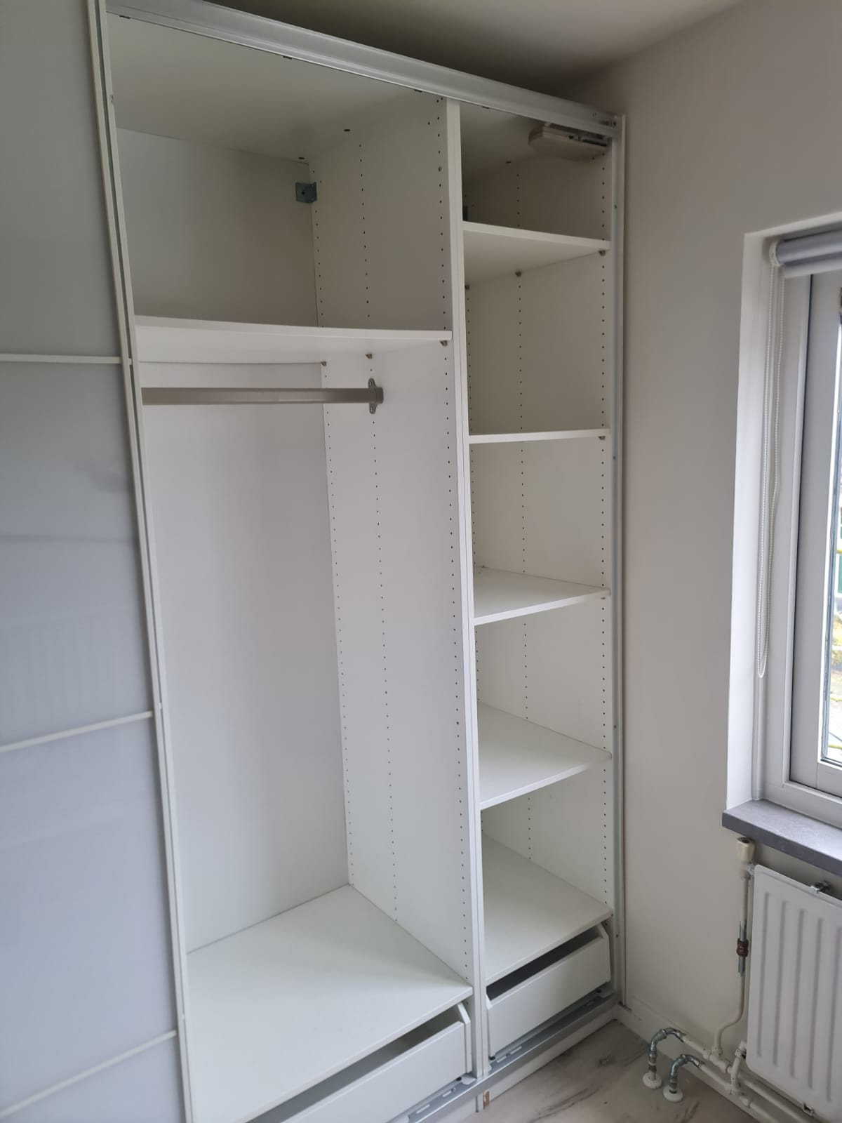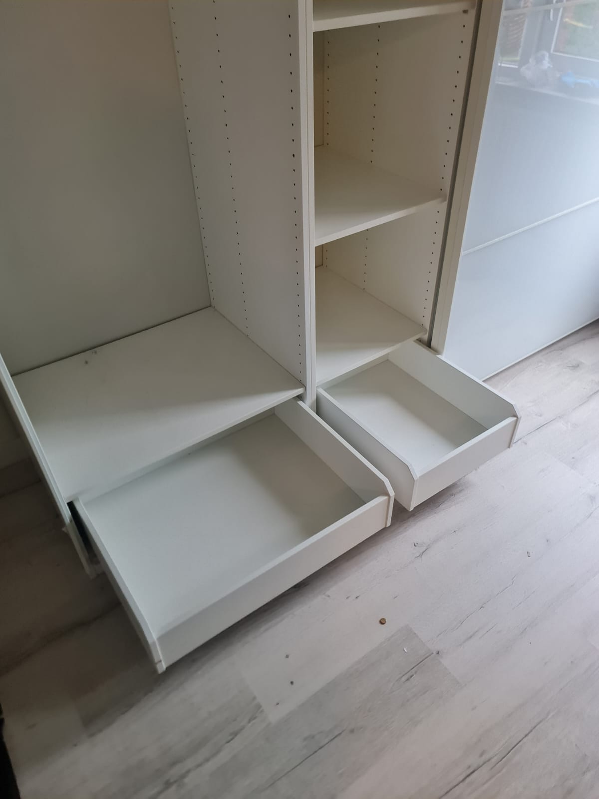 Szafa z popularnej i lubianej serii mebli ikea pax. Wymiary: 2.50m szeroka, 236cm wysoka, 60cm głęboka. Piękne drzwi z białego szkła, z dekoltem padającego cienia gałązki drzewa. Drzwi z systemem cichego zamykania (soft close). Szafa ma w środku bardzo dużo półek, drążki na wiedzy oraz na dole szuflady. Szafa jest w bardzo dobrym stanie, została fachowo zdemontowana, bez uszkodzeń i jest kompletna we wszystkie elementy.