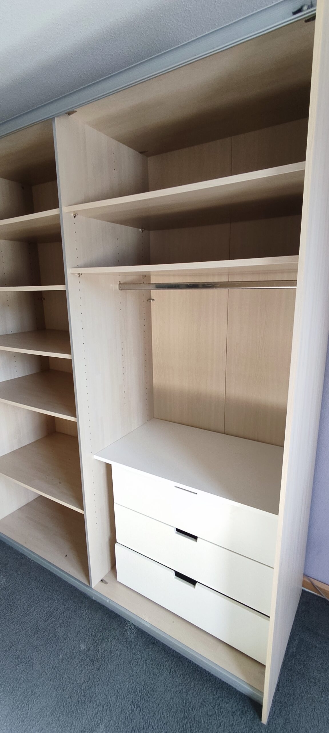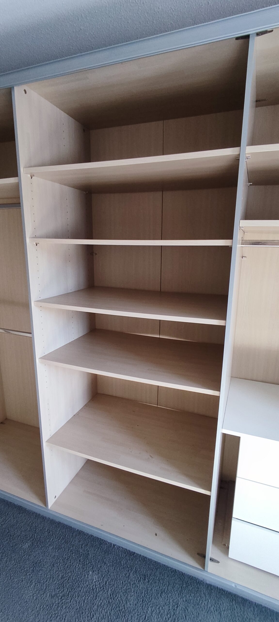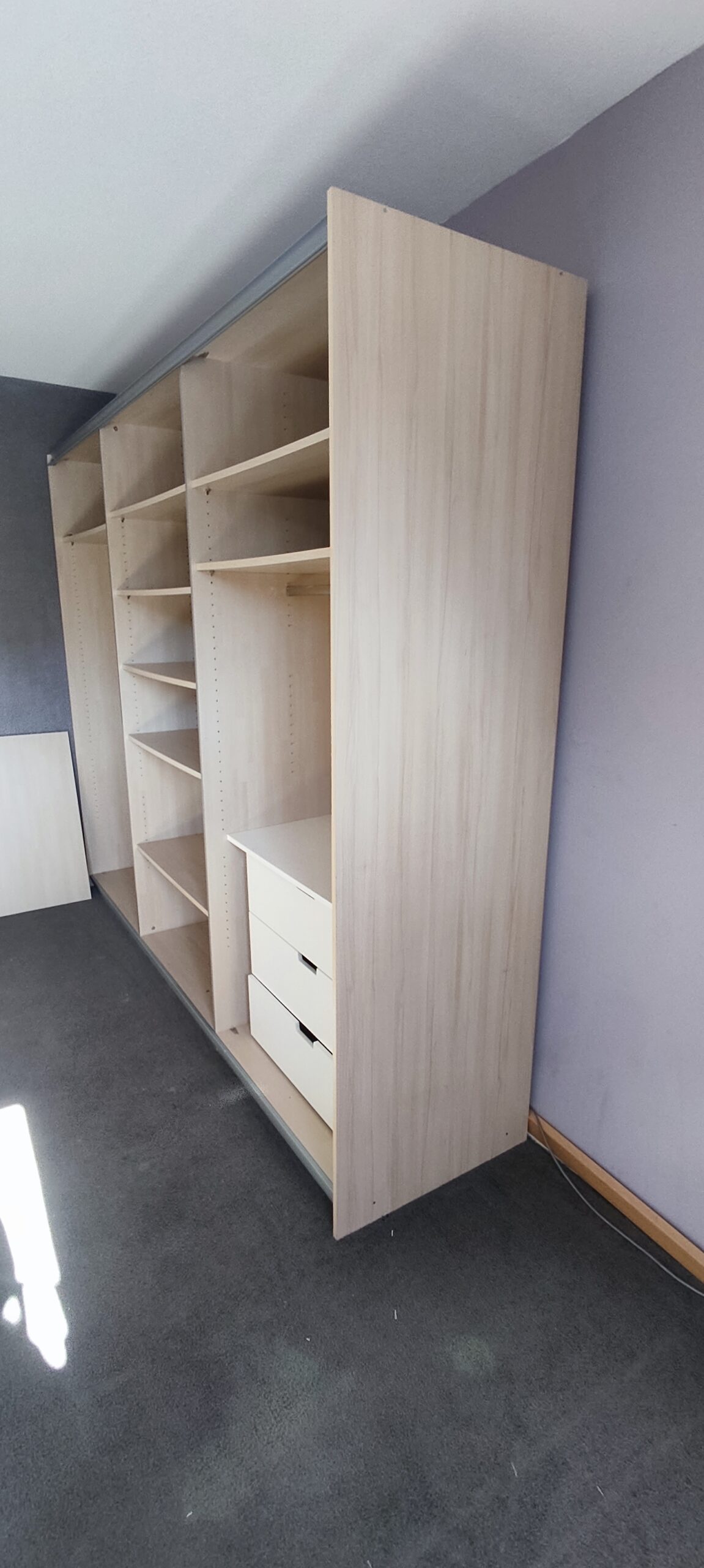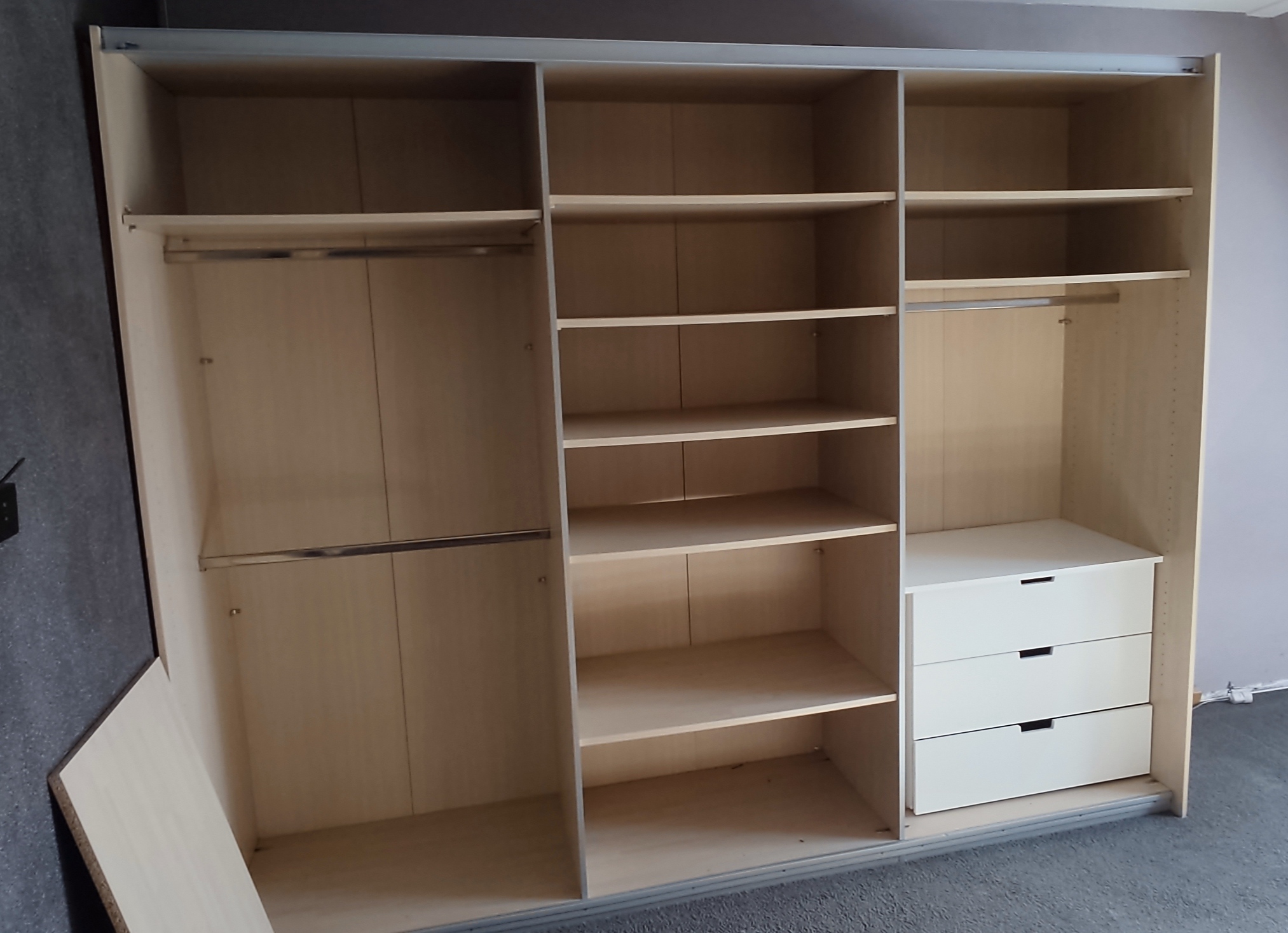 Ładna i przestronna szafa z dużą ilością półek. Szafa ma 270cm szerokości, jest 65cm głęboka i 218cm wysoka. Kolor to fornir imitujący bardzo jasne drewno. Bardzo dużo półek, pojemne szuflady i drążki na wieszaki. Szafa została fachowo zdemontowana, w bardzo dobrym stanie i jest kompletna we wszystkie elementy.