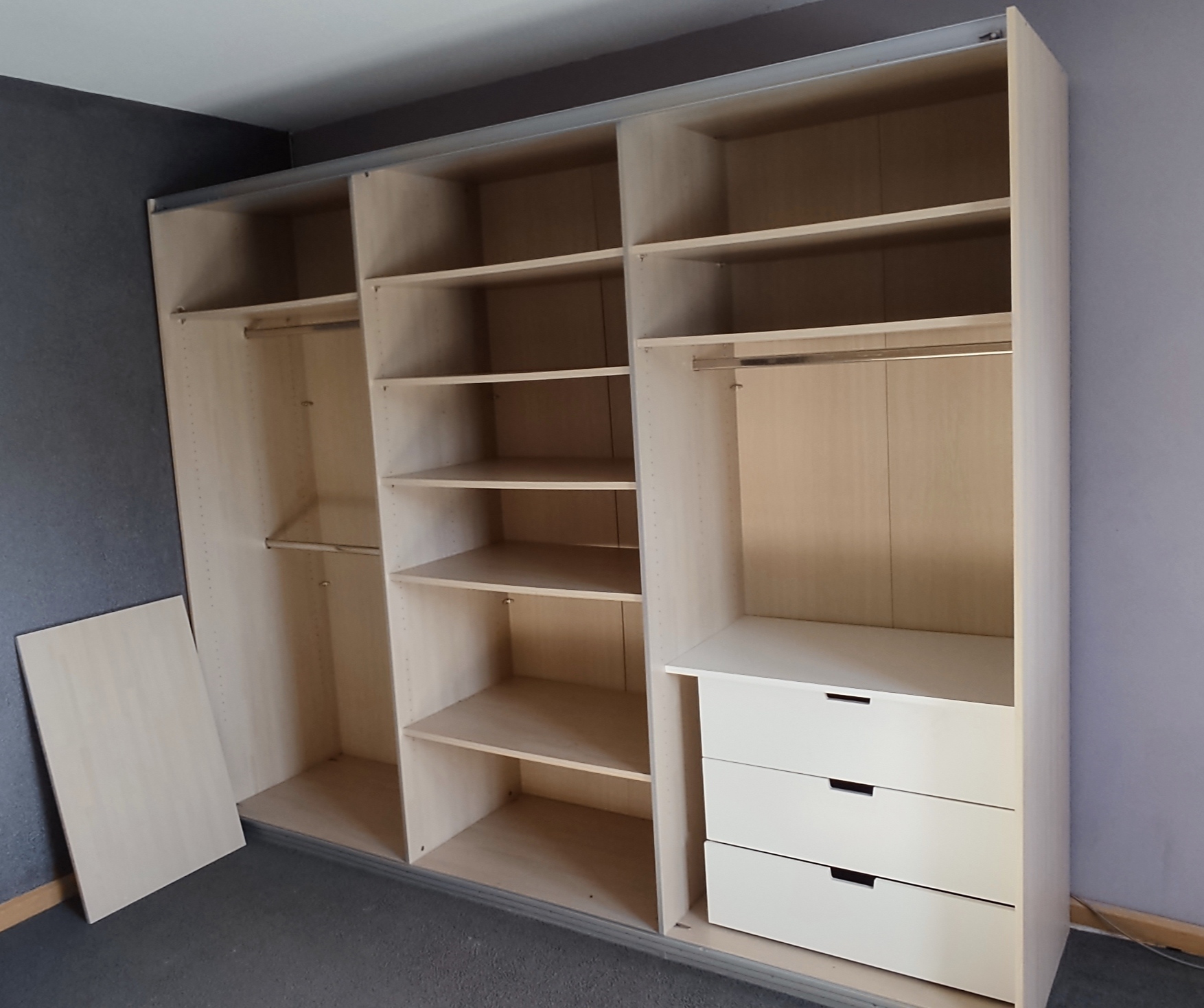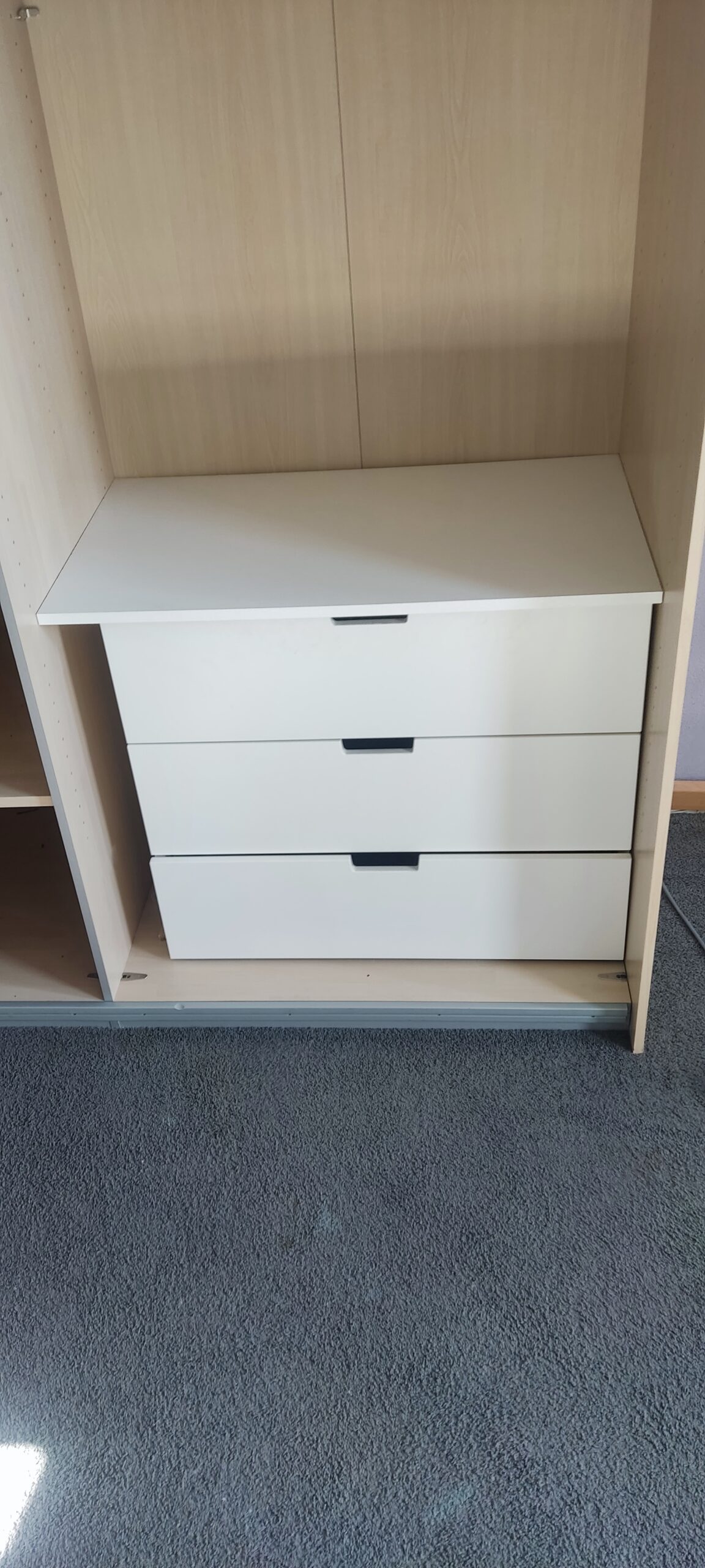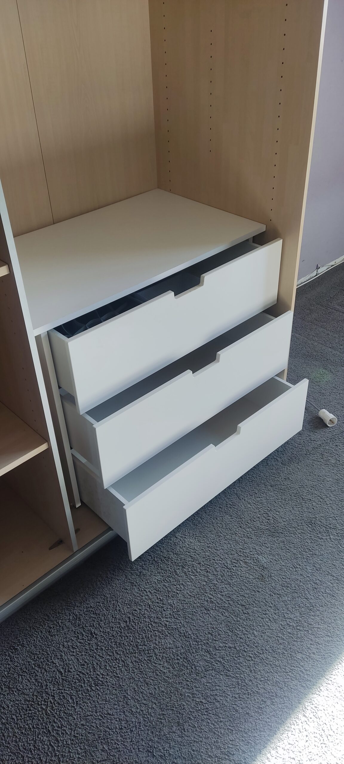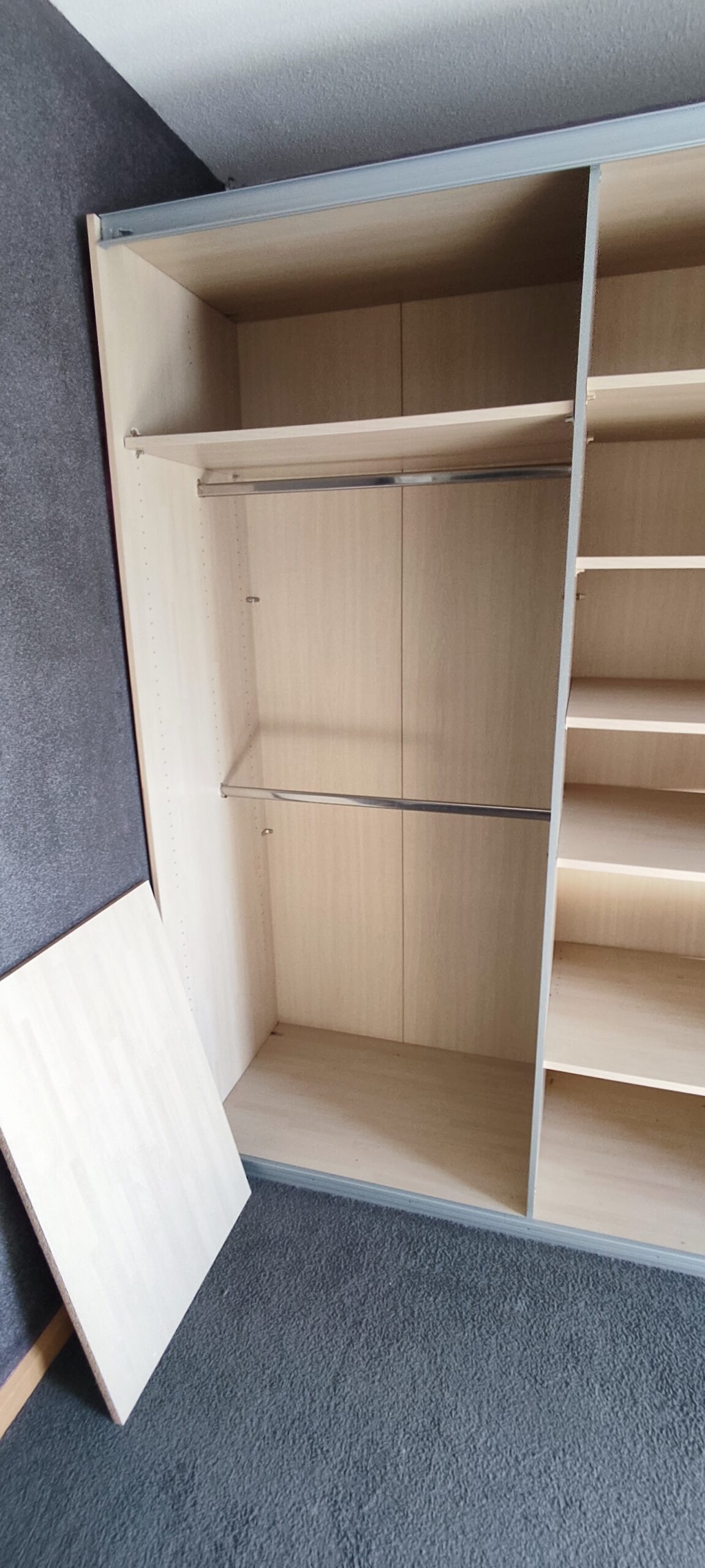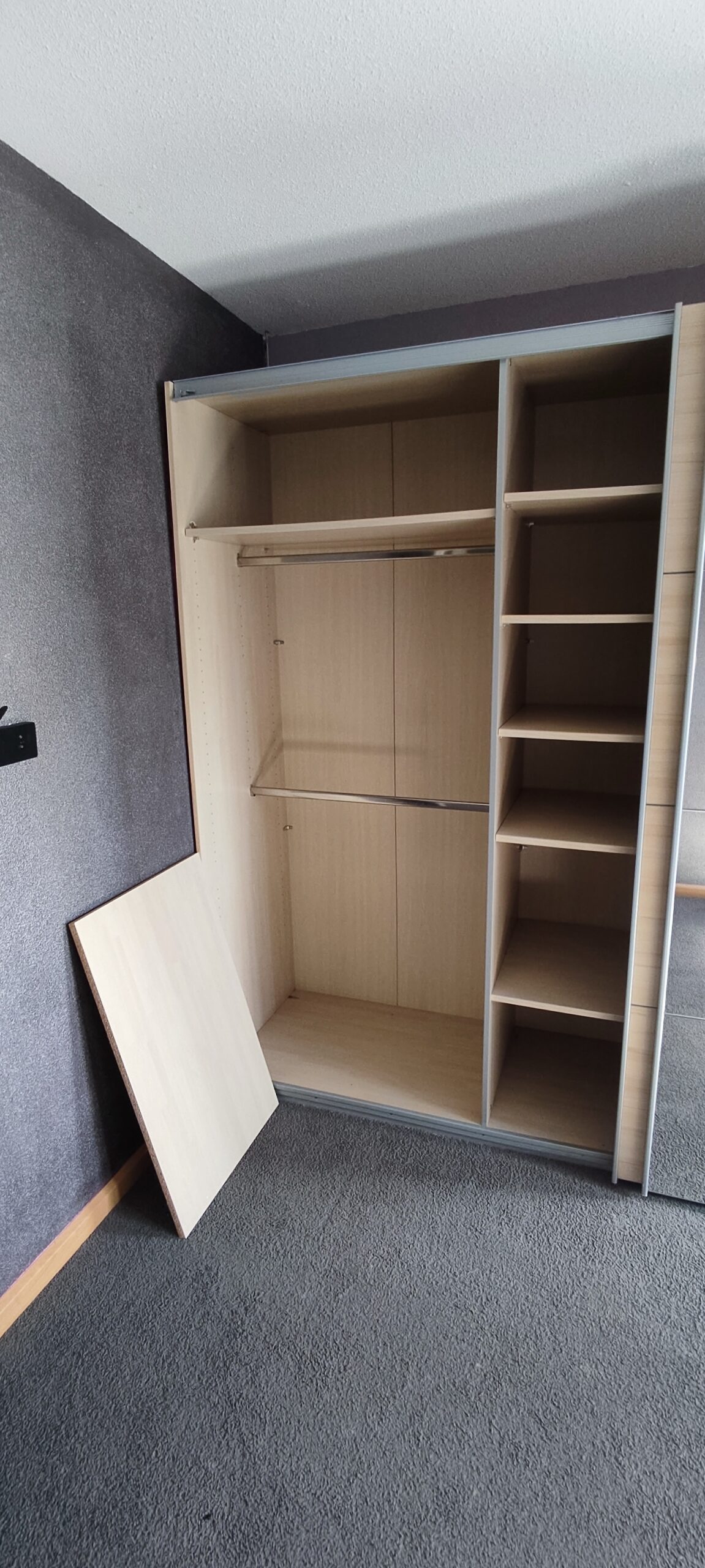 Ładna i przestronna szafa z dużą ilością półek. Szafa ma 270cm szerokości, jest 65cm głęboka i 218cm wysoka. Kolor to fornir imitujący bardzo jasne drewno. Bardzo dużo półek, pojemne szuflady i drążki na wieszaki. Szafa została fachowo zdemontowana, w bardzo dobrym stanie i jest kompletna we wszystkie elementy.