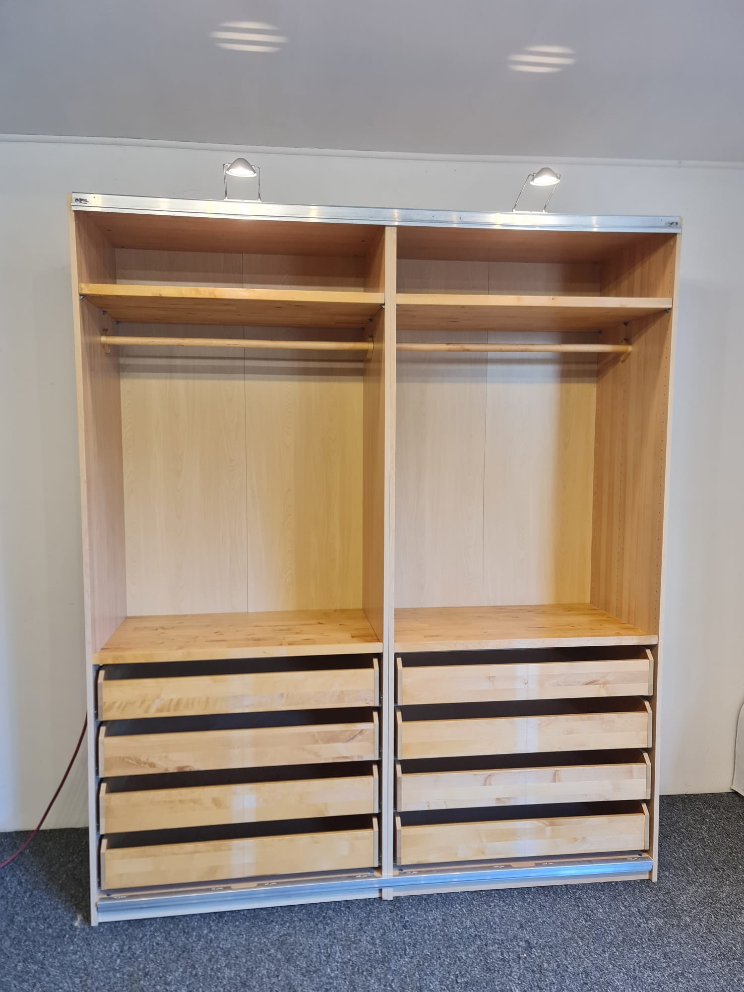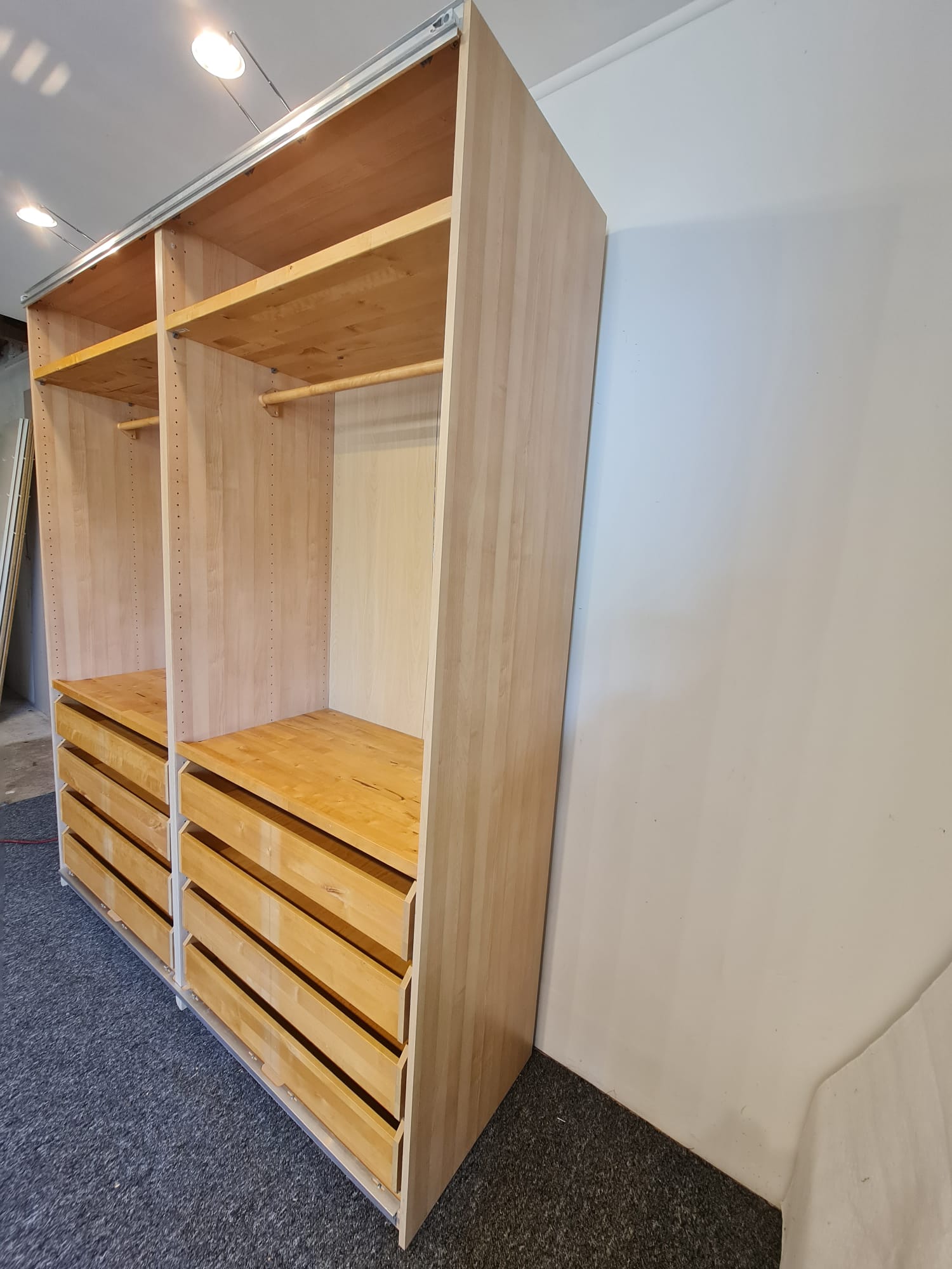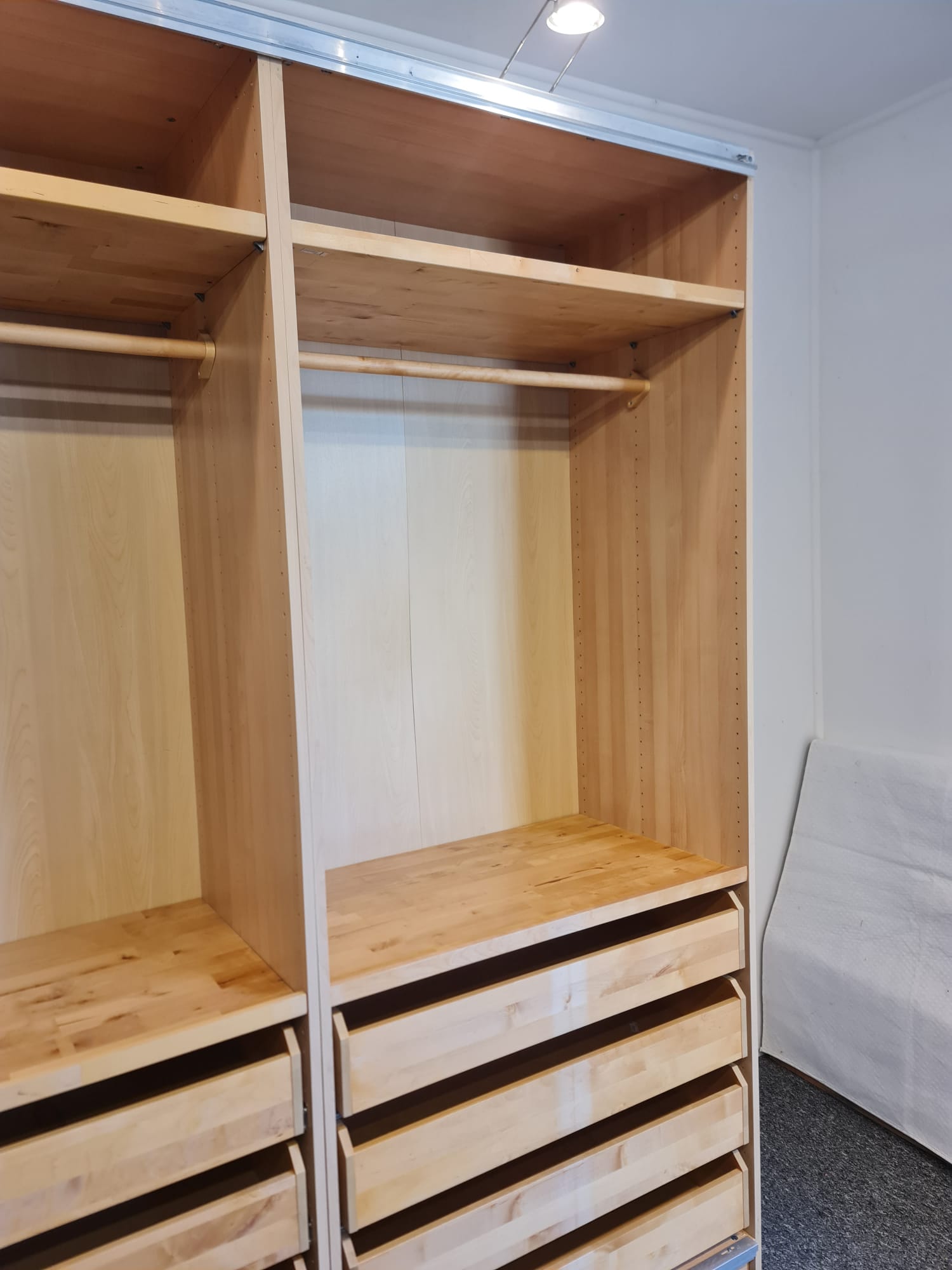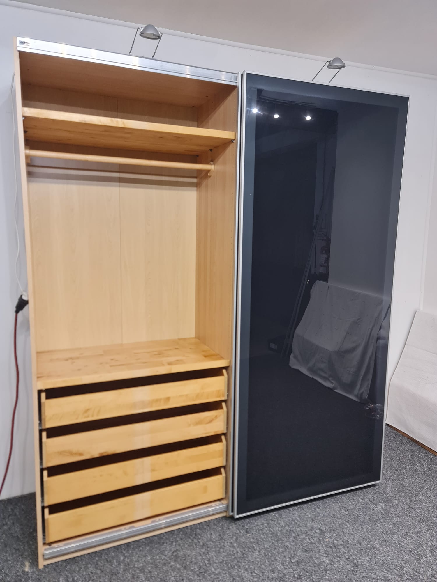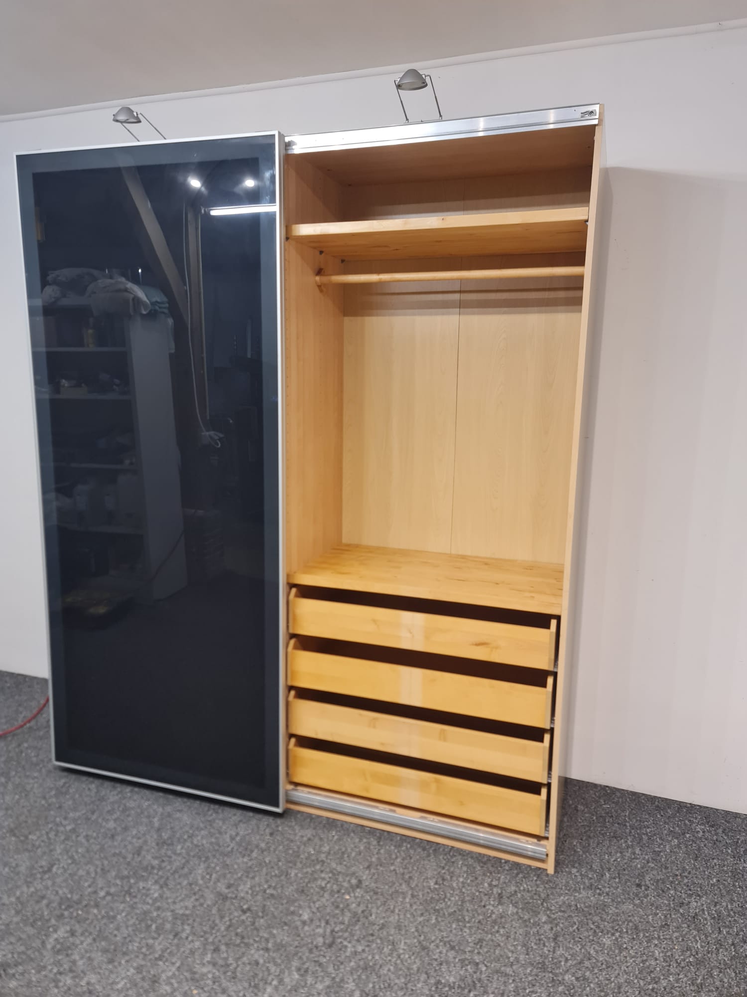 Szafa z popularnej i lubianej serii mebli ikea pax. Wymiary: 2.00m szerokości, wysokość 236cm, 60cm głęboka. Szafa ma swoje drzwi przesuwnych, z dużego kawałka czarnego szkła. Na górze oświetlenie. Korpusy i komponenty są w kolorze drewna. Szafa ma w środku dużo szuflad, półki i drążki na wieszaki. Szafa została fachowo zdemontowana, jest w bardzo dobrym stanie, jest kompletna we wszystkie elementy.