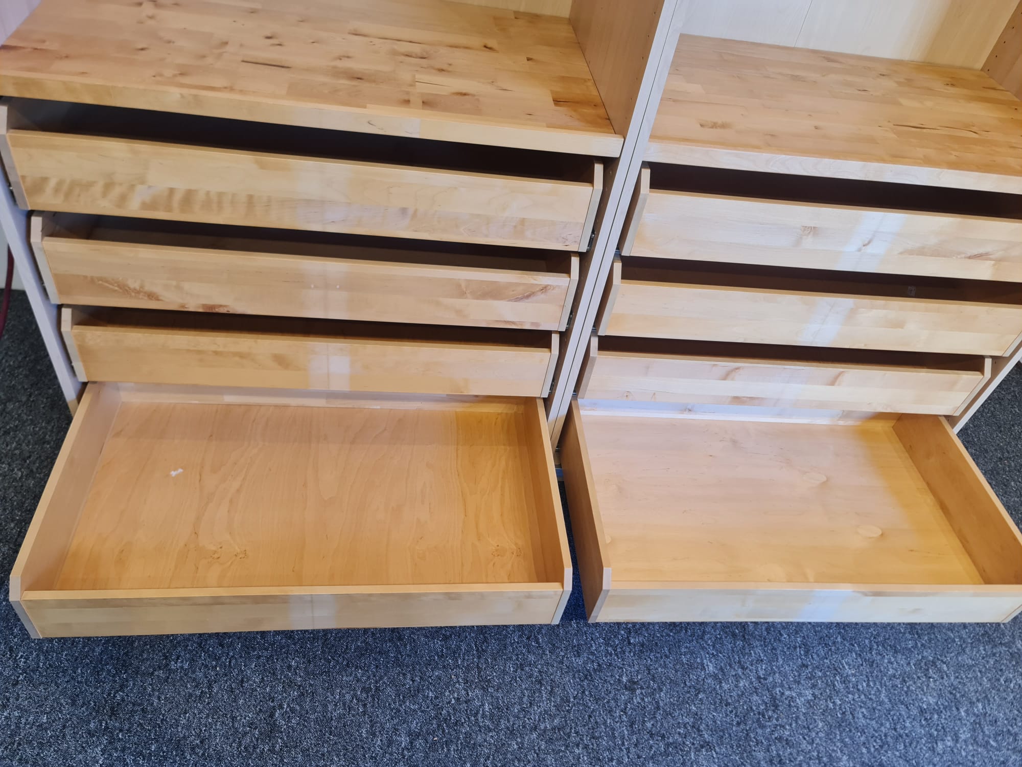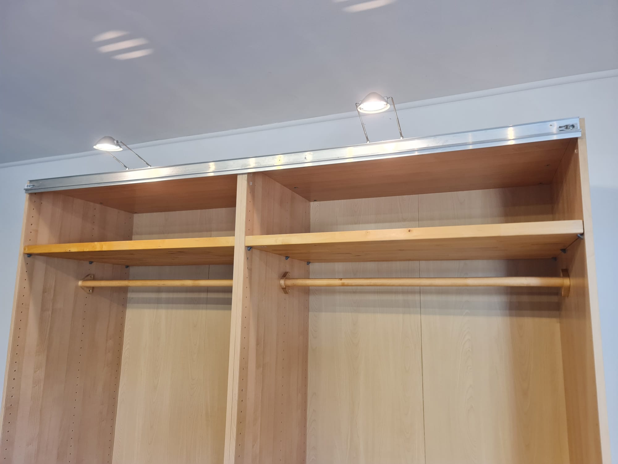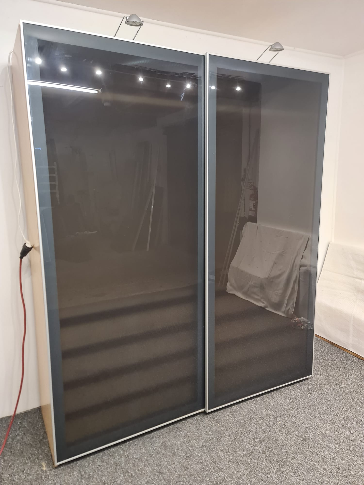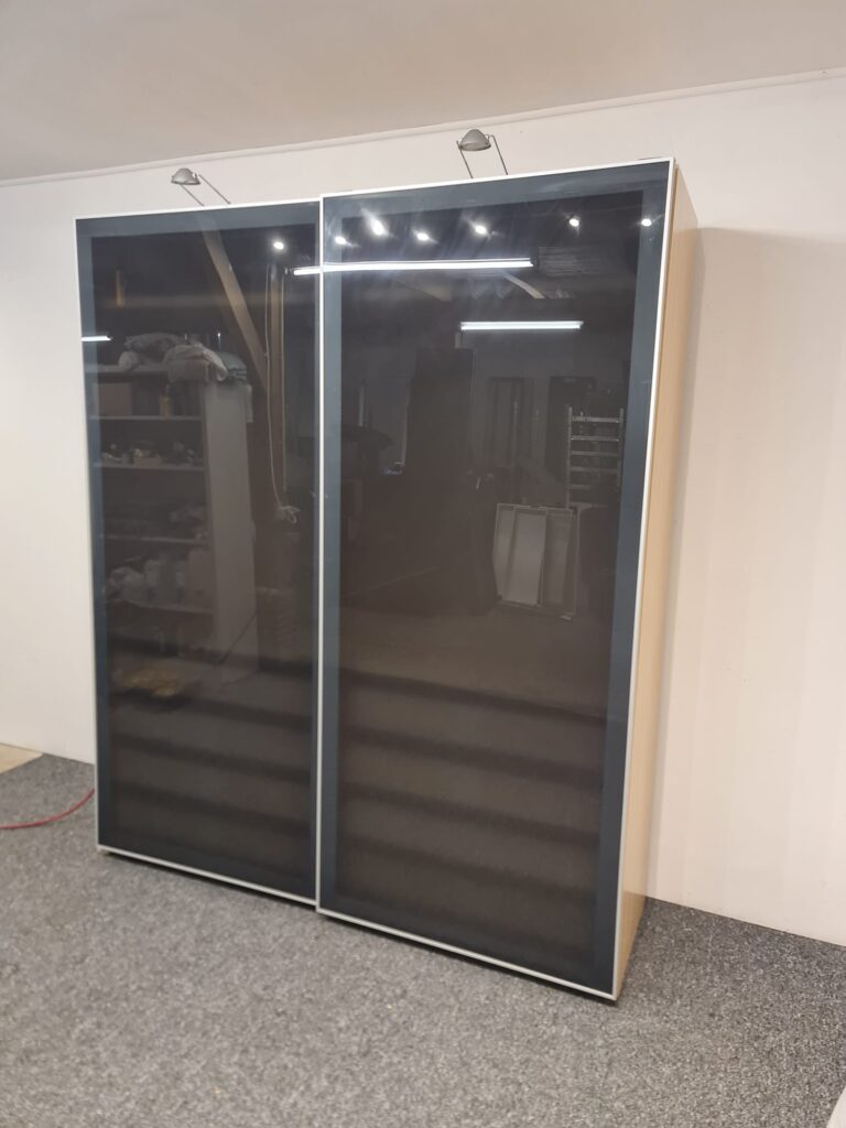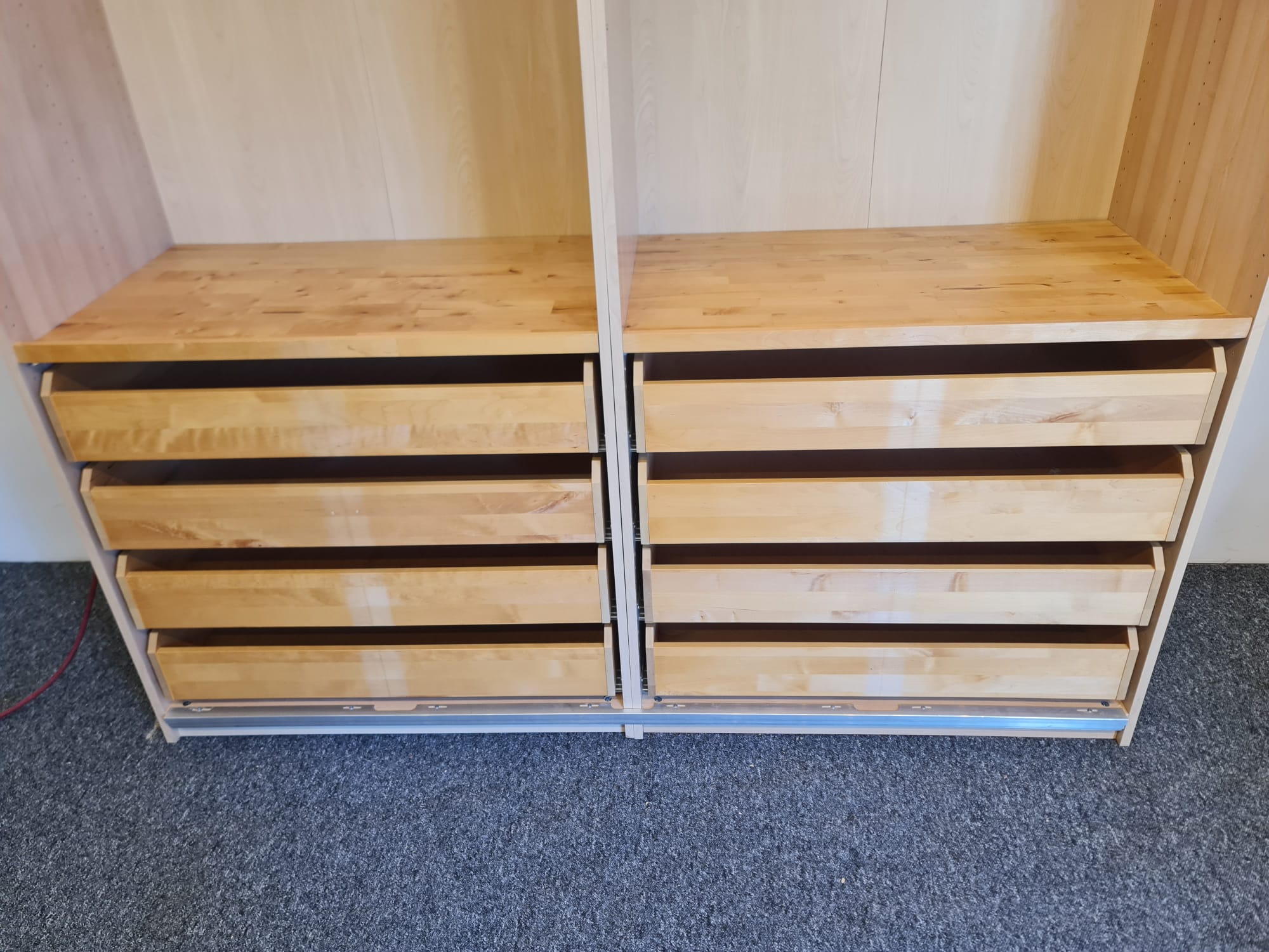 Szafa z popularnej i lubianej serii mebli ikea pax. Wymiary: 2.00m szerokości, wysokość 236cm, 60cm głęboka. Szafa ma swoje drzwi przesuwnych, z dużego kawałka czarnego szkła. Na górze oświetlenie. Korpusy i komponenty są w kolorze drewna. Szafa ma w środku dużo szuflad, półki i drążki na wieszaki. Szafa została fachowo zdemontowana, jest w bardzo dobrym stanie, jest kompletna we wszystkie elementy.