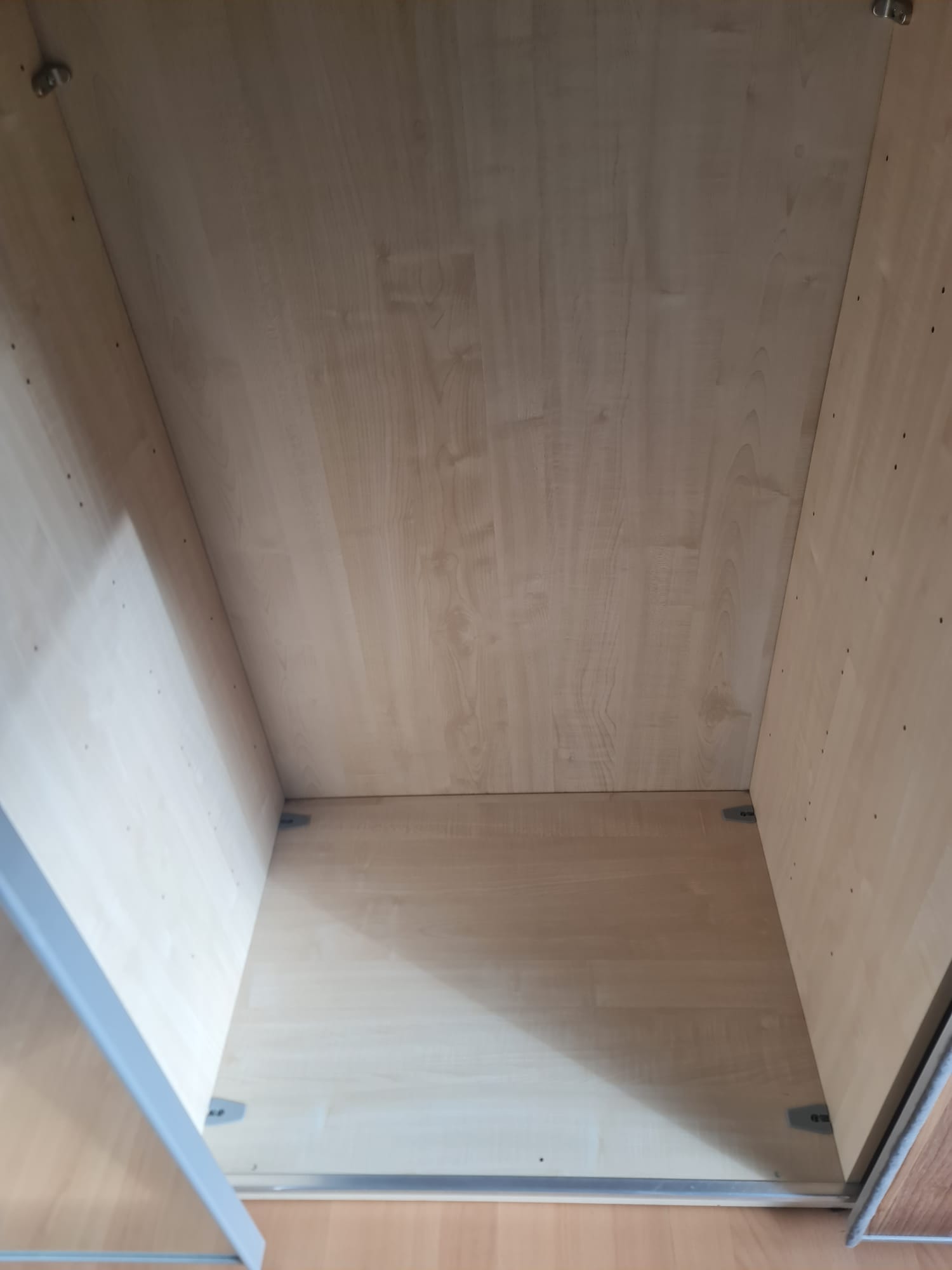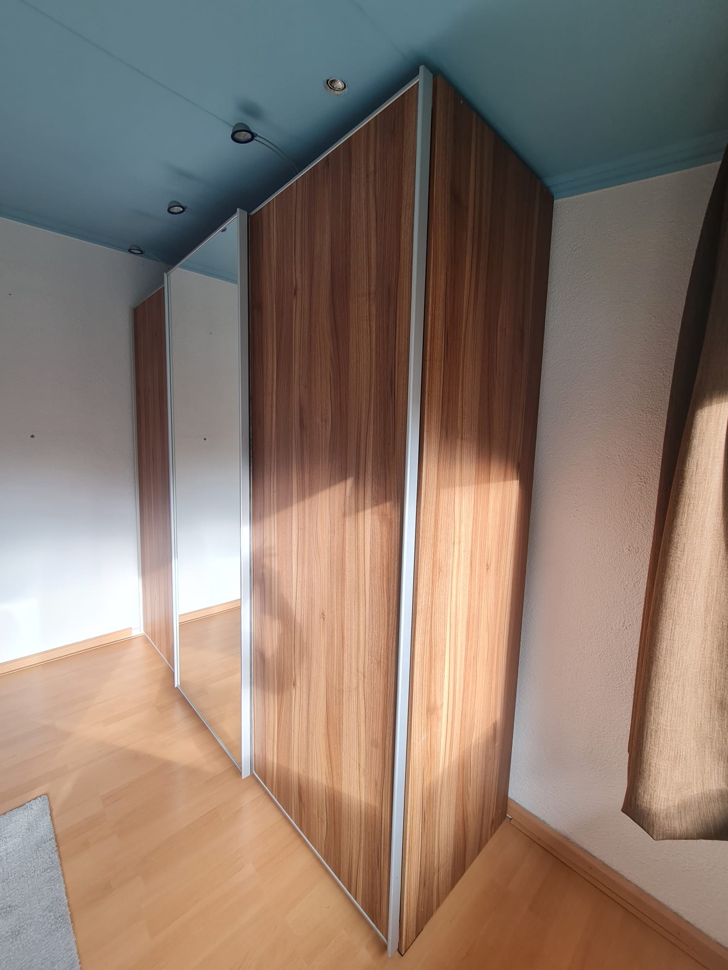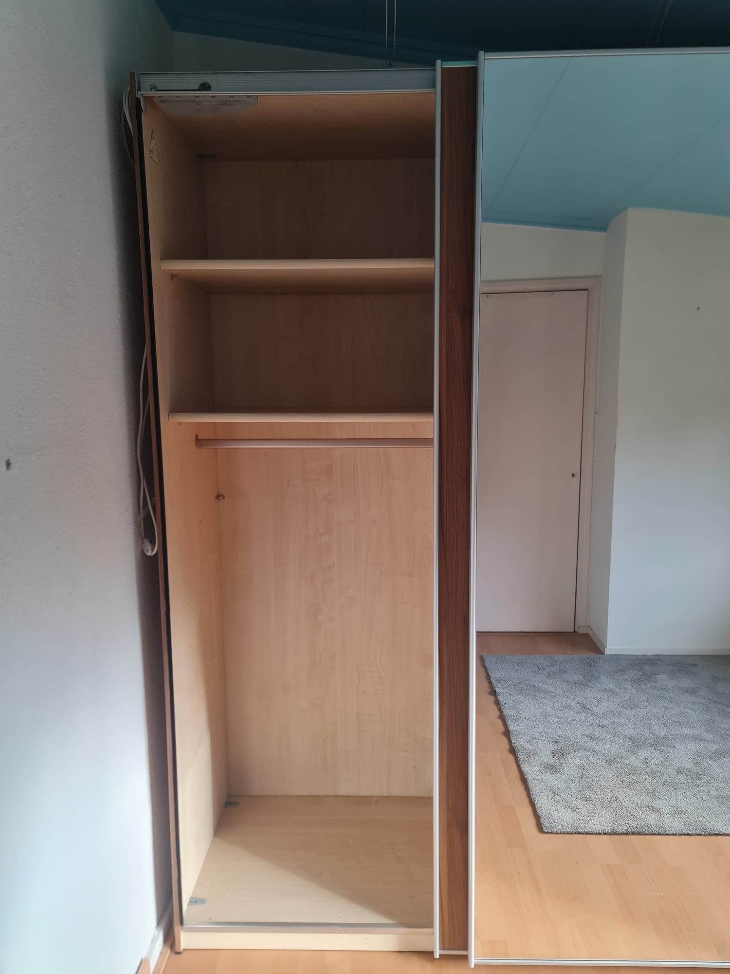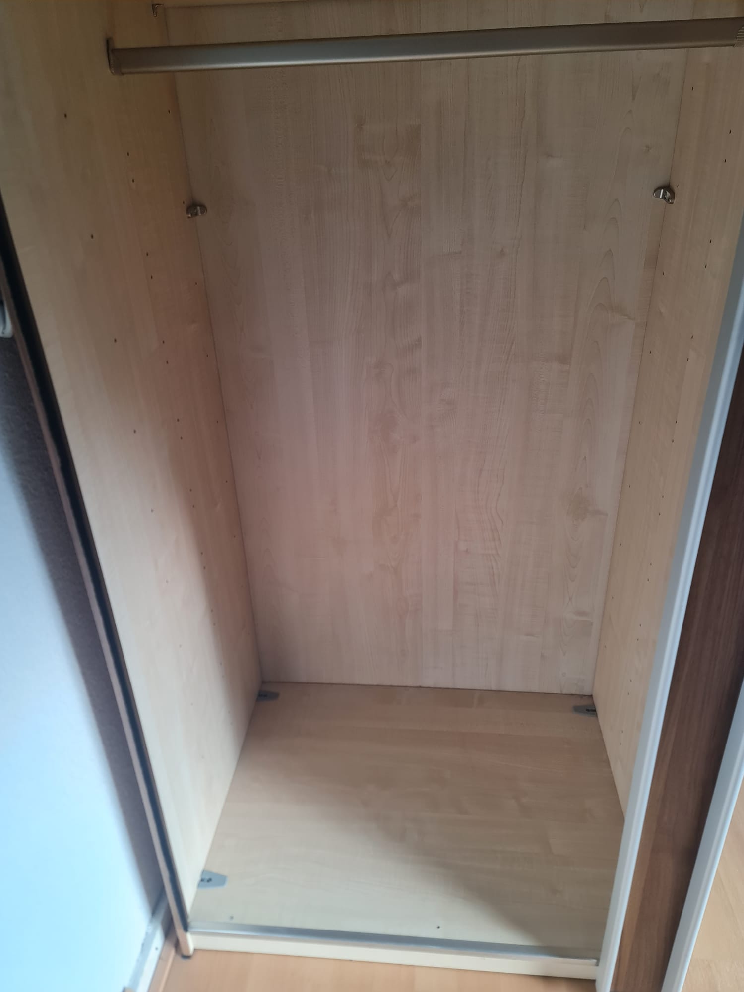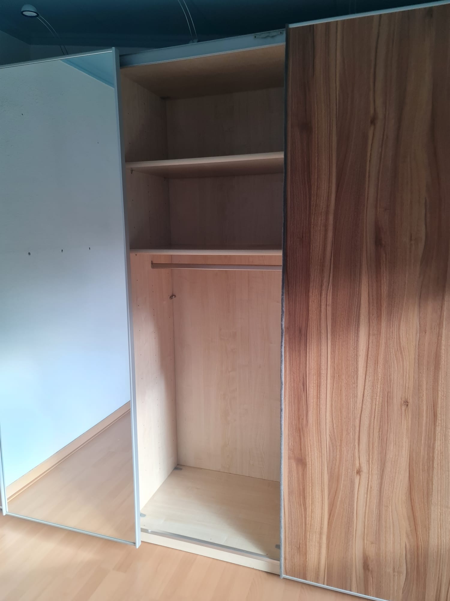 Ładna szafa z drzwiami przesuwnymi z lustrem. Wymiary: 2.40m szerokości, wysokość 223cm, 60cm głęboka. Szafa ma dużo półek oraz drążki na wieszaki. Szafa jest w bardzo dobrym stanie, fachowo zdemontowana bez uszkodzeń i kompletna we wszystkie elementy. Drzwi z systemem cichego zamykania.