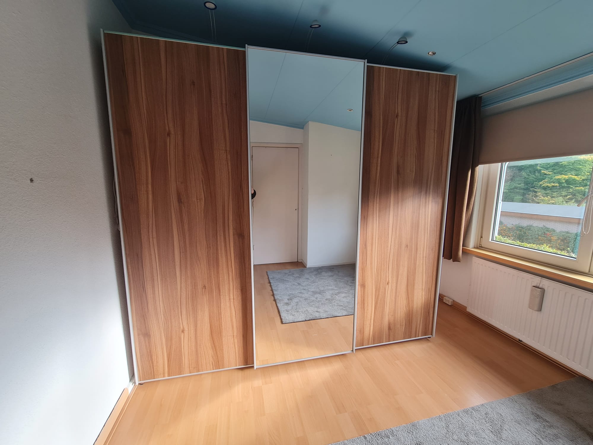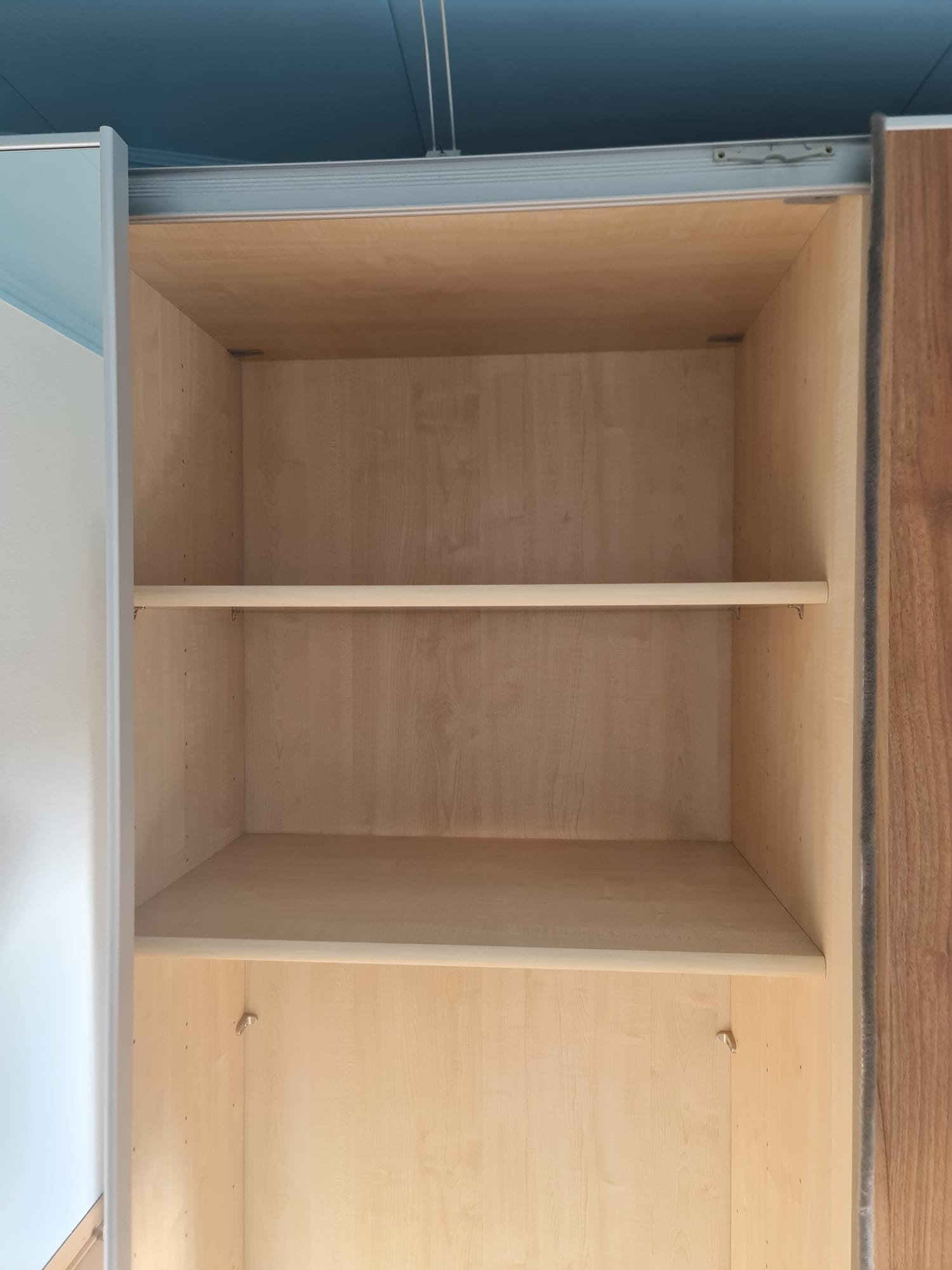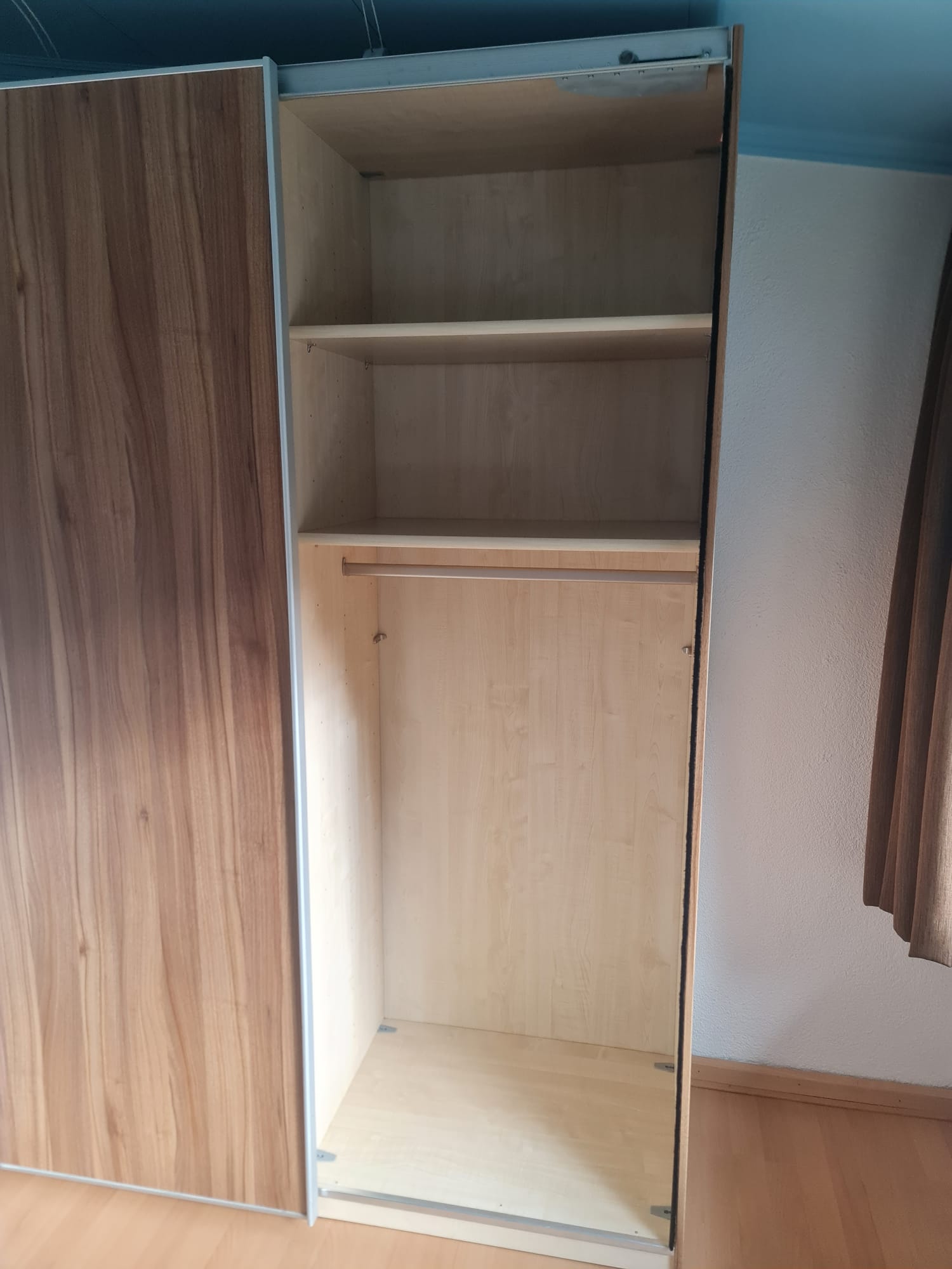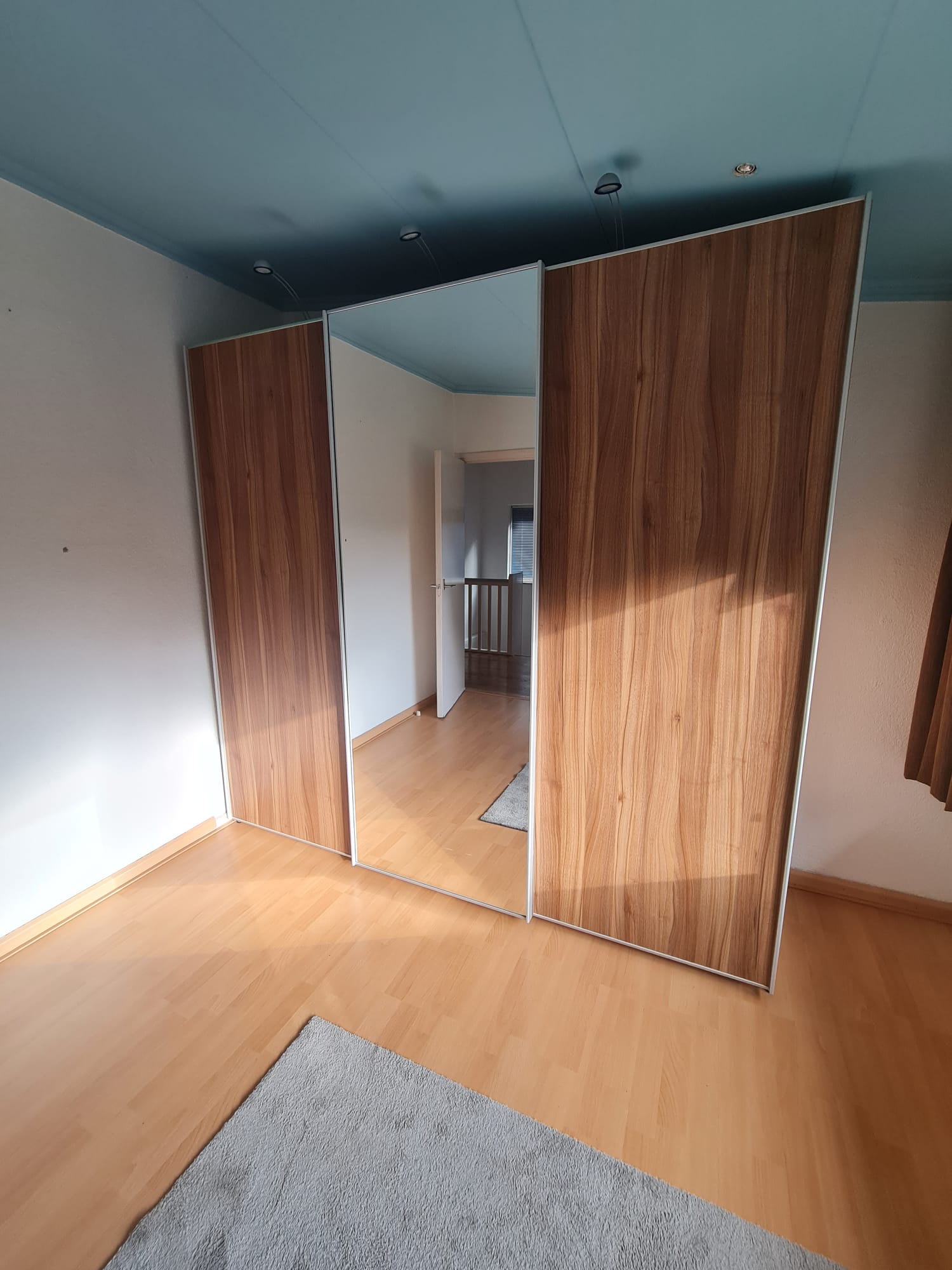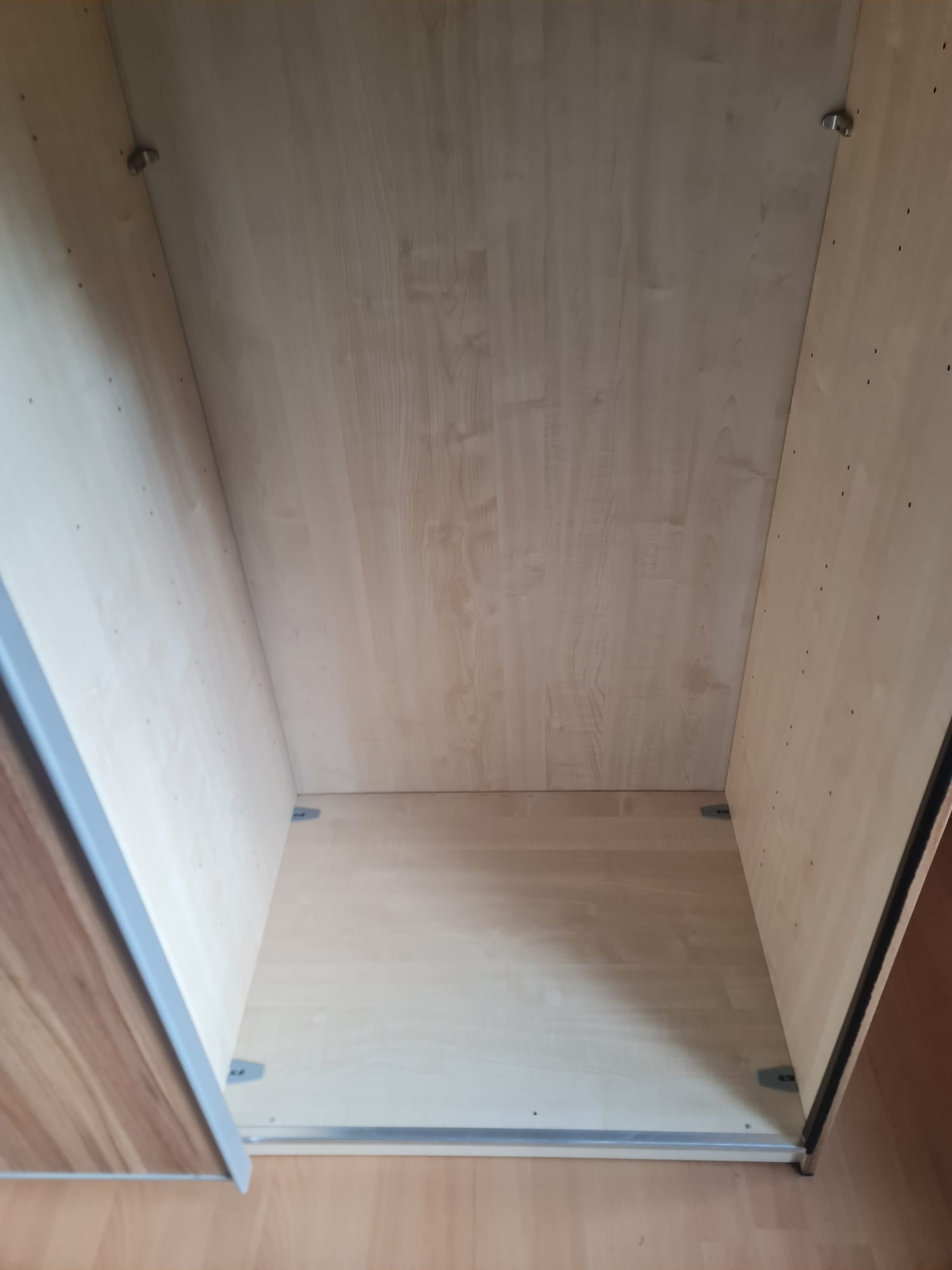 Ładna szafa z drzwiami przesuwnymi z lustrem. Wymiary: 2.40m szerokości, wysokość 223cm, 60cm głęboka. Szafa ma dużo półek oraz drążki na wieszaki. Szafa jest w bardzo dobrym stanie, fachowo zdemontowana bez uszkodzeń i kompletna we wszystkie elementy. Drzwi z systemem cichego zamykania.