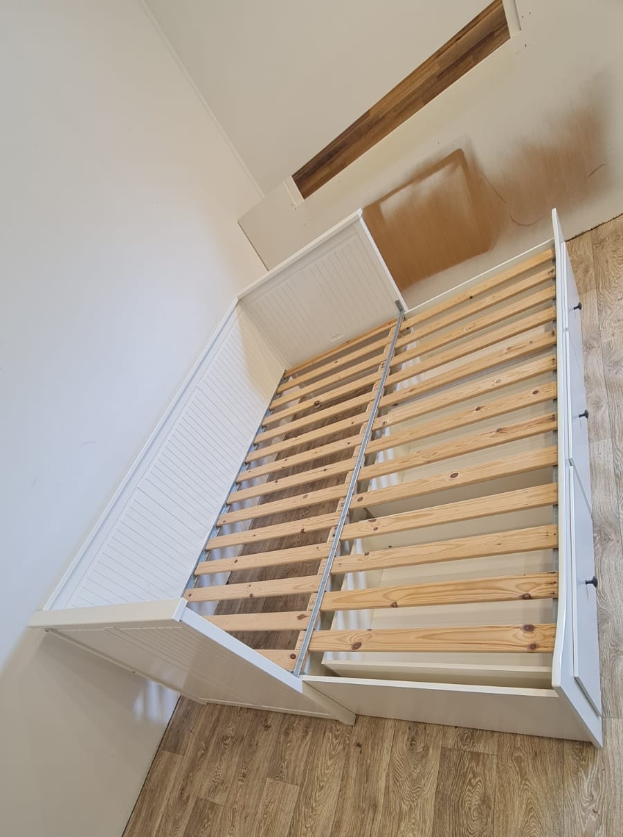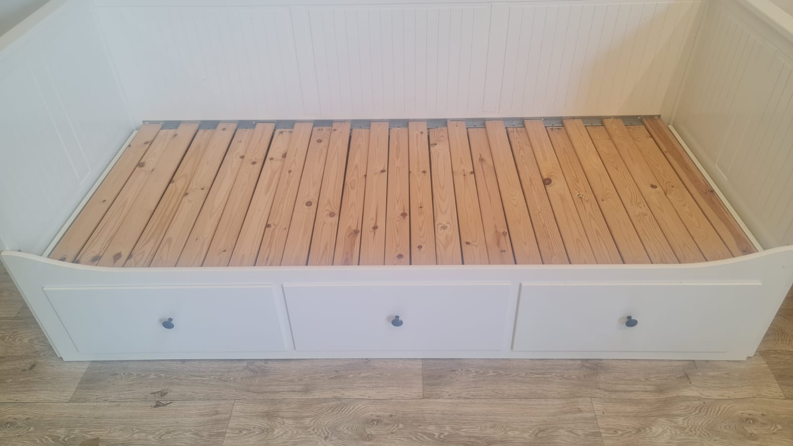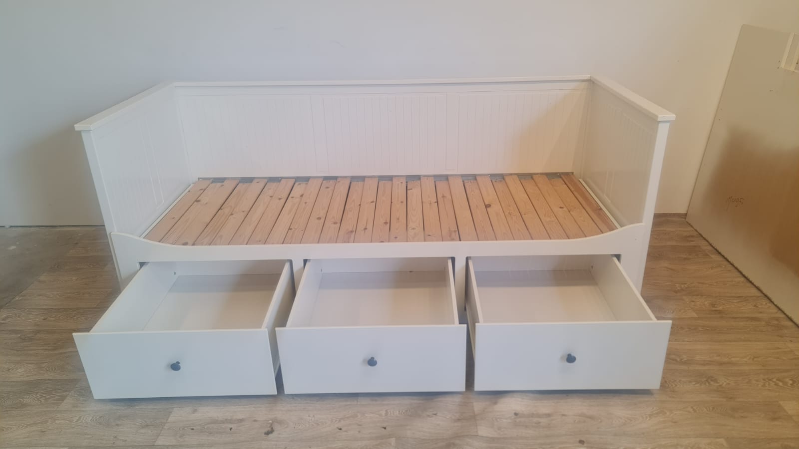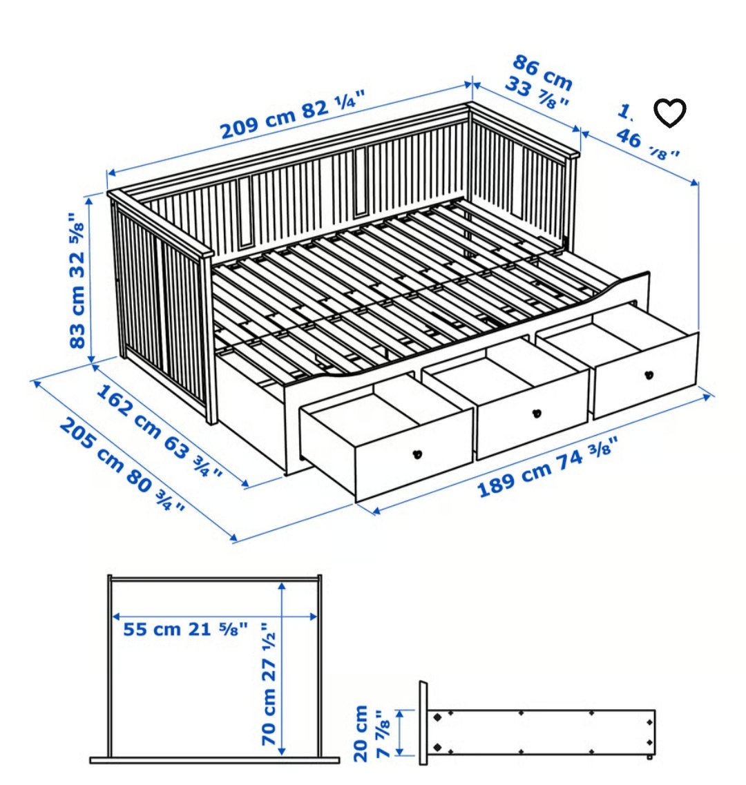 Łóżko Ikea Hemnes. Po złożeniu wygodna sofa, po rozłożeniu duże łóżko. 80×200, rozkłada się do 160×200. 3 duże i pojemne szuflady do przechowywania. Stan bardzo dobry, nie ma uszkodzeń, fachowo zdemontowane i kompletne.